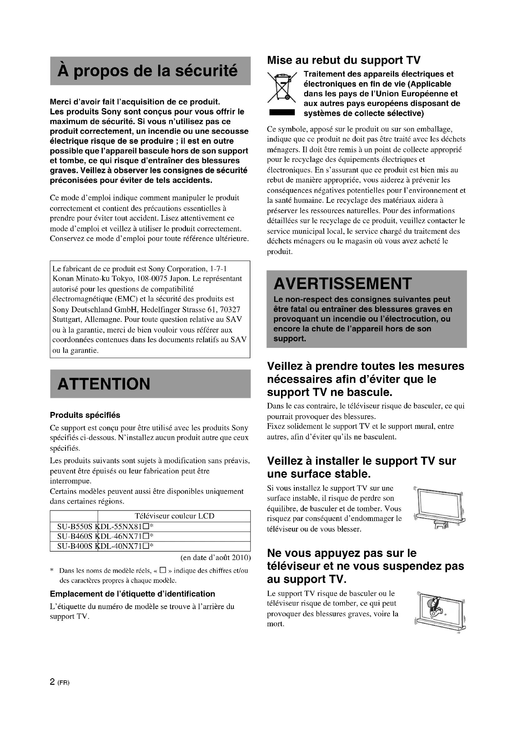 - Dans les noms de modèle réels, « s » indique des chiffres et/ou des caractères propres à chaque modèle. Emplacement de l’étiquette d’identification L’étiquette du numéro de modèle se trouve à l’arrière du support TV. Mise au rebut du support TV Traitement des appareils électriques et électroniques en fin de vie (Applicable dans les pays de l’Union Européenne et aux autres pays européens disposant de systèmes de collecte sélective) Ce symbole, apposé sur le produit ou sur son emballage, indique que ce produit ne doit pas être traité avec les déchets ménagers. Il doit être remis à un point de collecte approprié pour le recyclage des équipements électriques et électroniques. En s’assurant que ce produit est bien mis au rebut de manière appropriée, vous aiderez à prévenir les conséquences négatives potentielles pour l’environnement et la santé humaine. Le recyclage des matériaux aidera à préserver les ressources naturelles. Pour des informations détaillées sur le recyclage de ce produit, veuillez contacter le service municipal local, le service chargé du traitement des déchets ménagers ou le magasin où vous avez acheté le produit. Veillez à prendre toutes les mesures nécessaires afin d’éviter que le support TV ne bascule. Dans le cas contraire, le téléviseur risque de basculer, ce qui pourrait provoquer des blessures. Fixez solidement le support TV et le support mural, entre autres, afin d’éviter qu’ils ne basculent. Veillez à installer le support TV sur une surface stable. Si vous installez le support TV sur une surface instable, il risque de perdre son équilibre, de basculer et de tomber. Vous risquez par conséquent d’endommager le téléviseur ou de vous blesser. Ne vous appuyez pas sur le téléviseur et ne vous suspendez pas au support TV. Le support TV risque de basculer ou le téléviseur risque de tomber, ce qui peut provoquer des blessures graves, voire la mort. À propos de la sécurité Le fabricant de ce produit est Sony Corporation, 1-7-1 Konan Minato-ku Tokyo, 108-0075 Japon. Le représentant autorisé pour les questions de compatibilité électromagnétique (EMC) et la sécurité des produits est Sony Deutschland GmbH, Hedelfinger Strasse 61, 70327 Stuttgart, Allemagne. Pour toute question relative au SAV ou à la garantie, merci de bien vouloir vous référer aux coordonnées contenues dans les documents relatifs au SAV ou la garantie. ATTENTION Téléviseur couleur LCD SU-B550S KDL-55NX81s* SU-B460S KDL-46NX71s* SU-B400S KDL-40NX71s* AVERTISSEMENT Le non-respect des consignes suivantes peut être fatal ou entraîner des blessures graves en provoquant un incendie ou l’électrocution, ou encore la chute de l’appareil hors de son support.3 (FR) Ne couvrez pas les orifices de ventilation du téléviseur. Les orifices de ventilation du téléviseur sont indispensables pour assurer son fonctionnement fiable et le protéger contre toute surchauffe.