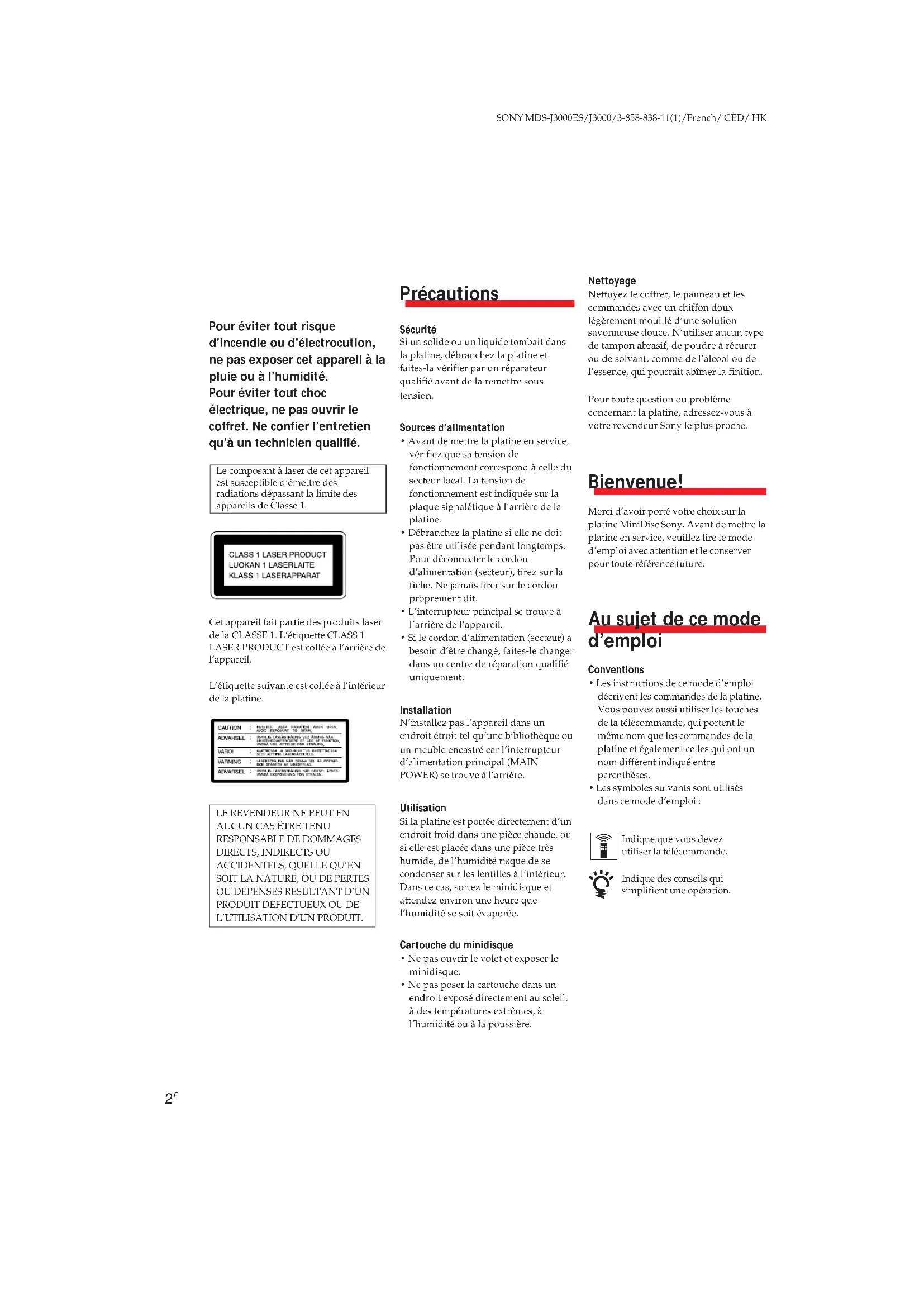 SONY MDS-J3000ES/J3000/3-858-838-11(1)/French/ CED/ HK Précautions SécuritéSi un solide ou un liquide tombait dansla platine, débranchez la platine etfaites-la vérifier par un réparateurqualifié avant de la remettre soustension.Sources d’alimentation• Avant de mettre la platine en service,vérifiez que sa tension defonctionnement correspond à celle dusecteur local. La tension defonctionnement est indiquée sur laplaque signalétique à l’arrière de laplatine.• Débranchez la platine si elle ne doitpas être utilisée pendant longtemps.Pour déconnecter le cordond’alimentation (secteur), tirez sur lafiche. Ne jamais tirer sur le cordonproprement dit.• L’interrupteur principal se trouve àl’arrière de l’appareil.• Si le cordon d’alimentation (secteur) abesoin d’être changé, faites-le changerdans un centre de réparation qualifiéuniquement.InstallationN’installez pas l’appareil dans unendroit étroit tel qu’une bibliothèque ouun meuble encastré car l’interrupteurd’alimentation principal (MAINPOWER) se trouve à l’arrière.UtilisationSi la platine est portée directement d’unendroit froid dans une pièce chaude, ousi elle est placée dans une pièce trèshumide, de l’humidité risque de secondenser sur les lentilles à l’intérieur.Dans ce cas, sortez le minidisque etattendez environ une heure quel’humidité se soit évaporée.Cartouche du minidisque• Ne pas ouvrir le volet et exposer leminidisque.• Ne pas poser la cartouche dans unendroit exposé directement au soleil,à des températures extrêmes, àl’humidité ou à la poussière.NettoyageNettoyez le coffret, le panneau et lescommandes avec un chiffon douxlégèrement mouillé d’une solutionsavonneuse douce. N’utiliser aucun typede tampon abrasif, de poudre à récurerou de solvant, comme de l’alcool ou del’essence, qui pourrait abîmer la finition.Pour toute question ou problèmeconcernant la platine, adressez-vous àvotre revendeur Sony le plus proche. Bienvenue! Merci d’avoir porté votre choix sur laplatine MiniDisc Sony. Avant de mettre laplatine en service, veuillez lire le moded’emploi avec attention et le conserverpour toute référence future. Au sujet de ce mode d’emploi Conventions• Les instructions de ce mode d’emploidécrivent les commandes de la platine.Vous pouvez aussi utiliser les touchesde la télécommande, qui portent lemême nom que les commandes de laplatine et également celles qui ont unnom différent indiqué entreparenthèses.• Les symboles suivants sont utilisésdans ce mode d’emploi : Indique que vous devezutiliser la télécommande. Indique des conseils quisimplifient une opération. AVERTISSEMENT Pour éviter tout risque d’incendie ou d’électrocution, ne pas exposer cet appareil à la pluie ou à l’humidité. Pour éviter tout choc électrique, ne pas ouvrir le coffret. Ne confier l’entretien qu’à un technicien qualifié. Le composant à laser de cet appareilest susceptible d’émettre desradiations dépassant la limite desappareils de Classe 1.Cet appareil fait partie des produits laserde la CLASSE 1. L’étiquette CLASS 1LASER PRODUCT est collée à l’arrière del’appareil.L’étiquette suivante est collée à l’intérieurde la platine.LE REVENDEUR NE PEUT ENAUCUN CAS ÊTRE TENURESPONSABLE DE DOMMAGESDIRECTS, INDIRECTS OUACCIDENTELS, QUELLE QU’ENSOIT LA NATURE, OU DE PERTESOU DEPENSES RESULTANT D’UNPRODUIT DEFECTUEUX OU DEL’UTILISATION D’UN PRODUIT.3