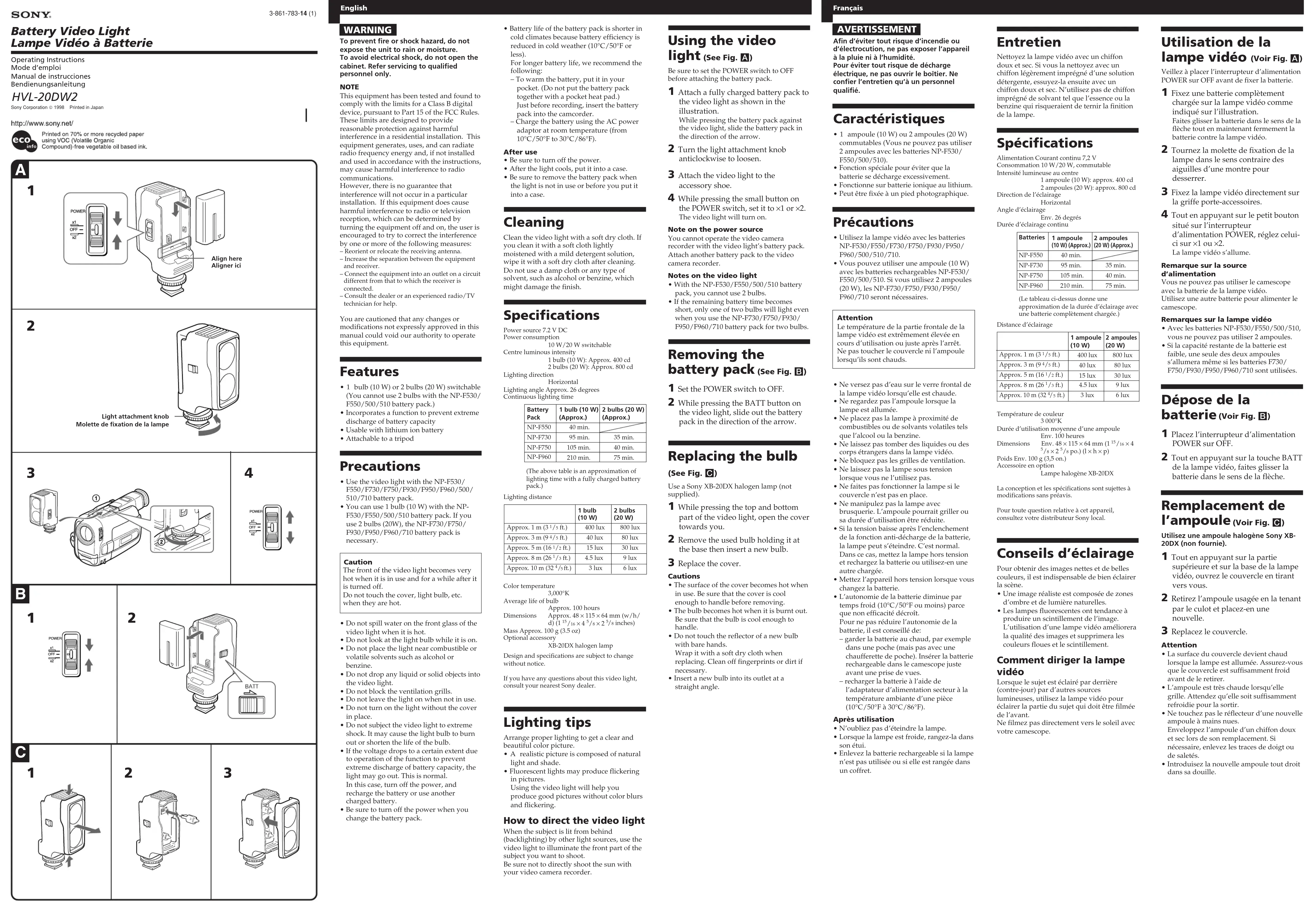 - 1 ampoule (10 W) ou 2 ampoules (20 W)commutables (Vous ne pouvez pas utiliser2 ampoules avec les batteries NP-F530/F550/500/510).• Fonction spéciale pour éviter que labatterie se décharge excessivement.• Fonctionne sur batterie ionique au lithium.• Peut être fixée à un pied photographique. Précautions