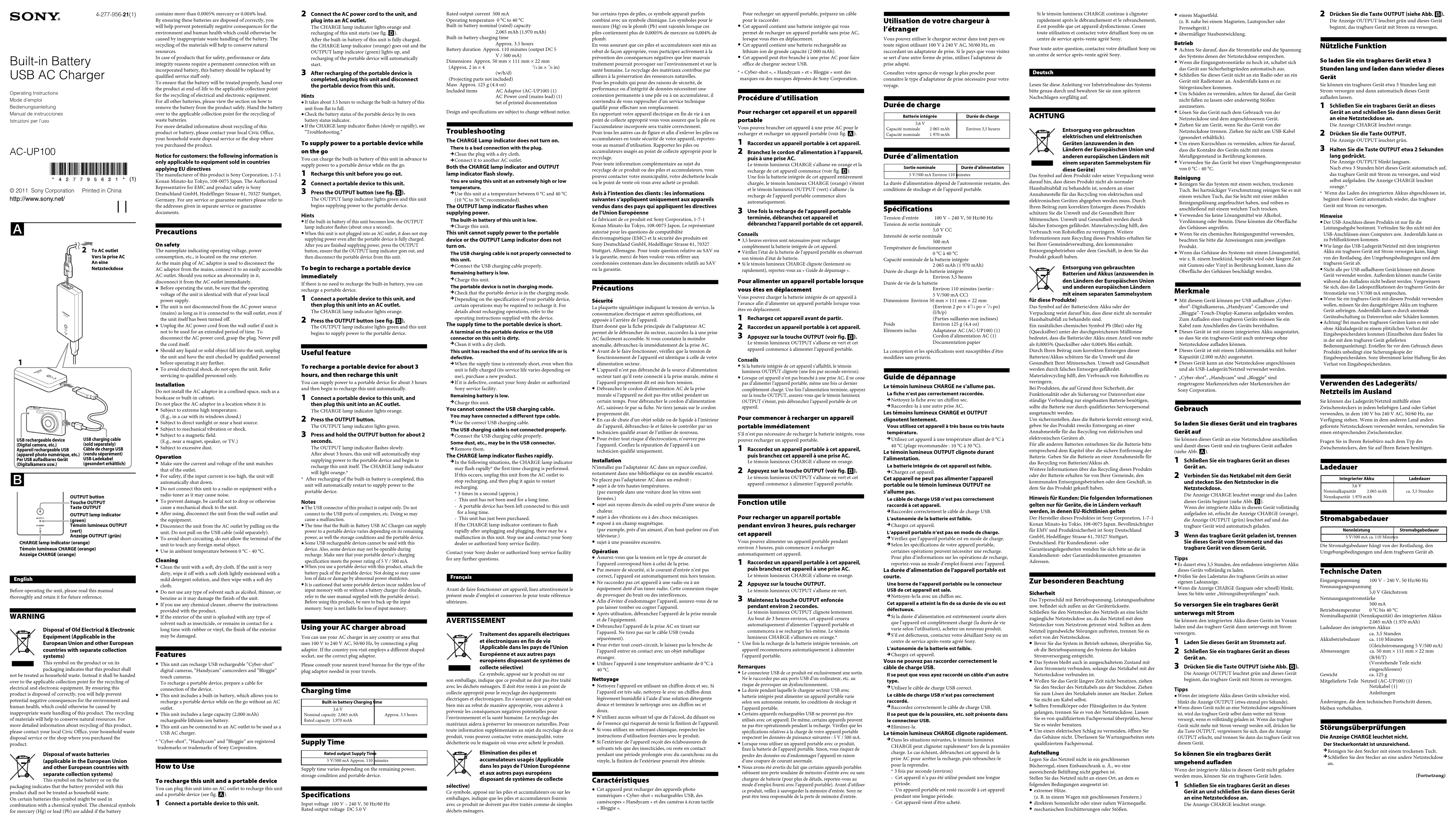 po) (l/h/p) (Parties saillantes non incluses)Poids Environ 125 g (4,4 oz) Eléments inclus Adaptateur AC (AC-UP100) (1) Cordon d’alimentation AC (1) Documentation papierLa conception et les spécifications sont susceptibles d’être modifiées sans préavis. Guide de dépannage Le témoin lumineux CHARGE ne s’allume pas.La fiche n’est pas correctement raccordée.Nettoyez la fiche avec un chiffon sec.Raccordez-la à une autre prise AC.Les témoins lumineux CHARGE et OUTPUT clignotent lentement.Vous utilisez cet appareil à très basse ou très haute température.Utilisez cet appareil à une température allant de 0 °C à 40 °C (plage recommandée : 10 °C à 30 °C).Le témoin lumineux OUTPUT clignote durant l’alimentation.La batterie intégrée de cet appareil est faible.Chargez cet appareil.Cet appareil ne peut pas alimenter l’appareil portable ou le témoin lumineux OUTPUT ne s’allume pas.Le câble de charge USB n’est pas correctement raccordé à cet appareil.Raccordez correctement le câble de charge USB.L’autonomie de la batterie est faible.Chargez cet appareil.L’appareil portable n’est pas en mode de charge.Vérifiez que l’appareil portable est en mode de charge.Selon les spécifications de votre appareil portable, certaines opérations peuvent nécessiter une recharge. Pour plus d’informations sur les opérations de recharge, reportez-vous au mode d’emploi fourni avec l’appareil.La durée d’alimentation de l’appareil portable est courte.Une borne de l’appareil portable ou le connecteur USB de cet appareil est sale.Nettoyez-le/la avec un chiffon sec.Cet appareil a atteint la fin de sa durée de vie ou est défectueux.Si la durée d’alimentation est extrêmement courte alors que l’appareil est complètement chargé (la durée de vie varie selon l’utilisation), achetez un nouveau produit.S’il est défectueux, contactez votre détaillant Sony ou un centre de service après-vente agréé Sony.L’autonomie de la batterie est faible.Chargez cet appareil.Vous ne pouvez pas raccorder correctement le câble de charge USB.Il se peut que vous ayez raccordé un câble d’un autre type.Utilisez le câble de charge USB correct.Le câble de charge USB n’est pas correctement raccordé.Raccordez correctement le câble de charge USB.Il se peut que de la poussière, etc. soit présente dans le connecteur USB.Eliminez-la.Le témoin lumineux CHARGE clignote rapidement.Dans les situations suivantes, le témoin lumineux CHARGE peut clignoter rapidement* lors de la première charge. Le cas échéant, débranchez cet appareil de la prise AC pour arrêter la recharge, puis rebranchez-le pour la reprendre. * 3 fois par seconde (environ)- Cet appareil n’a pas été utilisé pendant une longue période.- Un appareil portable est resté raccordé à cet appareil pendant une longue période.- Cet appareil vient d’être acheté.