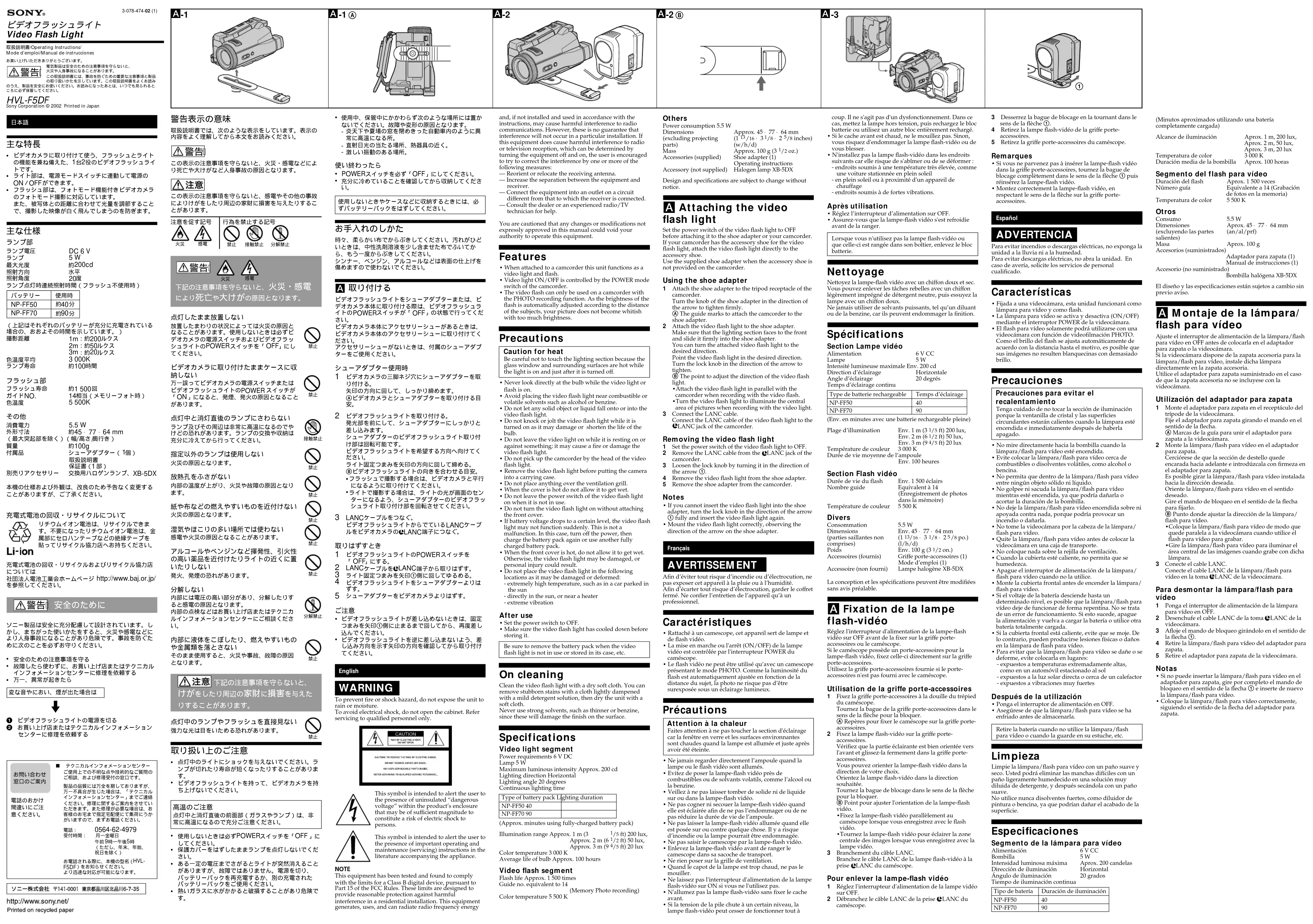 - Rattaché à un camescope, cet appareil sert de lampe etde flash vidéo.• La mise en marche ou l'arrêt (ON/OFF) de la lampevidéo est contrôlée par l'interrupteur POWER ducaméscope.• Le flash vidéo ne peut être utilisé qu’avec un camescopeprésentant le mode PHOTO. Comme la luminosité duflash est automatiquement ajustée en fonction de ladistance du sujet, la photo ne risque pas d’êtresurexposée sous un éclairage lumineux. Précautions Attention à la chaleurFaites attention à ne pas toucher la section d'éclairagecar la fenêtre en verre et les surfaces environnantessont chaudes quand la lampe est allumée et juste aprèsavoir été éteinte.• Ne jamais regarder directement l’ampoule quand lalampe ou le flash vidéo sont allumés.• Evitez de poser la lampe-flash vidéo près decombustibles ou de solvants volatils, comme l’alcool oula benzine.• Veillez à ne pas laisser tomber de solide ni de liquidesur ou dans la lampe-flash vidéo.• Ne pas cogner ni secouer la lampe-flash vidéo quandelle est éclairée afin de ne pas l’endommager ou de nepas réduire la durée de vie de l’ampoule.• Ne pas laisser la lampe-flash vidéo allumée quand elleest posée sur ou contre quelque chose. Il y a risqued’incendie ou la lampe pourrait être endommagée.• Ne pas saisir le camescope par la lampe-flash vidéo.• Enlevez la lampe-flash vidéo avant de ranger lecamescope dans sa sacoche de transport.• Ne rien poser sur la grille de ventilation.• Quand le capot de la lampe est trop chaud, ne pas lemouiller.• Ne laissez pas l'interrupteur d'alimentation de la lampeflash-vidéo sur ON si vous ne l'utilisez pas.• N'allumez pas la lampe flash-vidéo sans fixer le cacheavant.• Si la tension de la pile chute à un certain niveau, lalampe flash-vidéo peut cesser de fonctionner tout àcoup. Il ne s'agit pas d'un dysfonctionnement. Dans cecas, mettez la lampe hors tension, puis rechargez le blocbatterie ou utilisez un autre bloc entièrement rechargé.• Si le cache avant est chaud, ne le mouillez pas. Sinon,vous risquez d'endommager la lampe flash-vidéo ou devous blesser.• N'installez pas la lampe flash-vidéo dans les endroitssuivants car elle risque de s'abîmer ou de se déformer :- endroits soumis à une température très élevée, commeune voiture stationnée en plein soleil- en plein soleil ou à proximité d'un appareil dechauffage- endroits soumis à de fortes vibrations.Après utilisation• Réglez l’interrupteur d’alimentation sur OFF.• Assurez-vous que la lampe-flash vidéo s'est refroidieavant de la ranger.Lorsque vous n'utilisez pas la lampe flash-vidéo ouque celle-ci est rangée dans son boîtier, enlevez le blocbatterie. Nettoyage Nettoyez la lampe-flash vidéo avec un chiffon doux et sec.Vous pouvez enlever les tâches rebelles avec un chiffonlégèrement imprégné de détergent neutre, puis essuyez lalampe avec un chiffon doux.Ne jamais utiliser de solvants puissants, tel qu’un diluantou de la benzine, car ils peuvent endommager la finition. Spécifications Section Lampe vidéoAlimentation 6 V CCLampe 5 WIntensité lumineuse maximale Env. 200 cdDirection d’éclairage HorizontaleAngle d’éclairage 20 degrésTemps d’éclairage continuType de batterie rechargeable Temps d’éclairageNP-FF50 40NP-FF70 90(Env. en minutes avec une batterie rechargeable pleine)Plage d’illumination Env. 1 m (3 /5 ft) 200 lux,Env. 2 m (6 /2 ft) 50 lux,Env. 3 m (9 /5 ft) 20 luxTempérature de couleur 3 000 KDurée de vie moyenne de l’ampouleEnv. 100 heuresSection Flash vidéoDurée de vie du flash Env. 1 500 éclairsNombre guide Equivalent à 14(Enregistrement de photosdans la mémoire)Température de couleur 5 500 KDiversConsommation 5.5 W Dimensions Env. 45 × 77 × 64 mm (parties saillantes non (1 /16 × 3 /8 × 2 /8 po.)comprises) (l/h/d)Poids Env. 100 g (3 /2 on.)Accessoires (fournis) Griffe porte-accessoires (1)Mode d’emploi (1)Accessoire (non fourni) Lampe halogène XB-5DXLa conception et les spécifications peuvent être modifiéessans avis préalable. A Fixation de la lampe flash-vidéo Réglez l'interrupteur d'alimentation de la lampe-flashvidéo sur OFF avant de la fixer sur la griffe porte-accessoires ou le caméscope.Si le caméscope possède un porte-accessoires pour lalampe-flash vidéo, fixez celle-ci directement sur la griffeporte-accessoires.Utilisez la griffe porte-accessoires fournie si le porte-accessoires n'est pas fourni avec le caméscope.Utilisation de la griffe porte-accessoires1 Fixez la griffe porte-accessoires à la douille du trépieddu caméscope.Tournez la bague de la griffe porte-accessoires dans lesens de la flèche pour la bloquer.A Repères pour fixer le caméscope sur la griffe porte-accessoires.2 Fixez la lampe flash-vidéo sur la griffe porte-accessoires.Vérifiez que la partie éclairante est bien orientée versl'avant et glissez-la fermement dans la griffe porte-accessoires.Vous pouvez orienter la lampe-flash vidéo dans ladirection de votre choix.Orientez la lampe flash-vidéo dans la directionsouhaitée.Tournez la bague de blocage dans le sens de la flèchepour la bloquer.B Point pour ajuster l'orientation de la lampe-flashvidéo.•Fixez la lampe-flash vidéo parallèlement aucaméscope lorsque vous enregistrez avec le flashvidéo.•Tournez la lampe-flash vidéo pour éclairer la zonecentrale des images lorsque vous enregistrez avec lalampe vidéo.3 Branchement du câble LANC.Branchez le câble LANC de la lampe flash-vidéo à laprise LANC du caméscope.Pour enlever la lampe-flash vidéo 1 Réglez l'interrupteur d'alimentation de la lampe vidéo sur OFF.2 Débranchez le câble LANC de la prise LANC ducaméscope.Español ADVERTENCIA Para evitar incendios o descargas eléctricas, no exponga launidad a la lluvia ni a la humedad.Para evitar descargas eléctricas, no abra la unidad. Encaso de avería, solicite los servicios de personalcualificado. Características