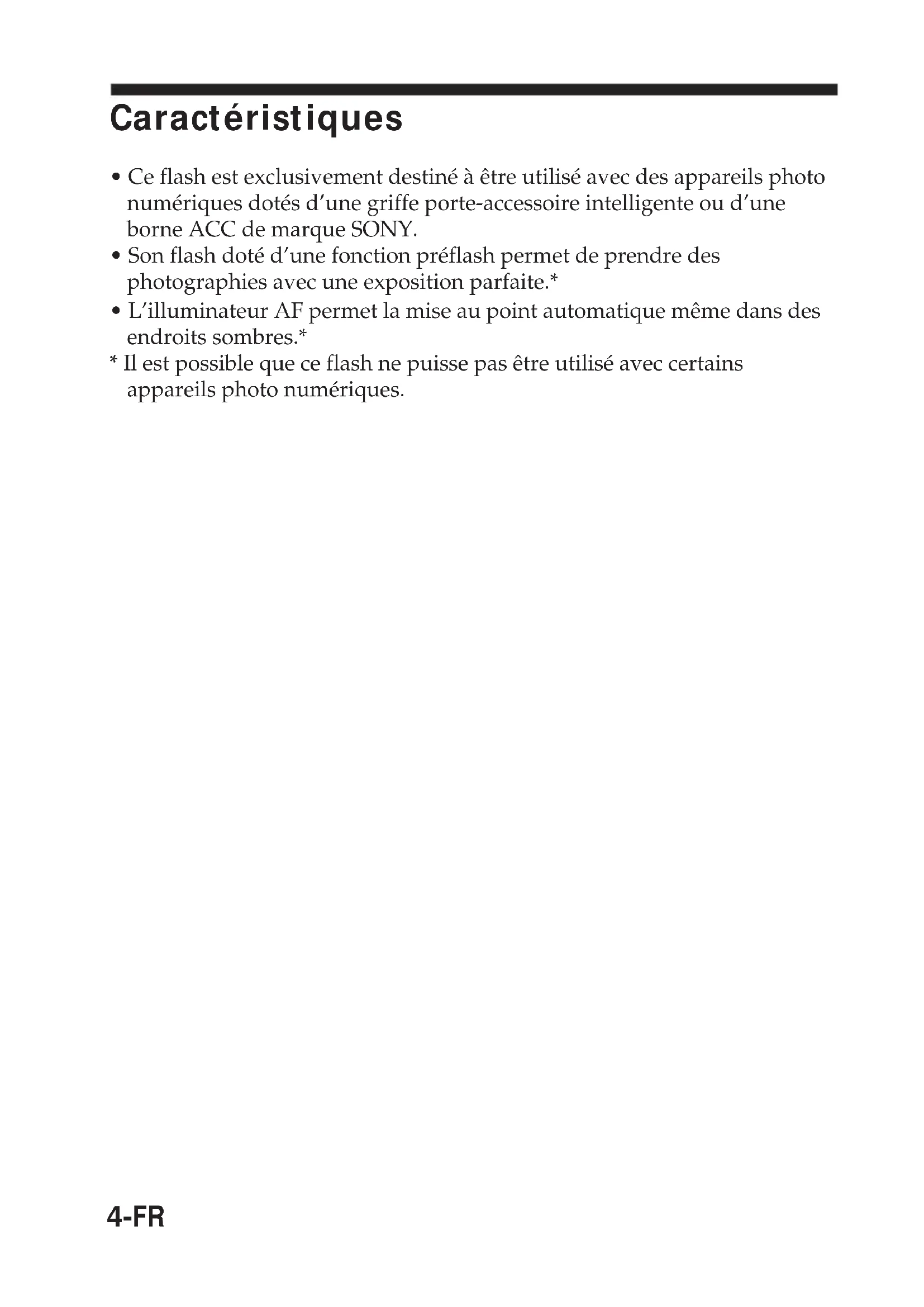 - Ce flash est exclusivement destiné à être utilisé avec des appareils photo numériques dotés d’une griffe porte-accessoire intelligente ou d’une borne ACC de marque SONY.