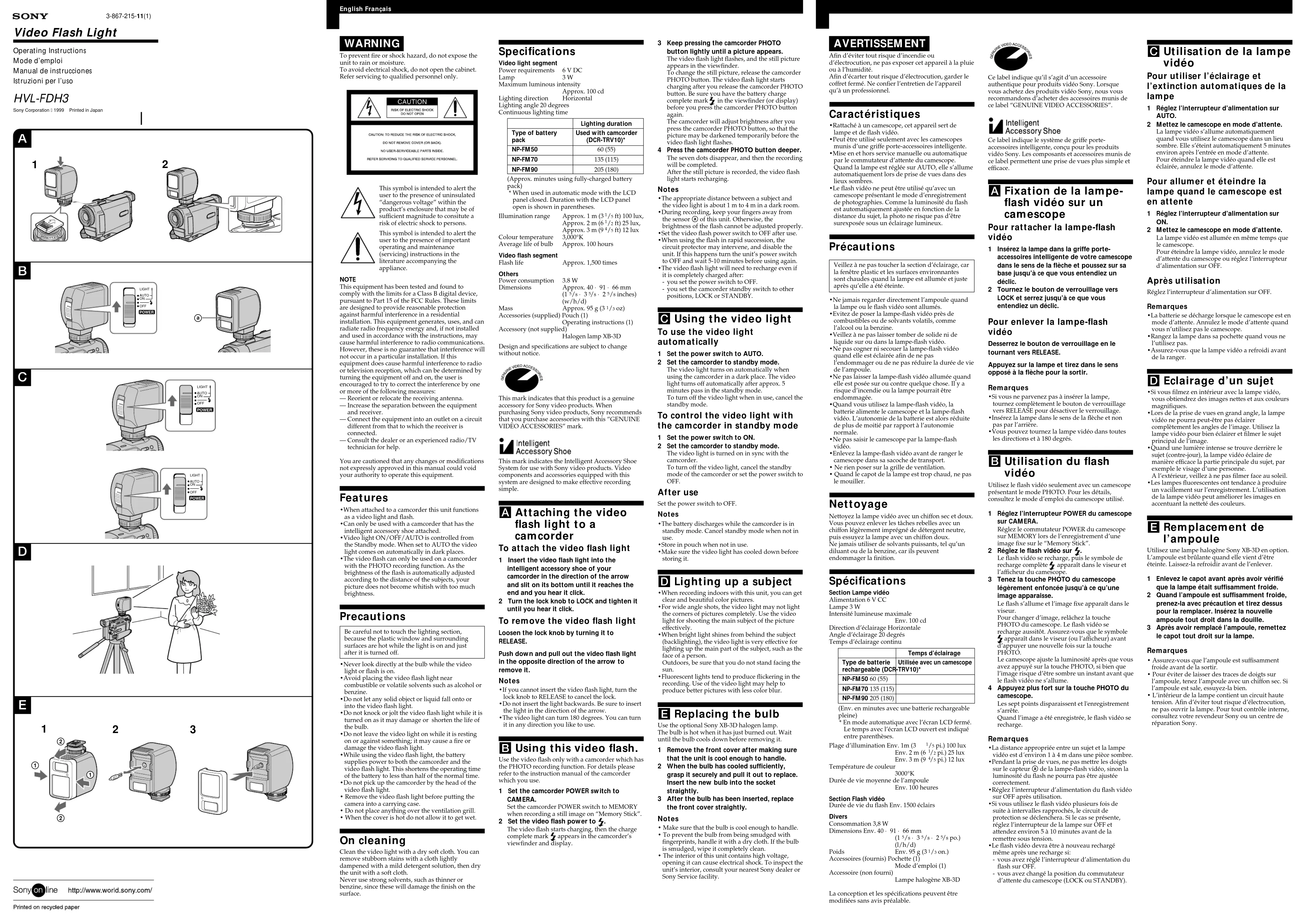- Si vous filmez en intérieur avec la lampe vidéo,vous obtiendrez des images nettes et aux couleursmagnifiques.•Lors de la prise de vues en grand angle, la lampevidéo ne pourra peut-être pas éclairercomplètement les angles de l’image. Utilisez lalampe vidéo pour bien éclairer et filmer le sujetprincipal de l’image.•Quand une lumière intense se trouve derrière lesujet (contre-jour), la lampe vidéo éclaire demanière efficace la partie principale du sujet, parexemple le visage d’une personne.A l’extérieur, veillez à ne pas filmer face au soleil.•Les lampes fluorescentes ont tendance à produireun vacillement sur l’enregistrement. L’utilisationde la lampe vidéo peut améliorer les images enaccentuant la netteté des couleurs. E Remplacement de l’ampoule Utilisez une lampe halogène Sony XB-3D en option.L’ampoule est brûlante quand elle vient d’êtreéteinte. Laissez-la refroidir avant de l’enlever.1 Enlevez le capot avant après avoir vérifiéque la lampe était suffisamment froide.2 Quand l’ampoule est suffisamment froide,prenez-la avec précaution et tirez dessuspour la remplacer. Insérez la nouvelleampoule tout droit dans la douille.3 Après avoir remplacé l’ampoule, remettezle capot tout droit sur la lampe.Remarques• Assurez-vous que l’ampoule est suffisammentfroide avant de la sortir.• Pour éviter de laisser des traces de doigts surl’ampoule, tenez l’ampoule avec un chiffon sec. Sil’ampoule est sale, essuyez-la bien.• L’intérieur de la lampe contient un circuit hautetension. Afin d’éviter tout risque d’électrocution,ne pas ouvrir la lampe. Pour tout contrôle interne,consultez votre revendeur Sony ou un centre deréparation Sony.Ce label indique qu’il s’agit d’un accessoireauthentique pour produits vidéo Sony. Lorsquevous achetez des produits vidéo Sony, nous vousrecommandons d’acheter des accessoires munis dece label “GENUINE VIDEO ACCESSORIES”.Ce label indique le système de griffe porte-accessoires intelligente, conçu pour les produitsvidéo Sony. Les composants et accessoires munis dece label permettent une prise de vues plus simple etefficace. A Fixation de la lampe- flash vidéo sur un camescope Pour rattacher la lampe-flash vidéo 1 Insérez la lampe dans la griffe porte-accessoires intelligente de votre camescopedans le sens de la flèche et poussez sur sabase jusqu’à ce que vous entendiez undéclic.2 Tournez le bouton de verrouillage versLOCK et serrez jusqu’à ce que vousentendiez un déclic. Pour enlever la lampe-flash vidéo Desserrez le bouton de verrouillage en letournant vers RELEASE.Appuyez sur la lampe et tirez dans le sensopposé à la flèche pour la sortir.Remarques•Si vous ne parvenez pas à insérer la lampe,tournez complètement le bouton de verrouillagevers RELEASE pour désactiver le verrouillage.•Insérez la lampe dans le sens de la flèche et nonpas par l’arrière.•Vous pouvez tournez la lampe vidéo dans toutesles directions et à 180 degrés. B Utilisation du flash vidéo Utilisez le flash vidéo seulement avec un camescopeprésentant le mode PHOTO. Pour les détails,consultez le mode d’emploi du camescope utilisé.1 Réglez l’interrupteur POWER du camescopesur CAMERA.Réglez le commutateur POWER du camescopesur MEMORY lors de l’enregistrement d’uneimage fixe sur le “Memory Stick”.2 Réglez le flash vidéo sur .Le flash vidéo se recharge, puis le symbole derecharge complète apparaît dans le viseur etl’afficheur du camescope.3 Tenez la touche PHOTO du camescopelégèrement enfoncée jusqu’à ce qu’uneimage apparaisse.Le flash s’allume et l’image fixe apparaît dans leviseur.Pour changer d’image, relâchez la touchePHOTO du camescope. Le flash vidéo serecharge aussitôt. Assurez-vous que le symbole apparaît dans le viseur (ou l’afficheur) avantd’appuyer une nouvelle fois sur la touchePHOTO.Le camescope ajuste la luminosité après que vousavez appuyé sur la touche PHOTO, si bien quel’image risque d’être sombre un instant avant quele flash vidéo ne s’allume.4 Appuyez plus fort sur la touche PHOTO ducamescope.Les sept points disparaissent et l'enregistrements’arrête.Quand l’image a été enregistrée, le flash vidéo serecharge.Remarques•La distance appropriée entre un sujet et la lampevidéo est d´environ 1 à 4 m dans une pièce sombre.•Pendant la prise de vues, ne pas mettre les doigtssur le capteur a de la lampe-flash vidéo, sinon laluminosité du flash ne pourra pas être ajustéecorrectement.•Réglez l’interrupteur d’alimentation du flash vidéosur OFF après utilisation.•Si vous utilisez le flash vidéo plusieurs fois desuite à intervalles rapprochés, le circuit deprotection se déclenchera. Si le cas se présente,réglez l’interrupteur de la lampe sur OFF etattendez environ 5 à 10 minutes avant de laremettre sous tension.•Le flash vidéo devra être à nouveau rechargémême après une recharge si:- vous avez réglé l’interrupteur d’alimentation duflash sur OFF.- vous avez changé la position du commutateurd’attente du camescope (LOCK ou STANDBY). AUTO LIGHT