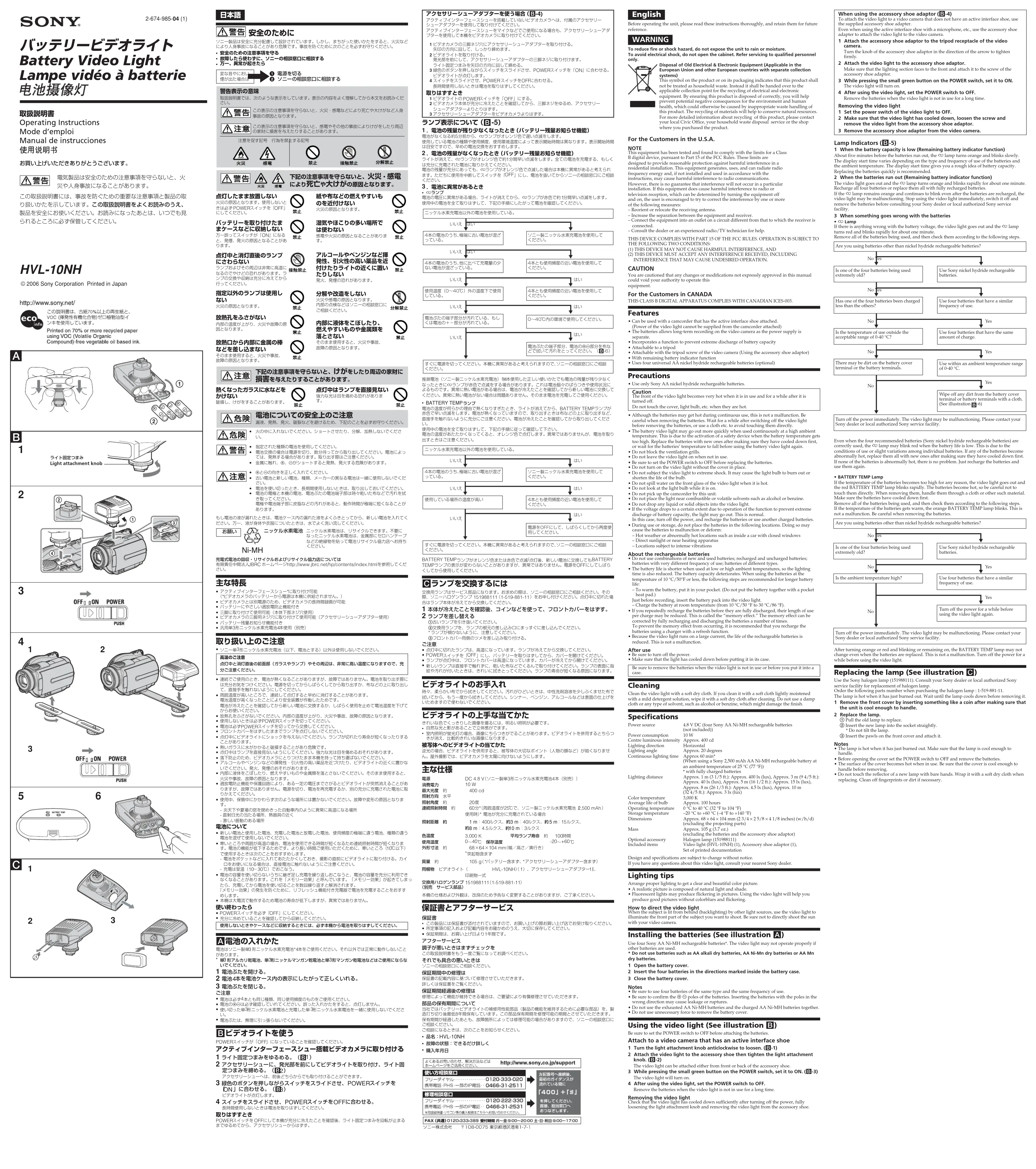 6Spécifications Alimentation 4,8 V CC (4 piles rechargeables Ni-MH Sony AA(non comprises))Consommation 10 WIntensité lumineuse au centre environ 400 cdDirection de l’éclairage HorizontalAngle d’éclairage environ 20 degrésDurée d’éclairage continu environ 60 min*(si vous utilisez une pile rechargeable Ni-MH Sony 2 500mAh AA à une température ambiante de 25 °C (77 °F))* avec des piles complètement rechargées Distance d’éclairage environ 1 m (3 1/5 pi.) : environ 400 lx (lux), environ 3 m (9 4/5 pi.) : environ 40 lx (lux), environ 5 m (16 1/2 pi.) : environ 15 lx (lux), environ 8 m (26 1/3 pi.) : environ 4,5 lx (lux), environ 10 m (32 4/5 pi.) : environ 3 lx (lux) Température de couleur 3 000 KDurée moyenne d’utilisation environ 100 heuresd’une ampouleTempérature de fonctionnement 0 °C à 40 °C (32 °F à 104 °F)Température de stockage –20 °C à +60 °C (-4 °F à +140 °F)Dimensions environ 68 x 64 x 104 mm (l/h/p)(parties saillantes non comprises)Poids environ 105 g (3,7 on.)(sans les piles et l’adaptateur de griffe porte-accessoires)Accessoire en option Lampe halogène (151988111)Articles inclus Lampe vidéo à batterie (HVL-10NH) (1), Adaptateur degriffe porte-accessoires (1), Jeu de documents imprimésLa conception et les spécifications sont sujettes à modifications sans préavis.Pour toute question relative à cette lampe vidéo, veuillez contacter votre revendeur Sony agréé. Conseils d’éclairage Un éclairage correct est indispensable pour obtenir des images nettes et des belles couleurs.•Une image réaliste est composée de zones d’ombre et de lumière naturelles.• Les lampes fluorescentes ont tendance à produire un scintillement de l’image. L’utilisationd’une lampe vidéo améliorera la qualité des images et supprimera les couleurs floues et lescintillement. Comment diriger la lampe vidéo Lorsque le sujet est éclairé par derrière (contre-jour) par d’autres sources lumineuses, utilisez lalampe vidéo pour éclairer la partie du sujet qui doit être filmée de face. Ne filmez pasdirectement le soleil avec votre caméra vidéo. Mise en place des piles (voir figure A) Utilisez quatre piles Sony rechargeables Ni-MH AA*. La lampe vidéo risque de ne pasfonctionner correctement si d’autres piles sont utilisées.* N’utilisez pas de piles telles que des piles sèches alcalines AA, des piles sèches Ni-Mn AAou des piles sèches Mn AA.1 Ouvrez le couvercle des piles. 2 Insérez les quatre piles dans le sens indiqué dans le logement des piles. 3 Refermez le couvercle des piles. Remarques