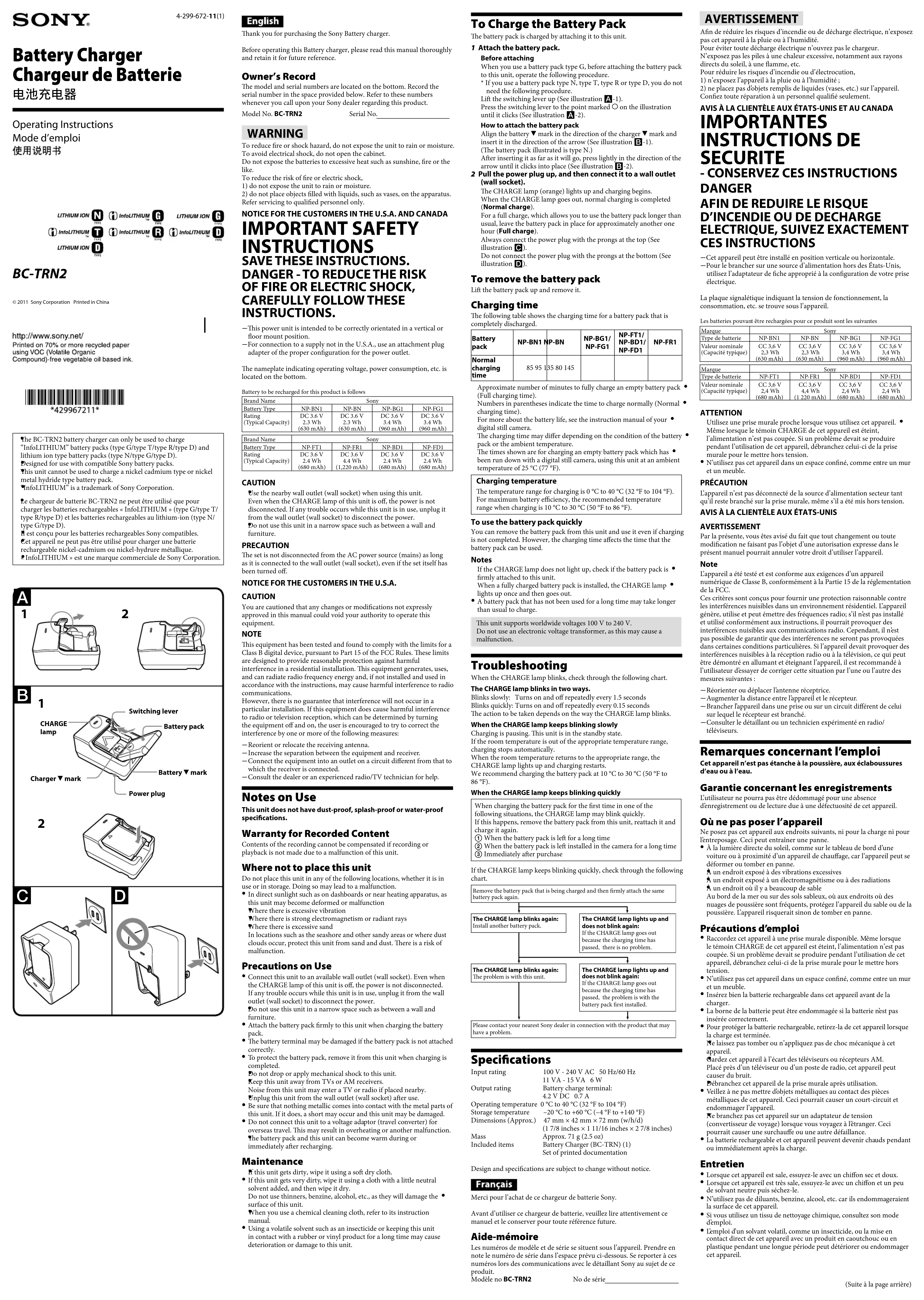 Switching lever e BC-TRN2 battery charger can only be used to charge ˎ“InfoLITHIUM” battery packs (type G/type T/type R/type D) and lithium ion type battery packs (type N/type G/type D).Designed for use with compatible Sony battery packs. ˎis unit cannot be used to charge a nickel cadmium type or nickel ˎmetal hydride type battery pack.“InfoLITHIUM” is a trademark of Sony Corporation. ˎLe chargeur de batterie BC-TRN2 ne peut être utilisé que pour ˎcharger les batteries rechargeables « InfoLITHIUM » (type G/type T/type R/type D) et les batteries rechargeables au lithium-ion (type N/type G/type D).Il est conçu pour les batteries rechargeables Sony compatibles. ˎCet appareil ne peut pas être utilisé pour charger une batterie ˎrechargeable nickel-cadmium ou nickel-hydrure métallique.« InfoLITHIUM » est une marque commerciale de Sony Corporation. ˎBattery mark AVERTISSEMENT An de réduire les risques d’incendie ou de décharge électrique, n’exposez pas cet appareil à la pluie ou à l’humidité.Pour éviter toute décharge électrique n’ouvrez pas le chargeur.N’exposez pas les piles à une chaleur excessive, notamment aux rayons directs du soleil, à une amme, etc.Pour réduire les risques d’incendie ou d’électrocution,1) n’exposez l’appareil à la pluie ou à l’humidité ;2) ne placez pas d’objets remplis de liquides (vases, etc.) sur l’appareil.Conez toute réparation à un personnel qualié seulement.AVIS À LA CLIENTÈLE AUX ÉTATS-UNIS ET AU CANADA IMPORTANTES INSTRUCTIONS DE SECURITE