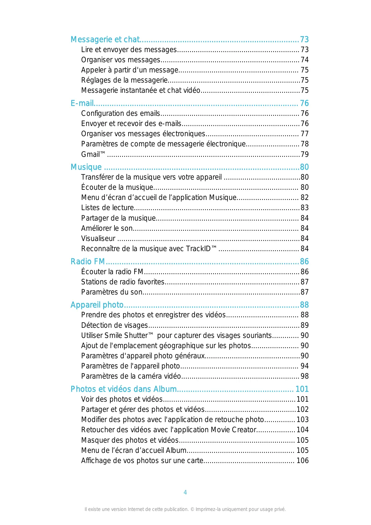 Messagerie et chat73 Lire et envoyer des messages 73 Organiser vos messages 74 Appeler à partir d'un message 75 Réglages de la messagerie75 Messagerie instantanée et chat vidéo75