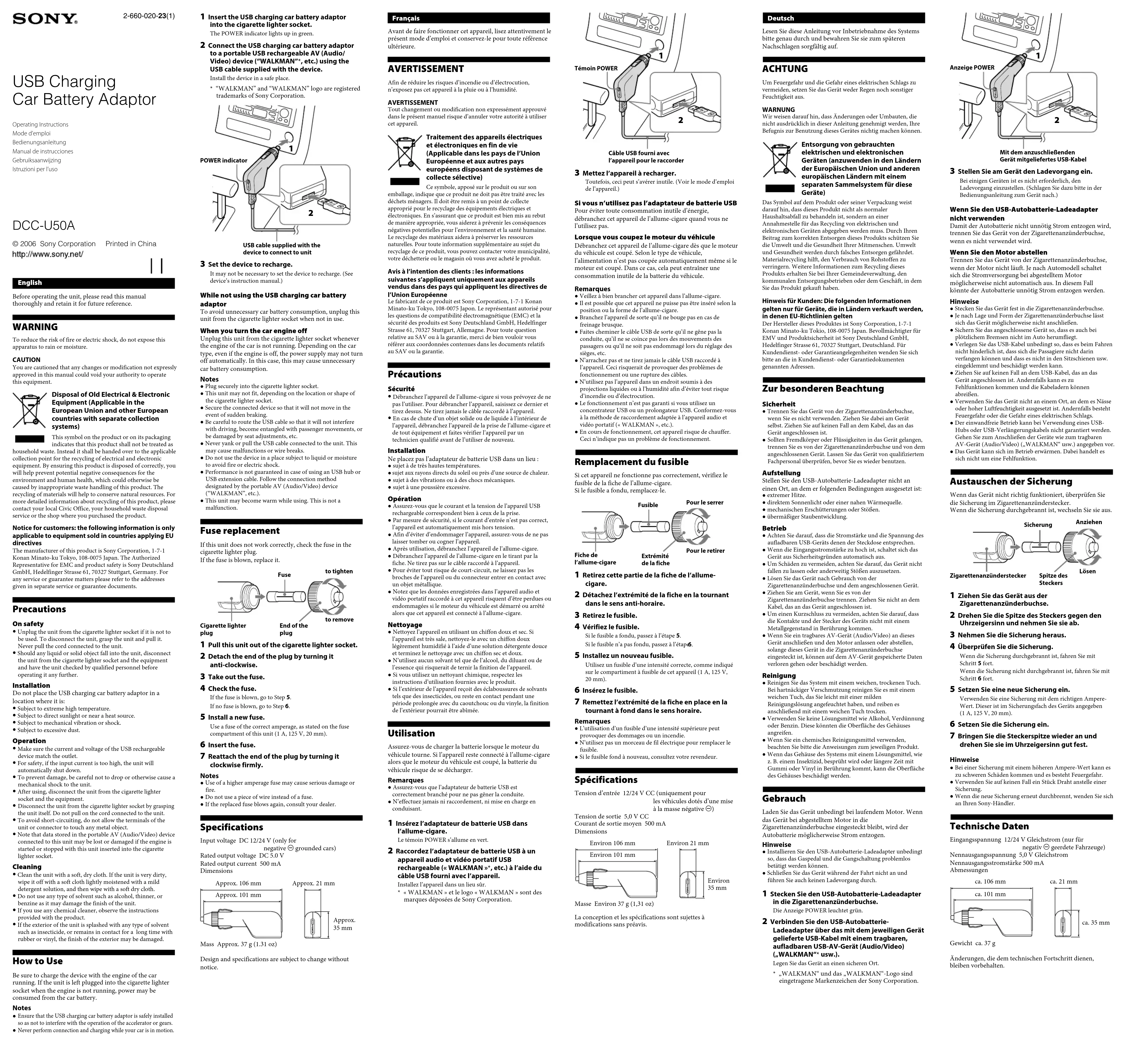 Never perform connection and charging while your car is in motion. Français Avant de faire fonctionner cet appareil, lisez attentivement le présent mode d’emploi et conservez-le pour toute référence ultérieure. AVERTISSEMENT Afin de réduire les risques d’incendie ou d’électrocution, n’exposez pas cet appareil à la pluie ou à l’humidité.AVERTISSEMENTTout changement ou modification non expressément approuvé dans le présent manuel risque d’annuler votre autorité à utiliser cet appareil. Traitement des appareils électriques et électroniques en fin de vie (Applicable dans les pays de l’Union Européenne et aux autres pays européens disposant de systèmes de collecte sélective) Ce symbole, apposé sur le produit ou sur son emballage, indique que ce produit ne doit pas être traité avec les déchets ménagers. Il doit être remis à un point de collecte approprié pour le recyclage des équipements électriques et électroniques. En s’assurant que ce produit est bien mis au rebut de manière appropriée, vous aiderez à prévenir les conséquences négatives potentielles pour l’environnement et la santé humaine. Le recyclage des matériaux aidera à préserver les ressources naturelles. Pour toute information supplémentaire au sujet du recyclage de ce produit, vous pouvez contacter votre municipalité, votre déchetterie ou le magasin où vous avez acheté le produit.Avis à l’intention des clients : les informations suivantes s’appliquent uniquement aux appareils vendus dans des pays qui appliquent les directives de l’Union EuropéenneLe fabricant de ce produit est Sony Corporation, 1-7-1 Konan Minato-ku Tokyo, 108-0075 Japon. Le représentant autorisé pour les questions de compatibilité électromagnétique (EMC) et la sécurité des produits est Sony Deutschland GmbH, Hedelfinger Strasse 61, 70327 Stuttgart, Allemagne. Pour toute question relative au SAV ou à la garantie, merci de bien vouloir vous référer aux coordonnées contenues dans les documents relatifs au SAV ou la garantie. Précautions Sécurité