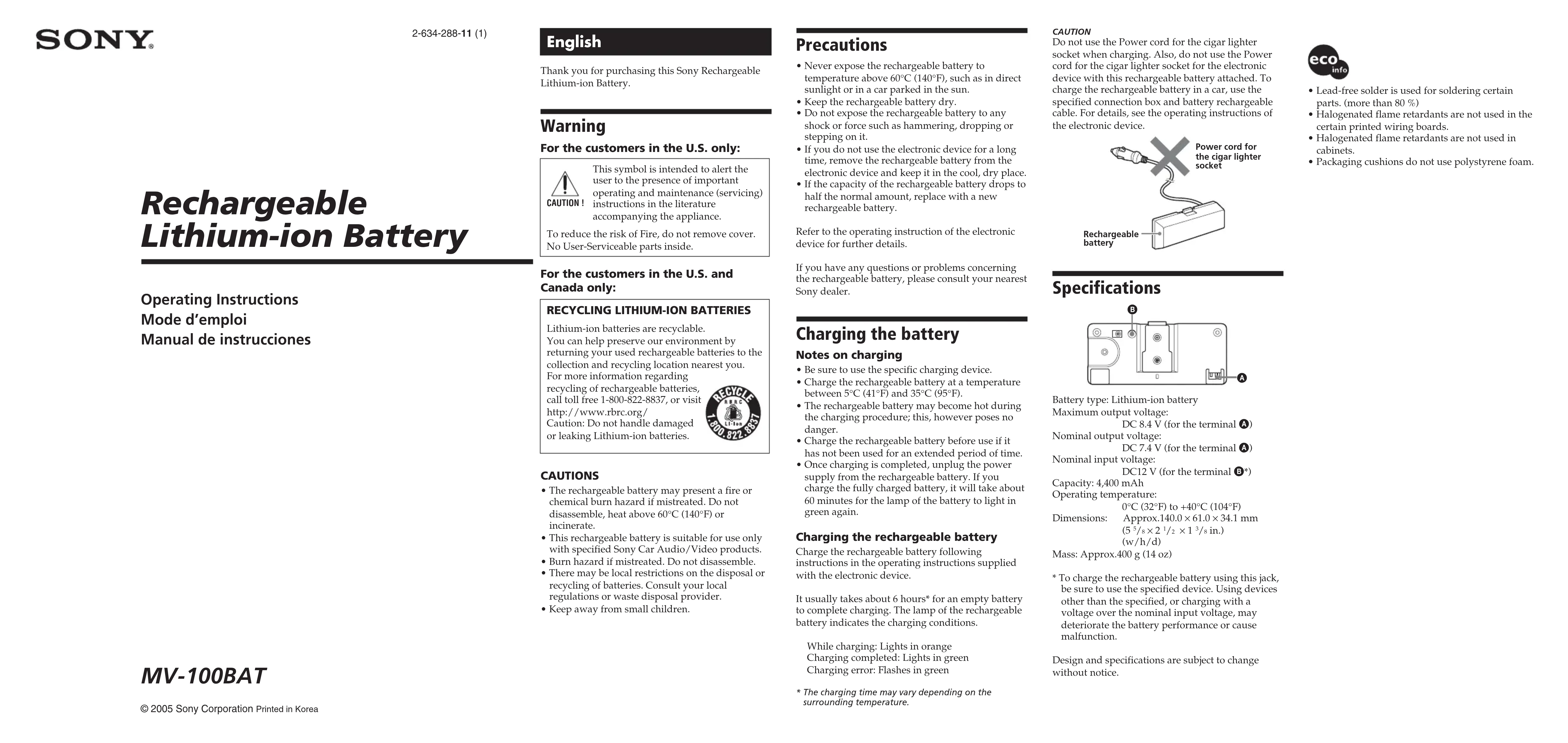 MV100BAT - Batterie SONY - Notice d'utilisation et mode d'emploi gratuit