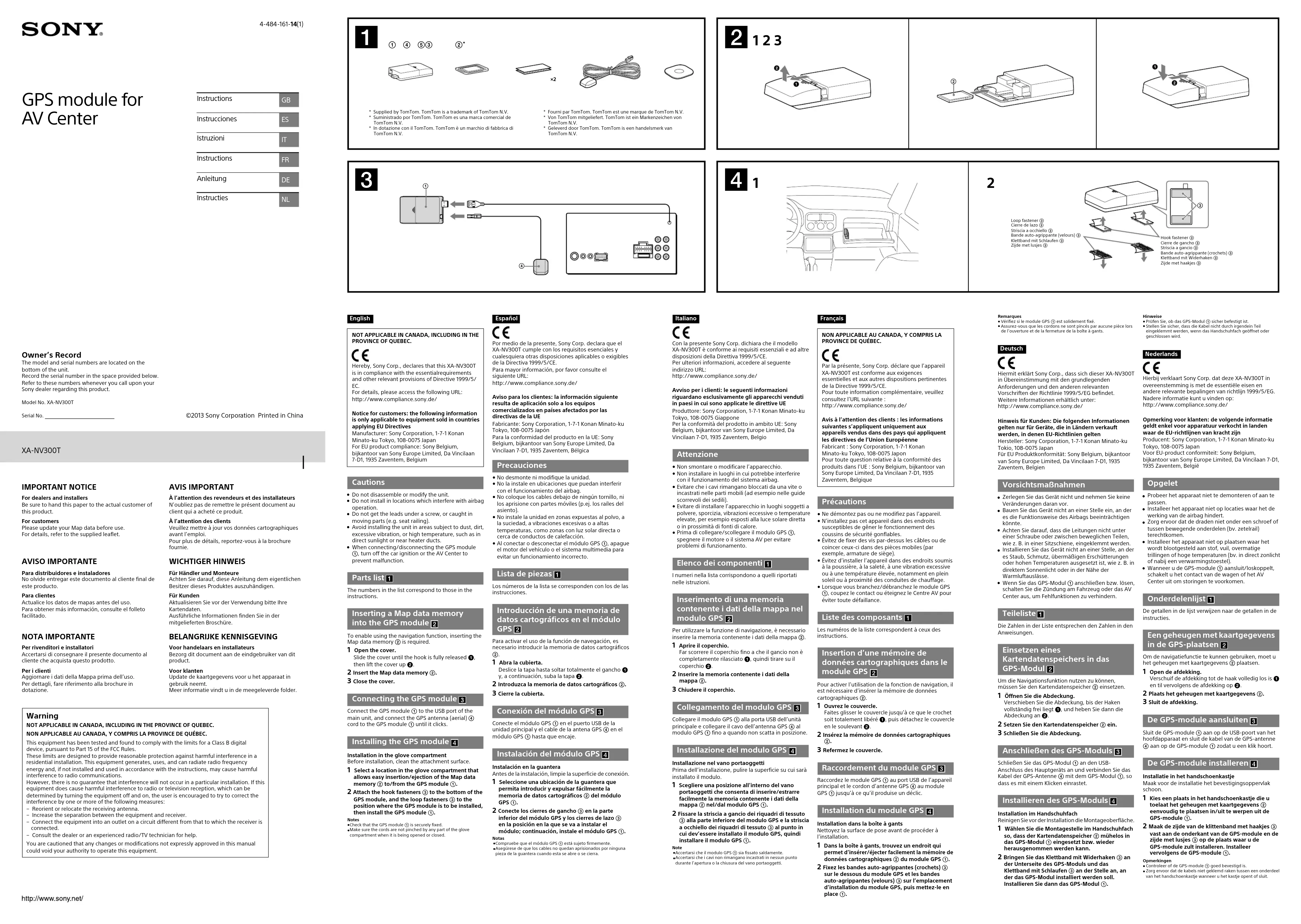 Accertarsi che il modulo GPS sia fissato saldamente. Accertarsi che i cavi non rimangano incastrati in nessun punto durante l’apertura o la chiusura del vano portaoggetti. FrançaisNON APPLICABLE AU CANADA, Y COMPRIS LA PROVINCE DE QUÉBEC.Par la présente, Sony Corp. déclare que l’appareil XA-NV300T est conforme aux exigences essentielles et aux autres dispositions pertinentes de la Directive 1999/5/CE. Pour toute information complémentaire, veuillez consultez l’URL suivante : http://www.compliance.sony.de/Avis à l’attention des clients : les informations suivantes s’appliquent uniquement aux appareils vendus dans des pays qui appliquent les directives de l’Union EuropéenneFabricant : Sony Corporation, 1-7-1 Konan Minato-ku Tokyo, 108-0075 JaponPour toute question relative à la conformité des produits dans l’UE : Sony Belgium, bijkantoor van Sony Europe Limited, Da Vincilaan 7-D1, 1935 Zaventem, Belgique Précautions
