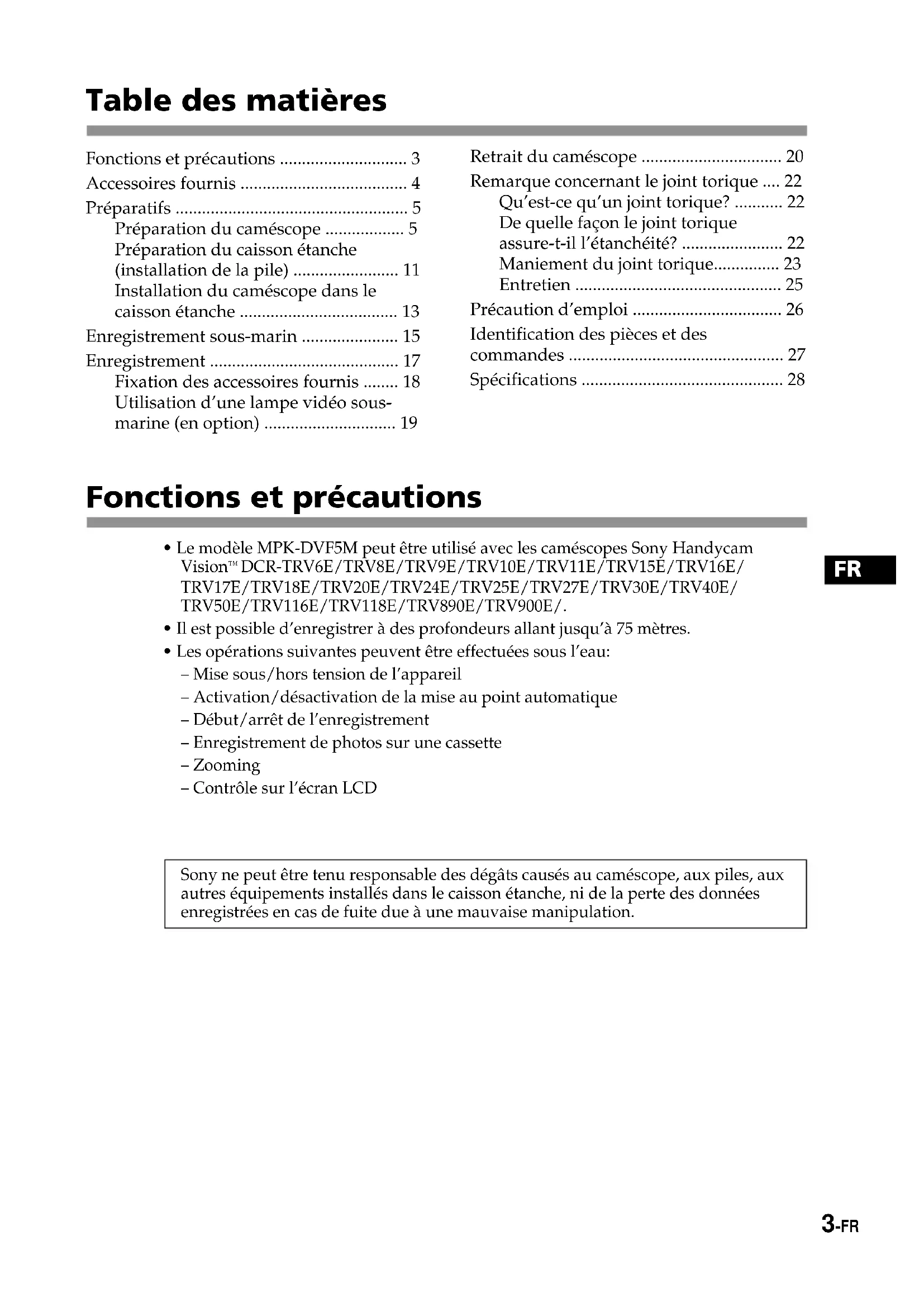 - Les opérations suivantes peuvent être effectuées sous l’eau: – Mise sous/hors tension de l’appareil – Activation/désactivation de la mise au point automatique – Début/arrêt de l’enregistrement – Enregistrement de photos sur une cassette – Zooming – Contrôle sur l’écran LCD Sony ne peut être tenu responsable des dégâts causés au caméscope, aux piles, aux autres équipements installés dans le caisson étanche, ni de la perte des données enregistrées en cas de fuite due à une mauvaise manipulation. Fonctions et précautions ............................. 3 Accessoires fournis ...................................... 4 Préparatifs ..................................................... 5 Préparation du caméscope .................. 5 Préparation du caisson étanche (installation de la pile) ........................ 11 Installation du caméscope dans le caisson étanche .................................... 13 Enregistrement sous-marin ...................... 15 Enregistrement ........................................... 17 Fixation des accessoires fournis ........ 18 Utilisation d’une lampe vidéo sous- marine (en option) .............................. 19 Retrait du caméscope ................................ 20 Remarque concernant le joint torique .... 22 Qu’est-ce qu’un joint torique? ........... 22 De quelle façon le joint torique assure-t-il l’étanchéité? ....................... 22 Maniement du joint torique............... 23 Entretien ............................................... 25 Précaution d’emploi .................................. 26 Identification des pièces et des commandes ................................................. 27 Spécifications .............................................. 28 Table des matières4-FR Accessoires fournis Vérifiez si vous avez reçu les accessoires suivants avec le caisson étanche. 1 Support de montage de caméscope B (1) 2 Espaceur C (1) 3 Support de montage de caméscope D (1) 4 Tampons pour le support de montage D (2) 5 Plaque à vis pour les supports de montage de caméscope B et D (2) 6 Support de montage de caméscope E (1) 7 Tournevis (1) Fixation pour le support de montage de caméscope B 8 Batterie NP-FM30 de moniteur LCD (1) 9 Pile au lithium CR2 (1) 0 Joint torique (1) qa Objectif grand-angulaire (VCL-MK2) (1) qs Parasoleil (1) qd Bague antiréflexion (2) Grande bague: ø 37 mm (1) Petite bague: ø 30 mm (1) qf Filtre couleur (VF-MK2) (1) qg Graisse (1) qh Sac (1) Bandoulière (1) qj Tampon de protection de la pile (1) qk Lanière (3)