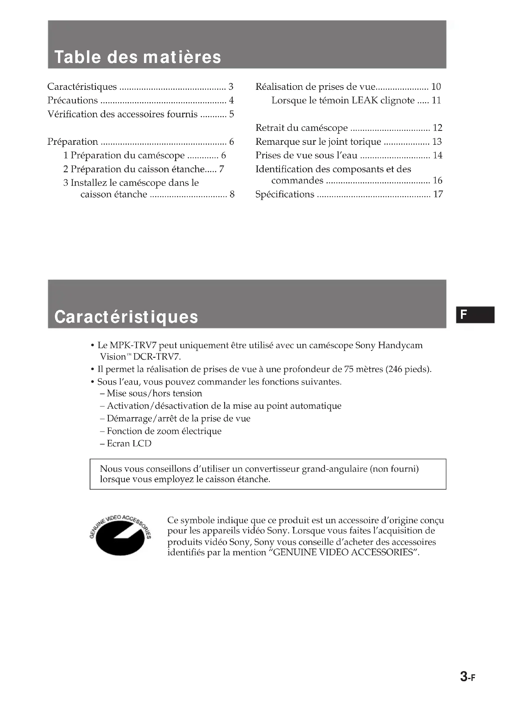 - Sous l’eau, vous pouvez commander les fonctions suivantes. – Mise sous/hors tension – Activation/désactivation de la mise au point automatique – Démarrage/arrêt de la prise de vue – Fonction de zoom électrique – Ecran LCD Nous vous conseillons d’utiliser un convertisseur grand-angulaire (non fourni) lorsque vous employez le caisson étanche. Ce symbole indique que ce produit est un accessoire d’origine conçu pour les appareils vidéo Sony. Lorsque vous faites l’acquisition de produits vidéo Sony, Sony vous conseille d’acheter des accessoires identifiés par la mention “GENUINE VIDEO ACCESSORIES”.4-F Précautions A propos des prises de vue Veillez à ne pas exposer l’appareil à l’air marin. Ne laissez pas l’appareil tomber dans l’eau.