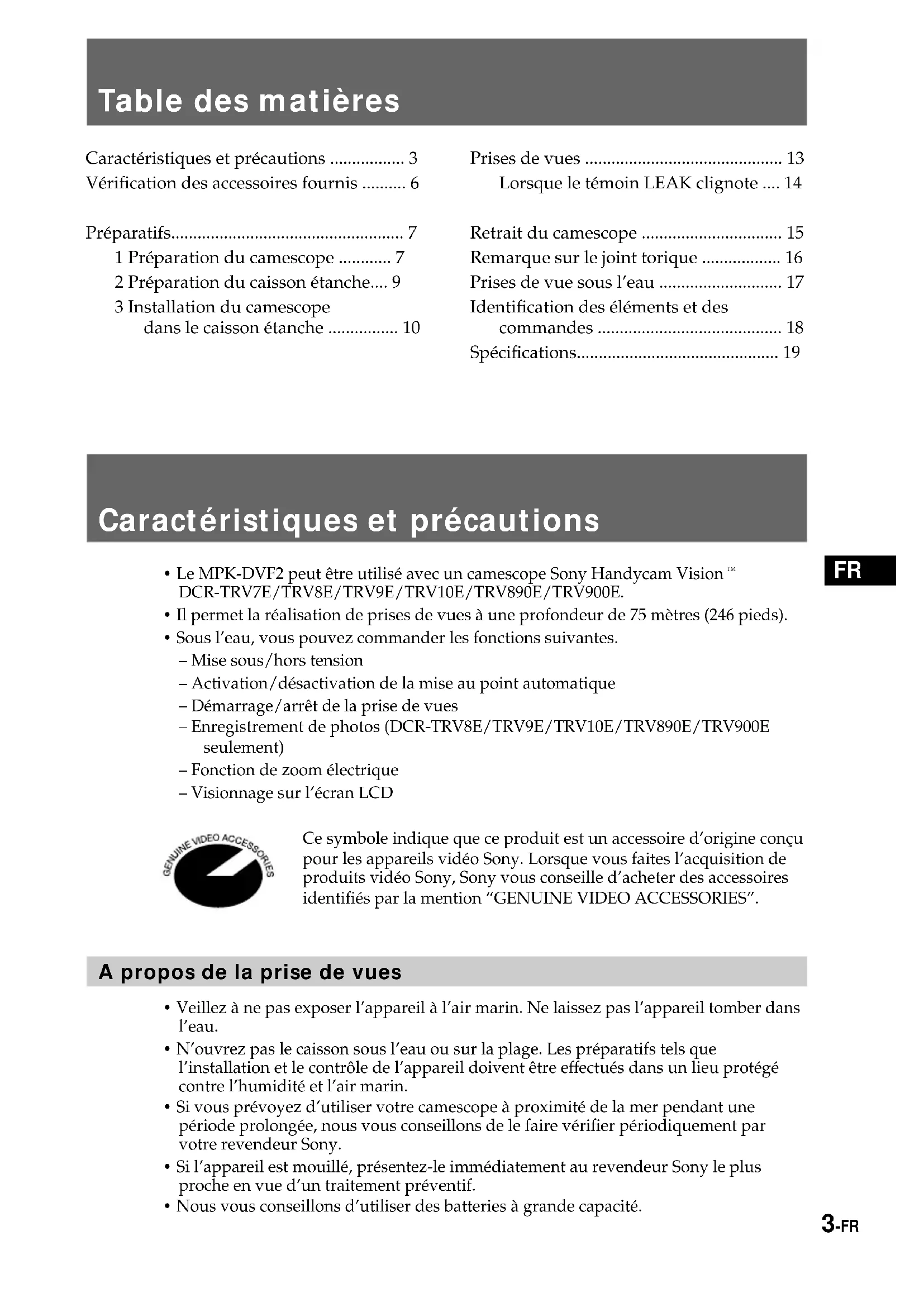 - Le MPK-DVF2 peut être utilisé avec un camescope Sony Handycam Vision DCR-TRV7E/TRV8E/TRV9E/TRV10E/TRV890E/TRV900E.• Il permet la réalisation de prises de vues à une profondeur de 75 mètres (246 pieds).• Sous l’eau, vous pouvez commander les fonctions suivantes.– Mise sous/hors tension– Activation/désactivation de la mise au point automatique– Démarrage/arrêt de la prise de vues– Enregistrement de photos (DCR-TRV8E/TRV9E/TRV10E/TRV890E/TRV900Eseulement)– Fonction de zoom électrique– Visionnage sur l’écran LCDCe symbole indique que ce produit est un accessoire d’origine conçupour les appareils vidéo Sony. Lorsque vous faites l’acquisition deproduits vidéo Sony, Sony vous conseille d’acheter des accessoiresidentifiés par la mention “GENUINE VIDEO ACCESSORIES”. A propos de la prise de vues