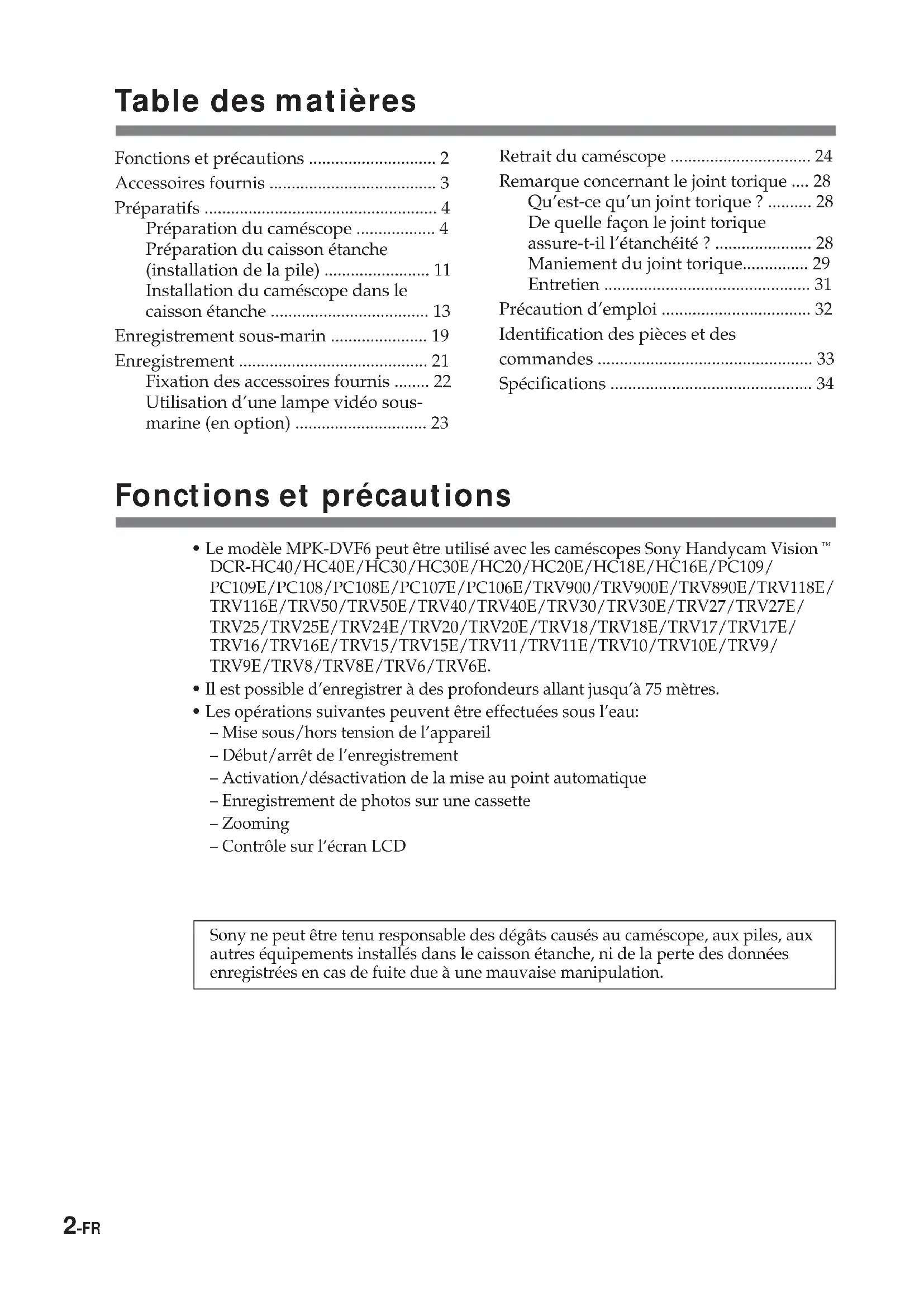 - Les opérations suivantes peuvent être effectuées sous l’eau: – Mise sous/hors tension de l’appareil – Début/arrêt de l’enregistrement – Activation/désactivation de la mise au point automatique – Enregistrement de photos sur une cassette – Zooming – Contrôle sur l’écran LCD Sony ne peut être tenu responsable des dégâts causés au caméscope, aux piles, aux autres équipements installés dans le caisson étanche, ni de la perte des données enregistrées en cas de fuite due à une mauvaise manipulation. Fonctions et précautions ............................. 2 Accessoires fournis ...................................... 3 Préparatifs ..................................................... 4 Préparation du caméscope .................. 4 Préparation du caisson étanche (installation de la pile) ........................ 11 Installation du caméscope dans le caisson étanche .................................... 13 Enregistrement sous-marin ...................... 19 Enregistrement ........................................... 21 Fixation des accessoires fournis ........ 22 Utilisation d’une lampe vidéo sous- marine (en option) .............................. 23 Retrait du caméscope ................................ 24 Remarque concernant le joint torique .... 28 Qu’est-ce qu’un joint torique ? .......... 28 De quelle façon le joint torique assure-t-il l’étanchéité ? ...................... 28 Maniement du joint torique............... 29 Entretien ............................................... 31 Précaution d’emploi .................................. 32 Identification des pièces et des commandes ................................................. 33 Spécifications .............................................. 34 Table des matières3-FR
