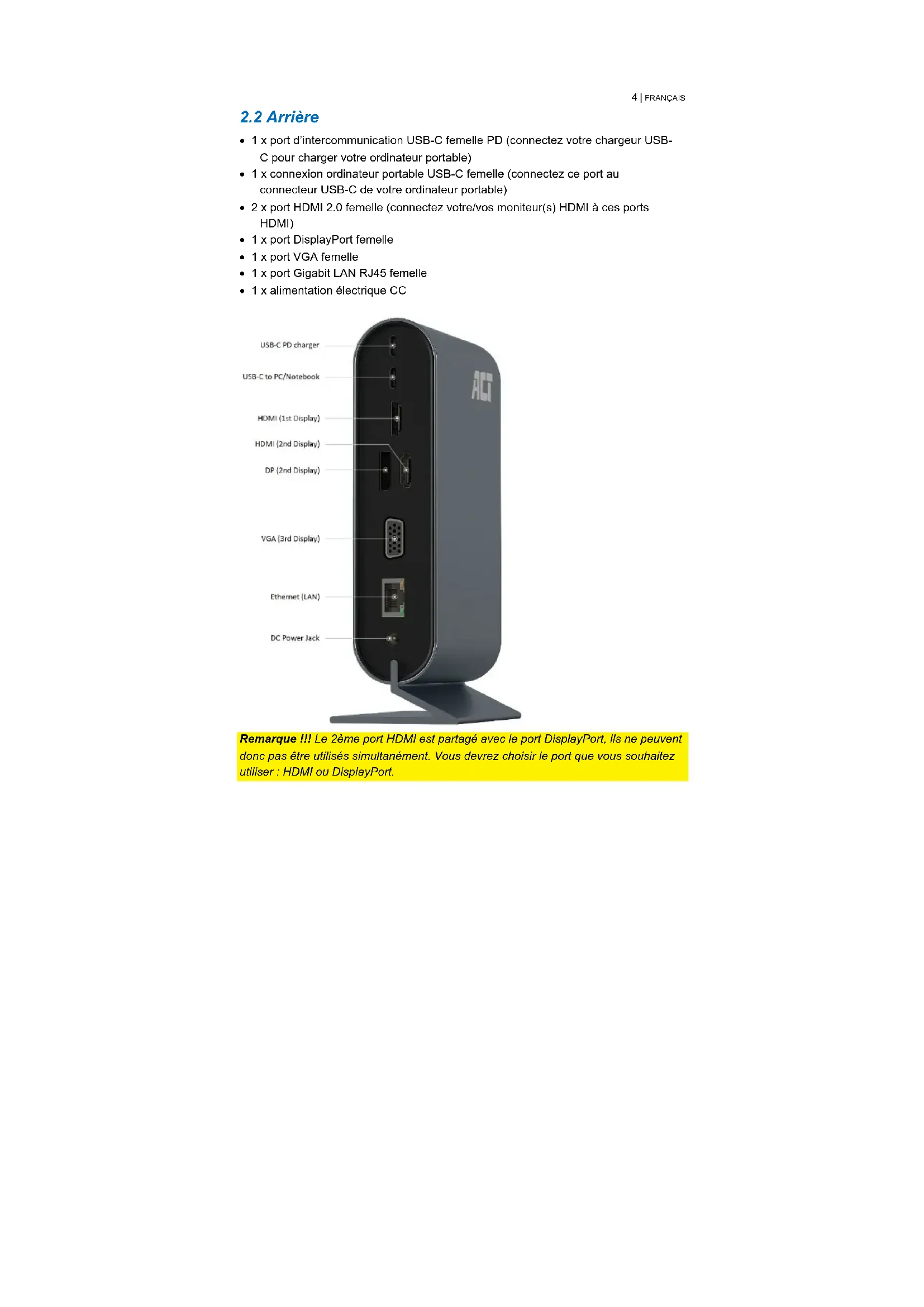 Remarque !!! Le 2ème port HDMI est partagé avec le port DisplayPort, ils ne peuvent donc pas être utilisés simultanément. Vous devrez choisir le port que vous souhaitez utiliser : HDMI ou DisplayPort.5 | FRANÇAIS