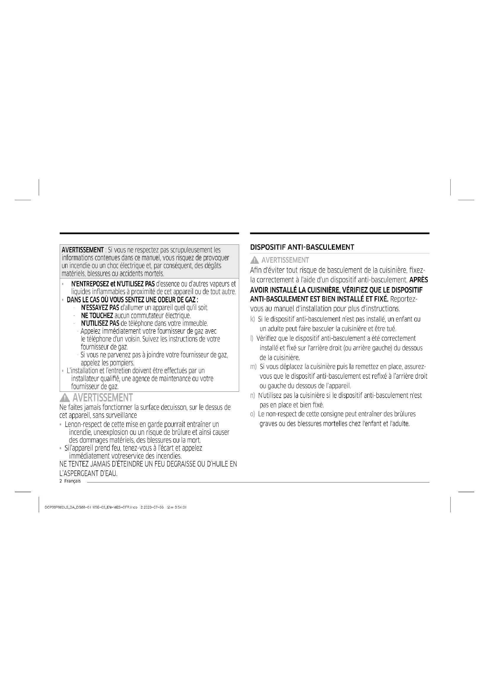 DOP36P86DLS_DA_DG68-01105E-00_EN+MES+CFR.indb 1 2020-07-06 오후 3:54:302 Français DISPOSITIF ANTIBASCULEMENT AVERTISSEMENT An d'éviter tout risque de basculement de la cuisinière, xez- la correctement à l'aide d'un dispositif anti-basculement. APRÈS AVOIR INSTALLÉ LA CUISINIÈRE, VÉRIFIEZ QUE LE DISPOSITIF ANTI-BASCULEMENT EST BIEN INSTALLÉ ET FIXÉ. Reportez- vous au manuel d'installation pour plus d'instructions. k) Si le dispositif anti-basculement n’est pas installé, un enfant ou un adulte peut faire basculer la cuisinière et être tué. l) Vériez que le dispositif anti-basculement a été correctement installé et xé sur l'arrière droit (ou arrière gauche) du dessous de la cuisinière. m) Si vous déplacez la cuisinière puis la remettez en place, assurez- vous que le dispositif anti-basculement est rexé à l’arrière droit ou gauche du dessous de l’appareil. n) N'utilisez pas la cuisinière si le dispositif anti-basculement n'est pas en place et bien xé. o) Le non-respect de cette consigne peut entraîner des brûlures graves ou des blessures mortelles chez l'enfant et l'adulte.