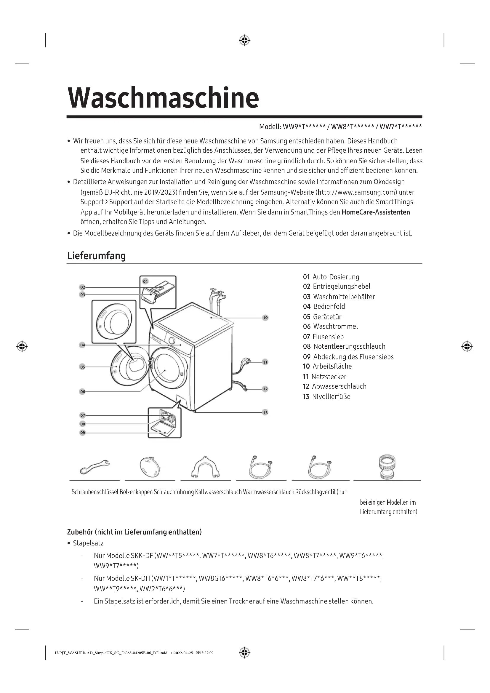 - Pour obtenir les instructions détaillées d’installation et de nettoyage du lave-linge, ainsi que des informations relatives à l’écoconception (conformément à la directive (UE) 2019/2023), consultez le site Internet de Samsung (http://www.samsung.com) et allez dans Assistance > page d’accueil de Assistance, puis saisissez le nom du modèle. Vous pouvez également télécharger et installer l’application SmartThings sur votre appareil mobile, puis ouvrir l’assistant HomeCare dans SmartThings pour obtenir des conseils et astuces.