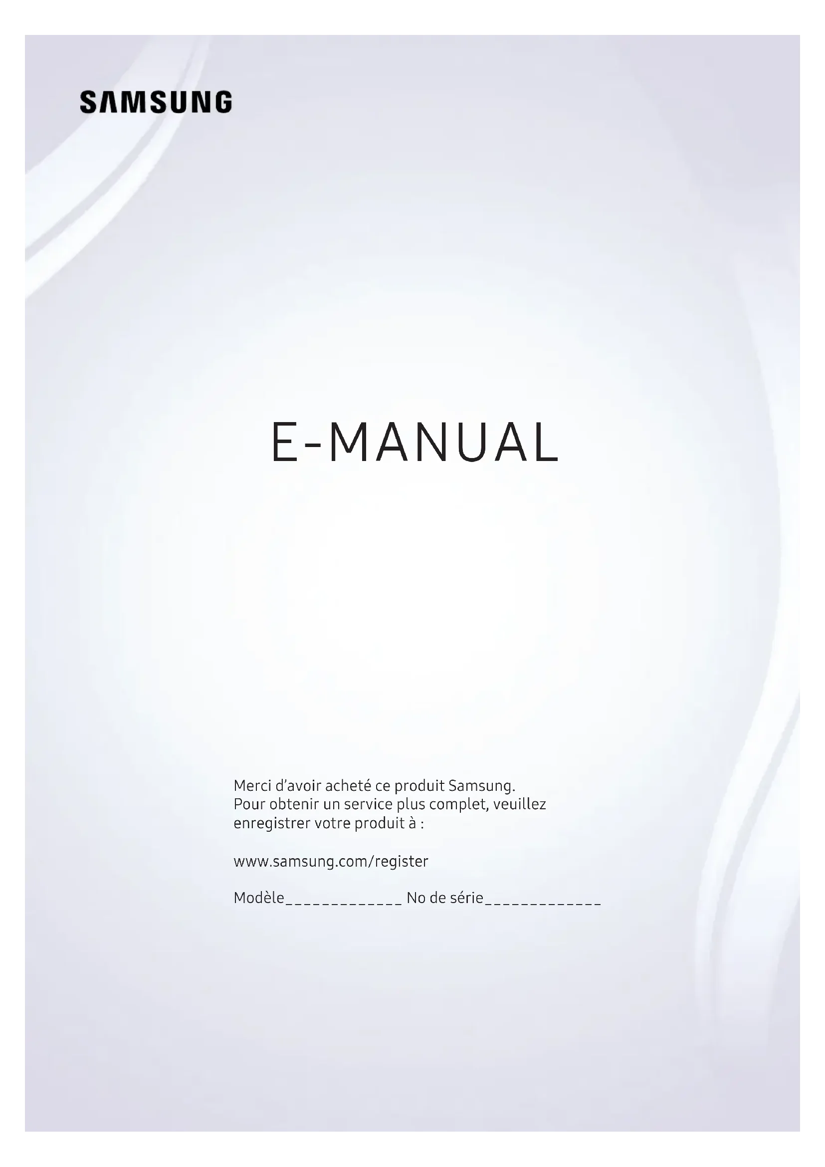 E-MANUAL Merci d’avoir acheté ce produit Samsung. Pour obtenir un service plus complet, veuillez enregistrer votre produit à: www.samsung.com/register Modèle_____________ No de série_____________Contenu Guides rapides Connexion de la télécommande Télécommande intelligente Samsung au téléviseur Utilisation de la fonction Smart Hub 2 Utilisation du mode Smart Hub Utilisation de l'option Interaction vocale 3 Configuration de la fonction Interaction vocale 3 Exécuter la fonction Interaction vocale Connexions Connexion d'une antenne Connexion à Internet 4 Connexion au réseau Internet Résolution de problèmes de connectivité à Internet 6 Résolution de problèmes de connectivité câblée à Internet 7 Résolution de problèmes de connectivité sans fil à Internet Connexion d'appareils vidéo 8 Connexion à l'aide d'un câble HDMI 8 Connexion avec un câble pour composante (seulement les modèles avec la connexion COMPONENT IN / AV IN) 9 Se connecter à l'aide d'un câble pour composante (seulement pour les modèles dotés d'une entrée COMPONENT IN / AV IN) Connexions d'entrée et de sortie audio 10 Connexion avec un câble HDMI (ARC) 10 Connexion à l'aide d'un câble audio numérique (optique) 11 Connexion par l'intermédiaire d'un réseau sans fil 11 Branchement d'appareils Bluetooth Connexion à un ordinateur 12 Connexion au moyen du port HDMI ― Partage d'écran 12 Connexion par le biais de l'application Affichage intelligent ― Partage de contenu Connexion d'un appareil mobile 13 Utilisation de la fonction Affichage intelligent (Recopie d’écran) ou partage du contenu 13 Connexion à un appareil mobile sans routeur sans fil (Wi-Fi Direct). 13 Connexion d'un appareil mobile par le biais du mode Application Affichage intelligent Commuter entre des appareils externes connectés au téléviseur 14 Changer le signal d'entrée 14 Modifier les appareils externes 14 Utilisation de fonctions supplémentaires Information en ce qui concerne les connexions 15 Information en ce qui concerne la connexion HDMI 16 Établir une connexion à un appareil audio 16 Information en ce qui concerne la connexion à un ordinateur 16 Information en ce qui concerne la connexion à des appareils mobiles Télécommande et appareils périphériques À propos de la télécommande Télécommande intelligente Samsung (Version Interaction vocale) À propos de la télécommande Télécommande intelligente Samsung (pas d'interaction vocale) Connexion à la télécommande Télécommande intelligente Samsung Commande des appareils externes avec la télécommande Télécommande intelligente Samsung – Utilisation de la télécommande universelle Commander le téléviseur à l'aide d'un clavier ou d'une console de jeux 22 Branchement d'un clavier USB 22 Branchement d'un clavier Bluetooth ou d'une console de jeux 22 Utilisation du clavier Saisir du texte à l'aide du clavier QWERTY à l'écran 23 Utilisation de fonctions supplémentaires IIFonctions Smart Smart Hub 24 Affichage de l'écran Accueil 26 Lancement automatique de Smart Hub 26 Essai des connexion Smart Hub 26 Réinitialiser Smart Hub Utiliser un compte Samsung 26 Création d'un compte Samsung 27 Se connecter à un compte Samsung Utilisation du service GAMES 28 Installer et exécuter un jeu 29 Gestion des jeux achetés ou installés 30 Évaluation des jeux Utilisation du service APPS 31 Installer et exécuter une application 31 Gestion des applications achetées ou installées 33 Évaluation d'applications 33 Utiliser les fonctions des autres applications Utilisation de la fonction e-Manual 33 Lancement du guide électronique 33 Utilisation des touches dans le guide électronique Utilisation de la fonction Navigateur Web Lire des images, des vidéos et de la musique 35 Lire du contenu média 35 Fonctions dans l'écran de la liste des contenus média Utilisation de l'option Interaction vocale 36 Configuration de la fonction Interaction vocale 36 Exécuter la fonction Interaction vocale Visionnement d'émissions de télévision Consulter rapidement l'information sur le contenu diffusé 37 Utilisation du guide 38 Changer le signal de diffusion 38 Vérification de l' Enregistrement d'émissions 38 Enregistrement d'émissions 39 Gestion de la liste des enregistrements programmés 39 Visionnement d'émissions enregistrées Planifier un visionnement 40 Planifier un visionnement sur une chaîne 40 Modifier la planification d'un visionnement Utilisation de la fonction Timeshift Utilisation de la fonction Liste des chaînes Modification des chaînes 42 Enregistrer de nouveau et supprimer une chaîne 42 Modifier les chaînes enregistrées 42 Utilisation de la fonction Verrouill. émissions Créer une liste personnelle de chaînes favorites 43 Enregistrer des chaînes comme chaînes favorites 43 Visionner et sélectionner des chaînes à partir des listes de chaînes favorites seulement. Modifier la liste de chaînes favorites 44 Retrait de chaînes d'une liste de chaînes favorites 44 Changer l'ordre des chaînes dans une liste de chaînes favorites 44 Renommer une liste de chaînes favorites Rendez vos émissions sportives plus réalistes avec le mode Mode Sports 44 Extraction automatique des faits saillants 45 Visionnement d'un événement sportif enregistré en mode sports Fonctions de soutien au visionnement de la télévision 45 Recherche des chaînes disponibles 46 Configuration des paramètres avancés de diffusion 46 Sélection de la langue audio de diffusion 46 Syntonisation du signal en mode de diffusion analogique II IIIImage et son Ajustement de la qualité de l'image 47 Sélectionnez le mode d’image. 47 Configuration des paramètres avancés de l'image Fonctions de prise en charge de l'image 49 Mode de visionnement image sur image (ISI) 49 Affichage en modeHDR 50 Modifier le format de l'image Ajustement de la qualité du son 51 Sélectionner un mode de son. 51 Configuration des paramètres avancés du son Utilisation des fonctions de soutie