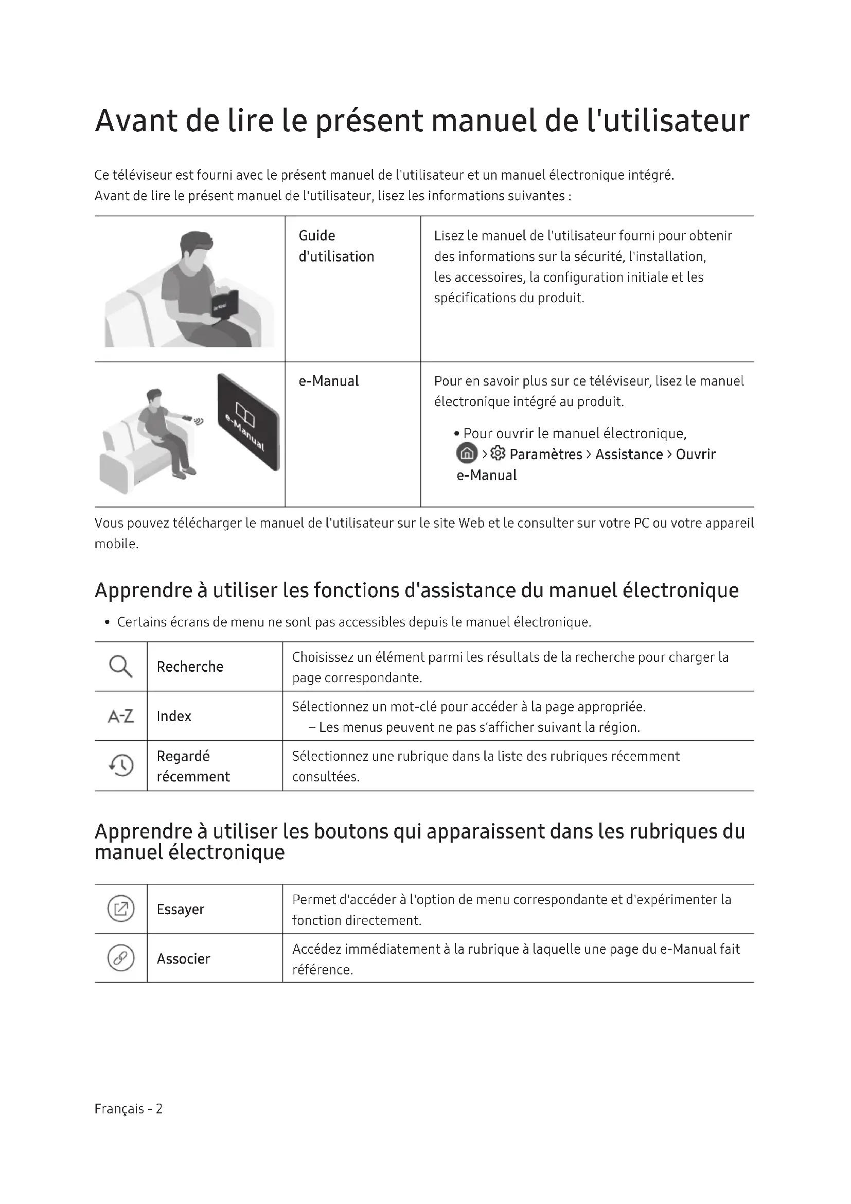 - Certains écrans de menu ne sont pas accessibles depuis le manuel électronique. Recherche Choisissez un élément parmi les résultats de la recherche pour charger la page correspondante. Index Sélectionnez un mot-clé pour accéder à la page appropriée. – Les menus peuvent ne pas s’afficher suivant la région. Regardé récemment Sélectionnez une rubrique dans la liste des rubriques récemment consultées. Apprendre à utiliser les boutons qui apparaissent dans les rubriques du manuel électronique Essayer Permet d'accéder à l'option de menu correspondante et d'expérimenter la fonction directement. Associer Accédez immédiatement à la rubrique à laquelle une page du e-Manual fait référence. Français Français - 2Avertissement! Consignes de sécurité importantes Veuillez lire les consignes de sécurité avant d'utiliser le téléviseur. ATTENTION Produit de classeII: Ce symbole indique qu'aucun raccordement de sécurité à la terre (prise de terre) n'est requis. RISQUE DE CHOC ÉLECTRIQUE.NE PAS OUVRIR.