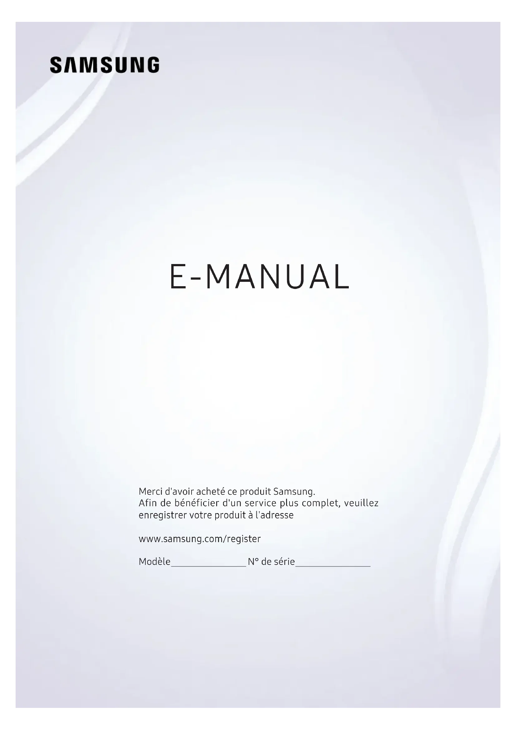 E-MANUAL Merci d'avoir acheté ce produit Samsung. Afin de bénéficier d'un service plus complet, veuillez enregistrer votre produit à l'adresse www.samsung.com/register Modèle N° de sérieContenu Guides de démarrage Connexion à Samsung Smart Remote Guide relatif aux boutons du Samsung Smart Remote Utilisation de Smart Hub 2 Utilisation de Smart Hub Utilisation de Interaction vocale 3 Configuration de l'intégration vocale 3 Exécution de Interaction vocale Connexions Raccordement d'une antenne (Antenne) Connexion à Internet 5 Connexion au réseau Internet Résolution des problèmes de connectivité Internet 7 Résolution des problèmes de connectivité Internet câblée 8 Résolution des problèmes de connectivité Internet sans fil Connexion de périphériques vidéo 9 Connexion à l'aide d'un câble HDMI 9 Connexion avec un câble composant (modèles dotés d'un connecteur COMPONENT IN / AV IN) 10 Connexion à l'aide d'un câble composite (pour les modèles dotés d'un port COMPONENT IN / AV IN) Connexions d'entrée et de sortie audio 10 Connexion à l'aide d'un câble HDMI (ARC) 11 Connexion à l'aide d'un câble audio numérique (optique) 11 Connexion au moyen d'un réseau sans fil 11 Connexion des périphériques Bluetooth Connexion à un ordinateur 12 Connexion via le port HDMI ― Partage d'écran 12 Connexion via Vue intelligente l'application ― Partage d'écran Connexion d'un périphérique mobile 13 Utilisation de la fonction Vue intelligente (Réplication de l'écran) ou du partage de contenu 13 Connexion de périphériques mobiles sans routeur sans fil (Wi- Fi Direct) 13 Connexion à l'aide d'un périphérique mobile via Application Smart View Basculement entre les différents périphériques externes connectés au téléviseur 14 Changement de signal d'entrée 14 Modification des périphériques externes 15 Utilisation des autres fonctions Remarques sur la connexion 15 Remarque sur la connexion HDMI 16 Remarque sur la connexion des périphériques audio 16 Remarque sur la connexion des ordinateurs 16 Remarque sur la connexion des périphériques mobiles Télécommande et périphériques À propos du Samsung Smart Remote (version Interaction vocale) À propos du Samsung Smart Remote Connexion à Samsung Smart Remote Commande des périphériques externes à l'aide de la Samsung Smart Remote - Utilisation de la télécommande universelle Commande du téléviseur à l'aide d'un clavier ou d'une manette de jeu 22 Connexion d'un clavier USB 22 Connexion d'un clavier et d'une manette de jeu Bluetooth 22 Utilisation du clavier Saisie de texte à l'aide du clavier QWERTY à l'écran 23 Utilisation des autres fonctions IIFonctions Smart Smart Hub 25 Affichage de Home Screen 26 Lancement automatique de Smart Hub 26 Lancement automatique de la dernière application utilisée 26 Test des connexions Smart Hub 26 Réinitialisation de Smart Hub Utilisation d'un compte Samsung 27 Création d'un compte Samsung 27 Ouverture d'un compte Samsung 28 Gestion des informations de paiement sauvegardées sur le téléviseur 28 Suppression d'un compte Samsung du téléviseur Utilisation du service GAMES 29 Installation et exécution d'un jeu 29 Gestion des jeux achetés ou installés 30 Évaluation des jeux Utilisation du service APPS 31 Installation et exécution d'une application 32 Gestion des applications achetées ou installées 33 Utilisation des autres caractéristiques et fonctions de l'application Utilisation du e-Manual 34 Lancement du manuel électronique 34 Utilisation des boutons du manuel électronique Utilisation du Web Browser Lecture des images/vidéos/fichiers musicaux 35 Lecture de contenu multimédia 36 Fonctions de l'écran de liste de contenu multimédia Utilisation de Interaction vocale 37 Configuration de l'intégration vocale 37 Exécution de l'interaction vocale Visionnement du téléviseur Affichage des informations sur les diffusions numériques en bref 38 Utilisation du guide 39 Changement de signal de diffusion 39 Vérification des informations sur le signal de la chaîne numérique et son intensité Enregistrement de programmes 39 Enregistrement de programmes 40 Gestion de la liste des enregistrements planifiés 40 Visionnage de programmes enregistrés Configuration d'un Programmer visionnage 41 Configuration du visionnage des programmes d'une chaîne Utilisation de Timeshift Utilisation du Liste des chaînes Modification de chaînes 43 Suppression de chaînes enregistrées 44 Modification de chaînes enregistrées Création d'une liste de chaînes favorites personnalisée 44 Enregistrement des chaînes dans la liste de chaînes favorites 45 Affichage et sélection des chaînes dans les listes de favoris uniquement Modification d'une Favourites List (Liste des Favoris) 45 Suppression des chaînes d'une liste de chaînes favorites 45 Réorganisation d'une liste de chaînes favorites 45 Modification du nom d'une liste de chaînes favorites Des programmes sportifs plus réalistes avec Mode Sport 46 Extraction automatique des moments forts 47 Visionnage d'un événement sportif enregistré en mode Sports IIIFonctions de prise en charge du visionnage de programmes télévisés 47 Recherche des chaînes disponibles 47 Configuration des paramètres de diffusion avancés 47 Lecture de texte numérique 48 Sélection de la langue audio de diffusion 48 Définition du pays (zone) 48 Réglage manuel des signaux de diffusion 49 Réglage précis des diffusions analogiques 49 Transfert de la liste des chaînes 49 Suppression du profil de l'opérateur du module CAM 50 Définition du système satellite 50 Modification de la langue du télétexte 50 Affichage du menu d'interface commun Image et son Réglage de la qualité des images 51 Sélection du mode d'image 51 Configuration des paramètres d'image avancés Fonctions de prise en charge des images 53 Affichage d'une image incrustée dans l'image (PIP) 53 Visionnage en mode HDR 54 Modification du format de l'image Réglage de la