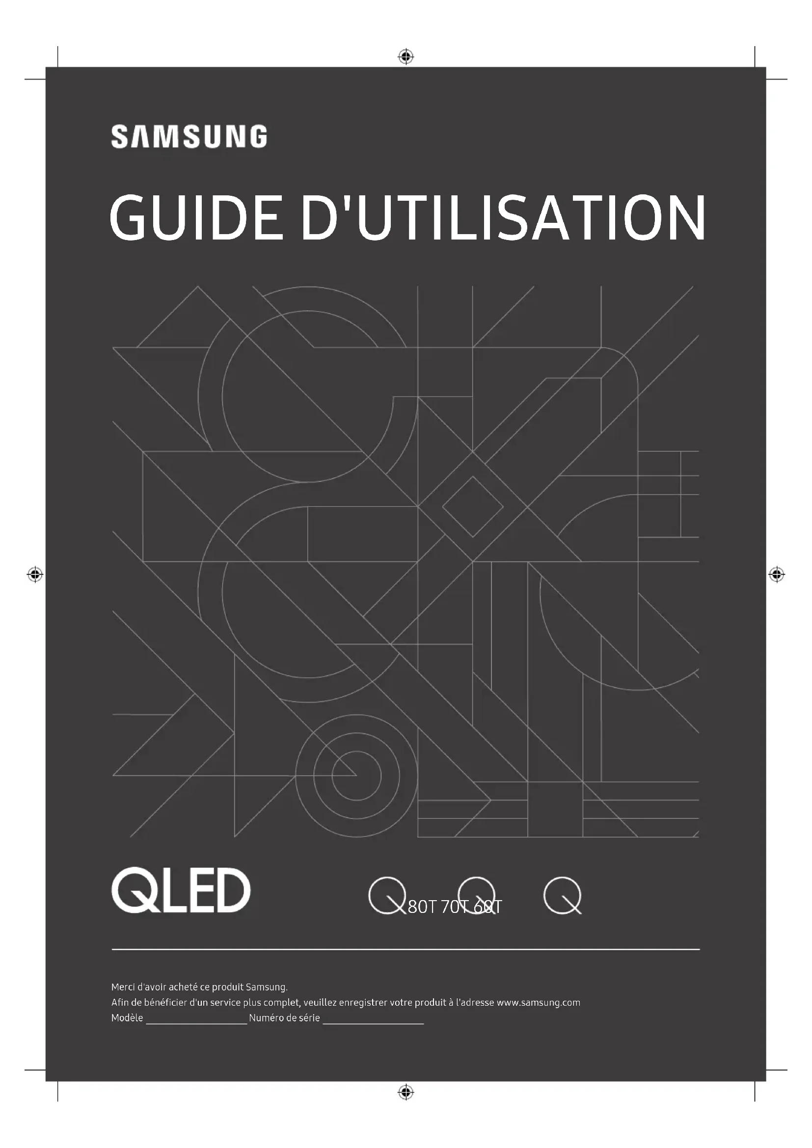 Merci d'avoir acheté ce produit Samsung. Afin de bénéficier d'un service plus complet, veuillez enregistrer votre produit à l'adresse www.samsung.com Modèle Numéro de série GUIDE D'UTILISATION 80T 70T 60TFrançais - 2 Avant de lire le présent manuel de l'utilisateur Ce téléviseur est fourni avec le présent manuel de l'utilisateur et un manuel électronique intégré. Avant de lire le présent manuel de l'utilisateur, lisez les informations suivantes: Guide d'utilisation Lisez le manuel de l'utilisateur fourni pour obtenir des informations sur la sécurité, l'installation, les accessoires, la configuration initiale et les spécifications du produit. e-Manual Pour en savoir plus sur ce téléviseur, lisez le manuel électronique intégré au produit.