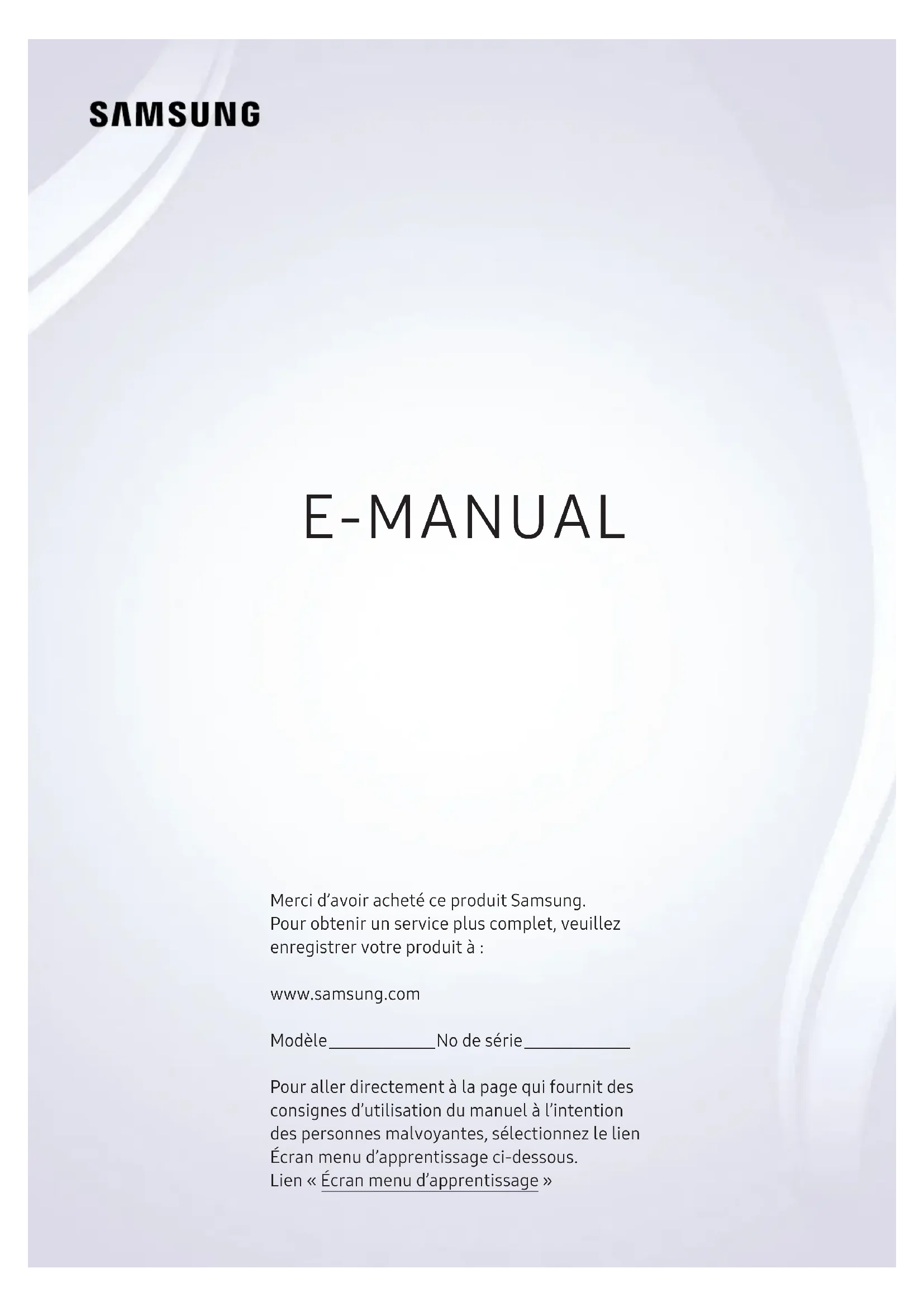 E-MANUAL Merci d’avoir acheté ce produit Samsung. Pour obtenir un service plus complet, veuillez enregistrer votre produit à: www.samsung.com Modèle__________________ No de série__________________ Pour aller directement à la page qui fournit des consignes d’utilisation du manuel à l’intention des personnes malvoyantes, sélectionnez le lien Écran menu d’apprentissage ci-dessous. Lien « Écran menu d’apprentissage » FrançaisConnexions Guide de connexion Brancher une Antenne Connexion à Internet 21 Établir une connexion à Internet câblée 22 Établir une connexion à Internet sans fil 23 Vérification de l'état de la connexion Internet 23 Réinitialisation de votre réseau 23 Mise sous tension du téléviseur à l'aide d'un appareil mobile 23 Connectez un appareil de commande IP au téléviseur. 23 Modifier le nom du téléviseur sur un réseau Câbles de connexion à des appareils externes Commuter entre des appareils externes connectés au téléviseur 26 Modifier le nom et l'icône d'un appareil externe 27 Utilisation de fonctions supplémentaires Information en ce qui concerne les connexions 28 Information en ce qui concerne la connexion HDMI 29 Établir une connexion à un appareil audio 29 Information en ce qui concerne la connexion à un ordinateur 30 Information en ce qui concerne la connexion à des appareils mobiles Télécommande et appareils périphériques À propos de la Télécommande intelligente Samsung (téléviseurs QLED et Serif) À propos de la Télécommande intelligente Samsung (téléviseur UHD et modèle Q50R) Au sujet de Télécommande intelligente Samsung (The Frame) Connexion à la Télécommande intelligente Samsung Commande des dispositifs externes avec la télécommande Samsung Smart Control– Utilisation de la Configuration de la télécommande universelle Guides rapides Connexion de la Télécommande intelligente Samsung au téléviseur Utilisation de la fonction Smart Hub Utilisation du Ambient Mode 10 Passer au Ambient Mode 10 Écran de navigation pour le Ambient Mode 13 Applique des effets au contenu 13 Permet d'afficher de l'information détaillée sur le contenu. 13 Passer à l’écran d'émissions de télévision à partir du Ambient Mode Utilisation de la fonction Interaction vocale 14 Exécution de la fonction Interaction vocale 15 Pour en savoir plus au sujet de Mon Interaction vocale 16 À lire avant d'utiliser les Interaction vocale Mise à jour du logiciel du téléviseur 18 Mise à jour par le biais d'Internet 18 Mise à jour par le biais d'une clé USB 18 Mise à jour automatique du logiciel du téléviseur Obtenir du soutien technique 19 Obtenir de l’aide grâce à Gestion à distance 19 Comment trouver les coordonnées pour obtenir des services de soutien 19 Demande de service Sommaire 2Utilisation du service APPS 62 Installer une application 62 Lancement d'une application 63 Gestion des applications installées Utilisation de l’application Galerie Utilisation de l’application Guide universel Utilisation de l’application SmartThings Utilisation du e-Manual 68 Lancement du e-Manual 69 Utilisation des touches dans le e-Manual Utilisation du Internet Lire des images, des vidéos et de la musique 72 Lire du contenu multimédia enregistré sur un ordinateur ou un appareil mobile 72 Lecture de contenu multimédia sur un dispositifUSB 73 Écoutez le son de votre appareil mobile par le biais du haut- parleur du téléviseur en utilisant l’option Sound Mirroring 73 Touches et fonctions disponibles pendant la lecture de fichiers multimédia Utilisation de la fonction Interaction vocale 77 Exécution de la fonction Interaction vocale 78 Pour en savoir plus au sujet de Mon Interaction vocale 79 À lire avant d'utiliser les Interaction vocale Visionnement d'émissions de télévision Utilisation du Guide Enregistrement d'émissions 84 Utilisation des options d'enregistrement immédiat et planifié à partir de l’écran du Guide 84 Utilisation des options d'enregistrement immédiat et Planifier un enregistrementpendant que vous regardez une émission 85 Programmer un enregistrement vidéo après avoir entré la date et l'heure 85 Gestion de la liste des enregistrements programmés 85 Visionnement d'émissions enregistrées 86 Réglage du démarrage d’un enregistrement programmé Utilisation de la fonction Anynet+ (HDMI-CEC) 42 Connecter un appareil externe par le biais de Anynet+ et en utilisant leurs menus 42 Veuillez lire ce qui suit avant de connecter un appareil en mode Anynet+ (HDMI-CEC) Commande du téléviseur à l'aide d'un clavier, d’une souris ou d'une manette 43 Branchement d'un clavier, d’une souris ou d'une manette à prise USB 43 Branchement d'un clavier, d’une souris ou d'une manette Bluetooth 44 Utilisation du clavier et de la souris 45 Configuration des appareils entrants Saisir du texte à l'aide du clavier virtuel à l'écran 46 Saisie de texte à l'aide du microphone de la télécommande et du clavier virtuel à l'écran Fonctions Smart Utilisation de la fonction Smart Hub 48 Faire afficher l’Premier Écran 53 Lancement automatique du Smart Hub 53 Lancement automatique de la dernière application utilisée 53 Mise à l’essai des connexions Smart Hub 53 Réinitialisation du Smart Hub Utiliser un compte Samsung 54 Se connecter à un compte Samsung 54 Création d'un nouveau compte Samsung 55 Gestion de votre compte Samsung Utilisation du Ambient Mode 56 Passer au Ambient Mode 56 Écran de navigation pour le Ambient Mode 59 Applique des effets au contenu 59 Permet d'afficher de l'information détaillée sur le contenu. 59 Passer à l’écran d'émissions de télévision à partir du Ambient Mode Utilisation du Remote Access 3Modifier la Image Format et la Position 100 Modifier le format de l'image 100 Ajuster la taille de l'image à l'écran 100 Ajuster la position et la taille de l'image Régler le Mode Son ou les Paramètres avancés 101 Sélectionner un mode de son. 101 Configuration d