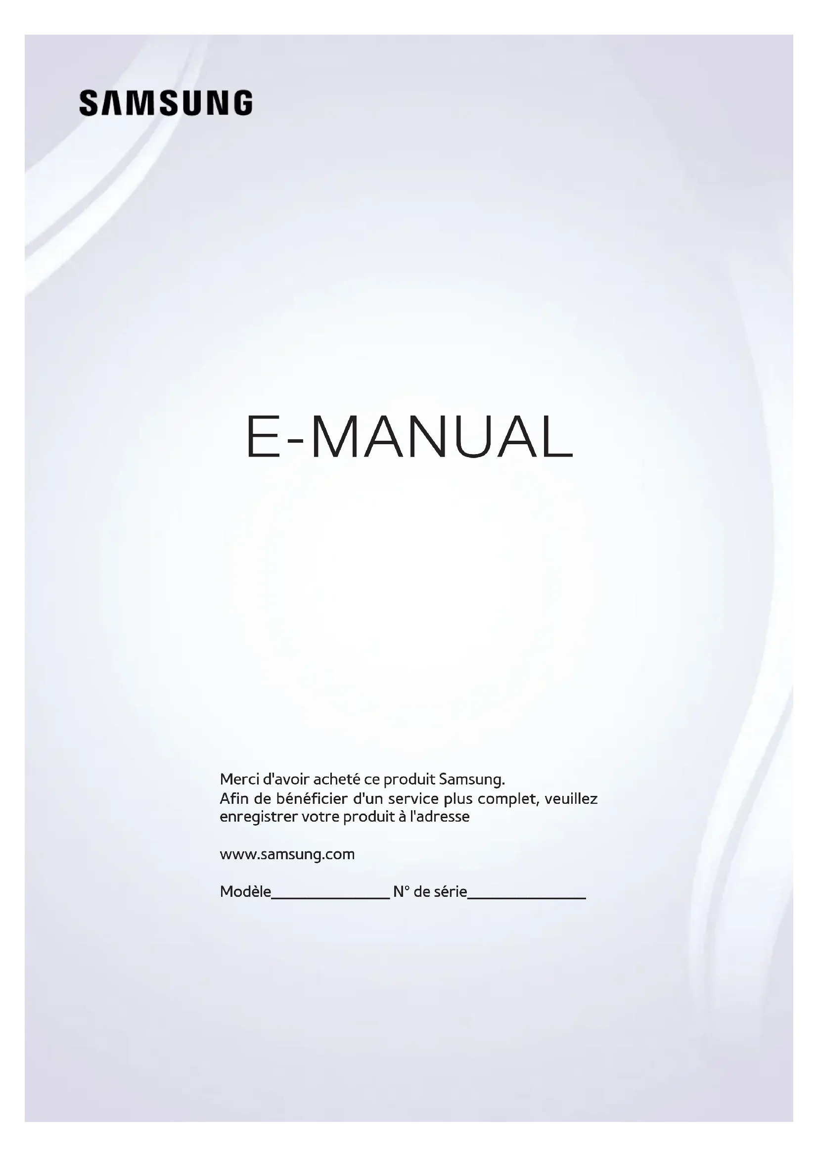 E-MANUAL Merci d'avoir acheté ce produit Samsung. Afin de bénéficier d'un service plus complet, veuillez enregistrer votre produit à l'adresse www.samsung.com Modèle______________ N° de série______________Contenu Guides de démarrage Utilisation de Smart Hub 1 Connexion à Internet 1 Configuration de Smart Hub 1 Utilisation de Smart Hub Commande vocale du téléviseur 2 Configuration de Reconnaissance vocale 3 Commande vocale du téléviseur Commande par mouvement du téléviseur 4 Configuration de Commande par mouv. 5 Contrôle du téléviseur à l'aide de gestes Utilisation du Samsung Smart Control 6 Utilisation du téléviseur avec le bouton POINTER 7 Configuration du Samsung Smart Control 7 Pairage du téléviseur au Samsung Smart Control Amélioration de l'expérience visuelle des événements sportifs 8 Activation de la fonction Mode Sport Modification des chaînes 9 Activation de la fonction Modifier la chaîne 9 Réorganisation ou suppression de chaînes Lecture de plusieurs écrans Connexions Raccordement d'une antenne (Antenne) Connexion à Internet 12 Mise en place d'une connexion câblée à Internet 13 Mise en place d'une connexion sans fil à Internet Connexion à un réseau au moyen d'un dongle mobile Résolution des problèmes de connectivité Internet 16 Résolution des problèmes de connectivité Internet câblée 17 Résolution des problèmes de connectivité Internet sans fil Connexion de périphériques vidéo 18 Connexion à l'aide d'un câble HDMI 19 Connexion à l'aide d'un câble composant 19 Connexion à l'aide d'un câble composite (A/V) Connexions d'entrée et de sortie audio 20 Connexion à l'aide d'un câble HDMI (ARC) 21 Connexion à l'aide d'un câble audio numérique (optique) 21 Connexion à l'aide d'un câble audio stéréo Connexion à un ordinateur 22 Connexion via le port HDMI 23 Connexion à l'aide d'un câble HDMI vers DVI 23 Connexion via votre réseau domestique Connexion d'un périphérique mobile 24 Connexion à l'aide d'un câble MHL vers HDMI 25 Utilisation de Réplication de l'écran 26 Connexion de périphériques mobiles sans routeur sans fil (Wi-Fi Direct) 26 Connexion d'un périphérique mobile via Samsung Smart View Pairage d'un ordinateur portable et du téléviseur - Mise en miroir de PC sans fil (ou KINO TV) Modification du signal d'entrée avec des périphériques externes Remarques sur la connexion 29 Remarque sur la connexion HDMI 30 Remarque sur la connexion des périphériques audio 30 Remarque sur la connexion des ordinateurs 31 Remarque sur la connexion des périphériques mobiles 31 Remarques concernant la connexion pour la mise en miroir de PC sans fil (ou KINO TV) Télécommande et périphériques À propos du Samsung Smart Control Utilisation du Samsung Smart Control 34 Utilisation du téléviseur avec le bouton POINTER 34 Utilisation du téléviseur avec les touches de direction et le bouton Entrer 35 Affichage et utilisation de la télécommande visuelle 37 Pairage du téléviseur au Samsung Smart Control IICommande des périphériques externes à l'aide de la télécommande du téléviseur - Utilisation de la télécommande universelle 37 Réglage de la télécommande universelle Commande du téléviseur à l'aide d'un clavier 38 Connexion d'un clavier 39 Utilisation du clavier Commande du téléviseur à l'aide d'une souris 40 Connexion d'une souris USB 40 Utilisation d'une souris Saisie de texte à l'aide du clavier QWERTY à l'écran 41 Utilisation des autres fonctions Fonctions Smart Affichage de plusieurs écrans ou fonctions avec Multi-Link Screen 42 Utilisation de Multi-Link Screen Smart Hub 44 Supprimer ou épingler un élément dans le groupe Récente 44 Lancement automatique de Smart Hub 44 Test des connexions Smart Hub 45 Utilisation du didacticiel Smart Hub 45 Réinitialisation de Smart Hub Utilisation de Smart Hub avec un Compte Samsung 46 Création d'un compte Samsung 47 Ouverture d'un compte Samsung 47 Association de votre compte Samsung à vos comptes de services externes 48 Modification et ajout d'informations à un compte Samsung 48 Suppression d'un compte Samsung du téléviseur Utilisation du service Mes Applications 49 Gestion des applications téléchargées avec le menu contextuel Options 50 Installation d'une application 50 Suppression d'une application du téléviseur 51 Déplacement des applications 51 Verrouillage et déverrouillage des applications 51 Mise à jour des applications 51 Réorganisation des applications 51 Notation des applications achetées 51 Utilisation des autres caractéristiques et fonctions de l'application Utilisation de l'e-Manual 52 Lancement du manuel électronique 52 Utilisation des boutons du manuel électronique Utilisation du navigateur Web. 53 Préférences de navigation Utilisation du service MON CONTENU 54 À lire avant de lire du contenu multimédia 55 Lecture de contenu multimédia sur un ordinateur ou un périphérique mobile 55 Lecture de contenu multimédia enregistré sur un périphérique USB 56 Boutons et fonctions disponibles pendant le visionnage de photos 58 Boutons et fonctions disponibles pendant le visionnage de vidéos 60 Boutons et fonctions disponibles pendant la lecture de musique 61 Écoute de musique en qualité HD 61 Fonctions de l'écran de liste de contenu multimédia Utilisation du service NewsON 62 Actualités 62 Météo Commande vocale du téléviseur 64 À lire avant d'utiliser la fonction de reconnaissance vocale 64 Apprentissage des principes de base de la reconnaissance vocale 66 Utilisation de la reconnaissance vocale impérative 66 Utilisation de la reconnaissance vocale interactive à une courte distance 66 Utilisation de la reconnaissance vocale longue distance 67 Utilisation du didacticiel de reconnaissance vocale Contrôle du téléviseur à l'aide de gestes (Commande par mouv.) 68 Test de la luminosité ambiante à l'aide de la caméra du téléviseur 69 Activation de la commande par mouvement 72 Modification de la pr