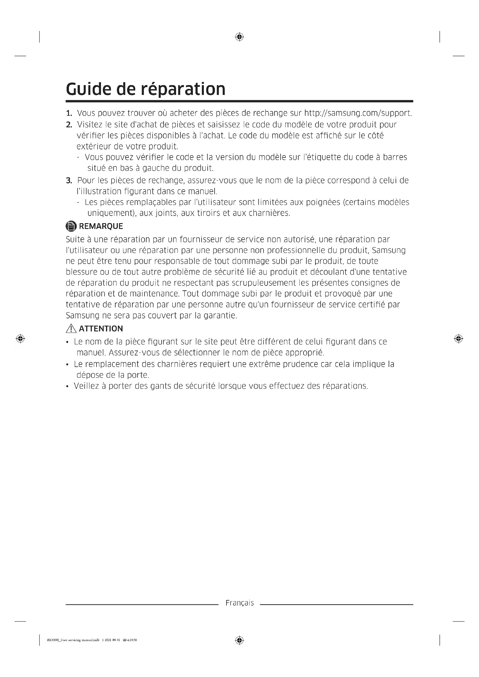 - Veillez à porter des gants de sécurité lorsque vous effectuez des réparations. RB3000J_User-servicing-manual.indb 1 2021-09-01 4:19:56Français L'apparence réelle et les pièces fournies avec le réfrigérateur peuvent varier en fonction du modèle et du pays.