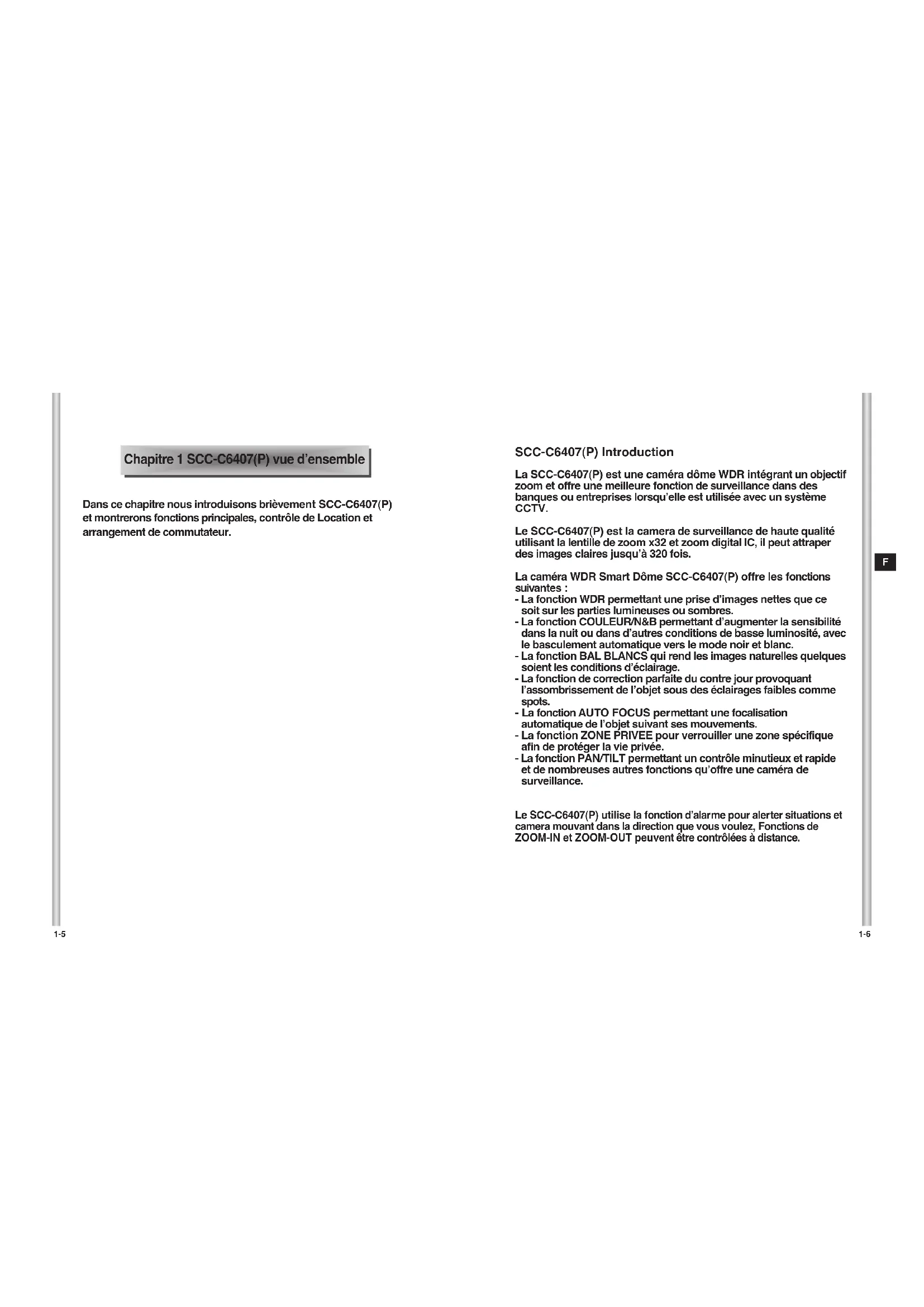 1-1 Avant l’utilisation C’est un mode d’emploi de base pour l’utilisateur de SCC-C6407(P). Il contient toutes les instructions nécessaires pour employer le SCC-C6407(P) d’une introduction simple de la location de contrôle et fonctions de SCC-C6407(P) pour méthodes d ‘installation dans le menu d’installation. Nous recommandons à tous les utilisateurs de SCC-C6407(P) de l’utilisateur avancé qui a employé la camera semblable auparavant à l’utilisateur général de lire le mode d’emploi avant utilisation. La particularité le plus fréquemment employée dans SCC-C6407(P) serait le Menu d’installation de SCC-C6407(P). Le Menu d’installation de SCC-C6407(P) est exprimé en détail dans le chapitre 3 “Vue d’ensemble de Menu d’installation”. Ce manuel d’instruction est le meilleur employé quand on lit du début jusqu’à la fin, mais pour les utilisateurs voulant lire seulement la partie ils ont besoin ici est le chapitre Résumés. “Chapitre 1. Vue d’ensemble” inclut une introduction brève de SCC-C6407(P), noms de partie et fonctions et Arrangement de commutation. “Chapitre 2. SCC-C6407(P) Installation” explique les procédures d’installation de SCC-C6407(P) et fournit préparation et exigences d’environnement d’installation “Chapitre 3. Vue d’ensemble de menu d’installation” présente la structure du menu d’installation pour le SCC-C6407(P) incluant une explication détaillée des fonctions exécutées dans chaque sous-menu. “Annexe SCC-C6407(P) Spécifications de produit” contient spécifications du produit SCC-C6407(P) dans les catégories détaillées.1-4