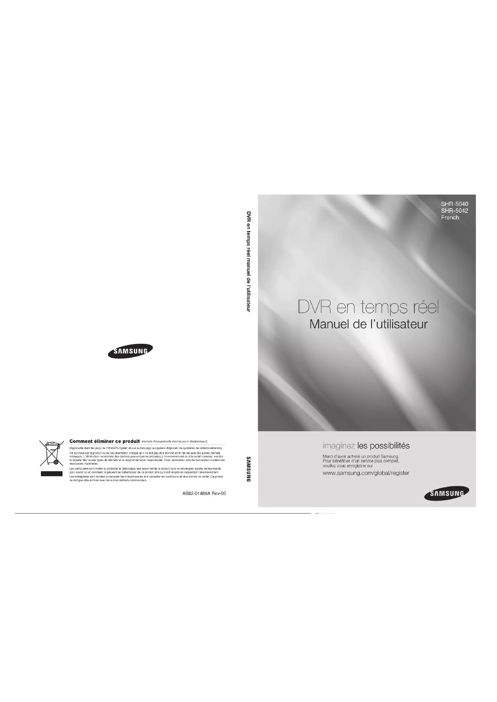 DVR en temps réel Manuel de l’utilisateur Merci d’avoir acheté un produit Samsung. Pour bénéficier d’un service plus complet, veuillez vous enregistrer sur www.samsung.com/global/register imaginez les possibilités SHR-5040 SHR-5042 French DVR en temps réel manuel de l’utilisateur Comment éliminer ce produit (déchets d’équipements électriques et électroniques)(Applicable dans les pays de l’Union Européen et aux autres pays européens disposant de systémes de collecte sélective) Ce symbole sur le produit ou sa documentation indique qu’il ne doit pas être éliminé en fin de vie avec les autres déchets ménagers. L’élimination incontrôlée des déchets pouvant porter préjudice à l’environnement ou à la santé humaine, veuillez le séparer des autres types de déchets et le recycler de façon responsable. Vous favoriserez ainsi la réutilisation durable des ressources matérielles. Les particuliers sont invités à contacter le distributeur leur ayant vendu le produit ou à se renseigner auprès de leur mairie pour savoir où et comment ils peuvent se débarrasser de ce produit afin qu’il soit recyclé en respectant l’environnement. Les entreprises sont invitées à contacter leurs fournisseurs et à consulter les conditions de leur contrat de vente. Ce produit ne doit pas être éliminé avec les autres déchets commerciaux.AB82-01486A Rev-00 SHR_5042_FRA.indb 1 2007-6-15 14:11:33principales caractéristiques de votre DVR L’enregistreur vidéo numérique (DVR) que vous venez d’acquérir compresse l’entrée d’une caméra 4 canaux en une vidéo MPEG4 ; par ailleurs, il offre les fonctions permettant d’enregistrer en temps réel sur un disque dur et de lire le contenu en compressant l’entrée audio 4 canaux avec l’ADPCM. Par ailleurs, par le biais du réseau, il transmet, en temps réel, la vidéo et l ’audio à un appareil externe et permet la surveillance de l’audio et de la vidéo par le biais d’un PC à partir d’un emplacement distant.