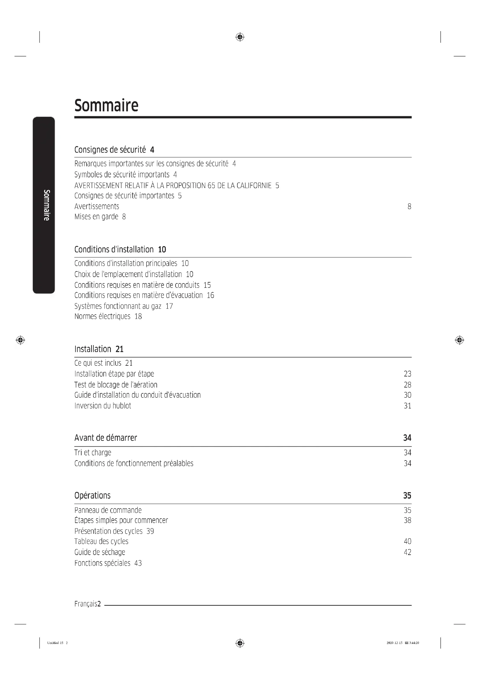 Untitled-15 1 2020-12-15 3:44:20Français2 Sommaire Sommaire Consignes de sécurité 4 Remarques importantes sur les consignes de sécurité 4 Symboles de sécurité importants 4 AVERTISSEMENT RELATIF À LA PROPOSITION 65 DE LA CALIFORNIE 5 Consignes de sécurité importantes 5 Avertissements 8 Mises en garde 8 Conditions d'installation 10 Conditions d'installation principales 10 Choix de l'emplacement d'installation 10 Conditions requises en matière de conduits 15 Conditions requises en matière d’évacuation 16 Systèmes fonctionnant au gaz 17 Normes électriques 18 Installation 21 Ce qui est inclus 21 Installation étape par étape 23 Test de blocage de l'aération 28 Guide d'installation du conduit d'évacuation 30 Inversion du hublot 31 Avant de démarrer 34 Tri et charge 34 Conditions de fonctionnement préalables 34 Opérations 35 Panneau de commande 35 Étapes simples pour commencer 38 Présentation des cycles 39 Tableau des cycles 40 Guide de séchage 42 Fonctions spéciales 43 Untitled-15 2 2020-12-15 3:44:20Français 3 Sommaire Maintenance 46 Nettoyage 46 Dépannage 47 Contrôles à effectuer 47 Codes d'erreur 51 Caractéristiques techniques 52 Tableau des symboles textiles 52 Protection de l’environnement 53 Fiche de spécications 54 Untitled-15 3 2020-12-15 3:44:20CONSERVEZ SOIGNEUSEMENT CES CONSIGNES Français4 Consignes de sécurité Félicitations pour l’achat de votre nouveau sèche-linge Samsung. Ce manuel contient de précieuses informations concernant l'installation, l'utilisation et l'entretien de votre appareil. Prenez le temps de le lire pour tirer pleinement prot de tous les avantages et de toutes les fonctionnalités de votre sèche-linge. Remarques importantes sur les consignes de sécurité Veuillez lire attentivement ce manuel an d'utiliser cet appareil en toute sécurité et de proter pleinement de toutes ses fonctionnalités. Conservez ce manuel dans un endroit sûr situé à proximité de l'appareil an de pouvoir facilement vous y reporter en cas de besoin. N'utilisez pas cet appareil autrement que pour l'usage auquel il est destiné, conformément aux consignes du manuel. Les consignes de sécurité et les avertissements décrits dans ce manuel ne sont pas exhaustifs. Il est de votre responsabilité de faire preuve de bon sens, de prudence et de discernement lors de l'installation, de l'entretien ou de l'utilisation de votre sèche-linge. Ces consignes d'utilisation couvrant plusieurs modèles, il se peut que les caractéristiques de votre sèche-linge diffèrent légèrement de celles décrites dans ce manuel ; ainsi, certaines icônes d'avertissement peuvent ne pas s'appliquer à votre machine. Pour toute question, contactez votre centre de service le plus proche ou connectez- vous sur www.samsung.com. Symboles de sécurité importants Signication des icônes et signes repris dans ce manuel d'utilisation : AVERTISSEMENT Risques ou pratiques inadaptées susceptibles de causer des blessures graves, la mort et/ou des dommages matériels. ATTENTION Risques ou pratiques inadaptées susceptibles de causer des blessures et/ou des dommages matériels. REMARQUE Indique qu'il existe un risque de blessures ou de dommages matériels. Consignes de sécurité Untitled-15 4 2020-12-15 3:44:20CONSERVEZ SOIGNEUSEMENT CES CONSIGNES Français 5 Consignes de sécurité Ces symboles d'avertissement ont pour but d'éviter tout risque de blessure corporelle. Respectez-les en toutes circonstances. Lisez attentivement ce manuel et conservez-le en lieu sûr an de pouvoir le consulter ultérieurement. Lisez attentivement toutes les consignes avant d'utiliser l'appareil. Comme avec tout équipement électrique ou comportant des parties mobiles, il existe un certain nombre de dangers potentiels. Pour utiliser cet appareil en toute sécurité, familiarisez-vous avec son fonctionnement et restez prudent lorsque vous l'employez. AVERTISSEMENT - Risque d'incendie