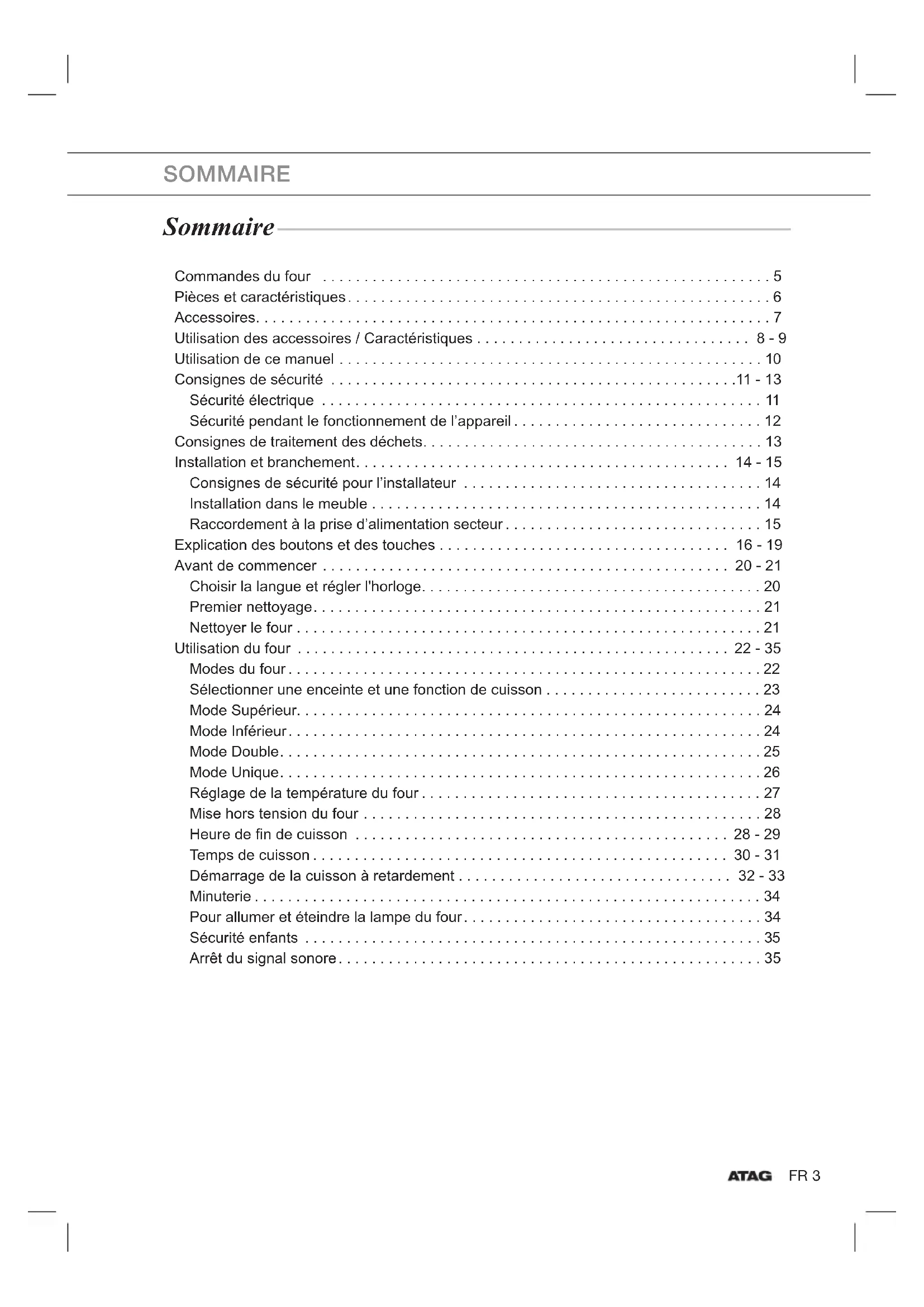 Merci d’avoir choisi un four encastrable ATAG. Ce manuel d’utilisation contient des informations importantes en matière de sé- curité et vous fournit des instructions vous aidant à faire fonctionner l’appareil et à assurer son entretien. Veuillez lire très attentivement ce manuel d’utilisation avant d’utiliser votre four et conservez-le précieusement en vue d’une consultation ultérieure.FR 11 L’installation de ce four doit être prise en charge uniquement par un électricien qualifi é. Le technicien est chargé de brancher l’appareil à la prise d’alimentation secteur conformément aux conseils de sécurité spécifi ques. Sécurité électrique Si le four a été endommagé pendant le transport, ne le branchez pas. ● Ce four doit être relié à la prise d’alimentation secteur uniquement par un électricien qualifi é. ● En cas de panne ou de dommages, faites réparer votre four par un professionnel avant de l’utiliser. ● Toute réparation doit être effectuée uniquement par un technicien qualifi é. Une réparation inadéquate présente un risque réel pour vous et pour les autres. Si votre four nécessite une réparation, contactez un service après-vente ATAG ou votre revendeur. ● Si le cordon d’alimentation est défectueux, il doit être remplacé par un composant ou un câble spécial disponible chez votre fabricant ou un réparateur agréé. ● Aucun fi l ni aucun câble électrique ne doit être en contact avec le four. ● Le four doit être branché sur l'alimentation secteur en utilisant un disjoncteur ou fusible agréé. Ne jamais utiliser plusieurs adaptateurs câbles de raccord. ● La plaque signalétique est située sur le côté droit de la porte. ● Il convient de mettre l’appareil hors tension lorsque celui-ci est en cours de réparation ou de nettoyage. ● Soyez prudent lorsque vous branchez des appareils électriques sur une prise située à proximité du four. ● ATTENTION : L’appareil et ses parties accessibles s’échauffent durant l’utilisation. Attention à ne pas toucher les éléments chauffants. Les enfants de moins de 8 ans doivent être tenus à l’écart de l’appareil, ou surveillés sans relâche. ● Cet appareil peut être utilisé par des enfants de plus de 8 ans, ainsi que par des personnes ayant un handicap physique, sensoriel, mental ou moteur, et par des personnes