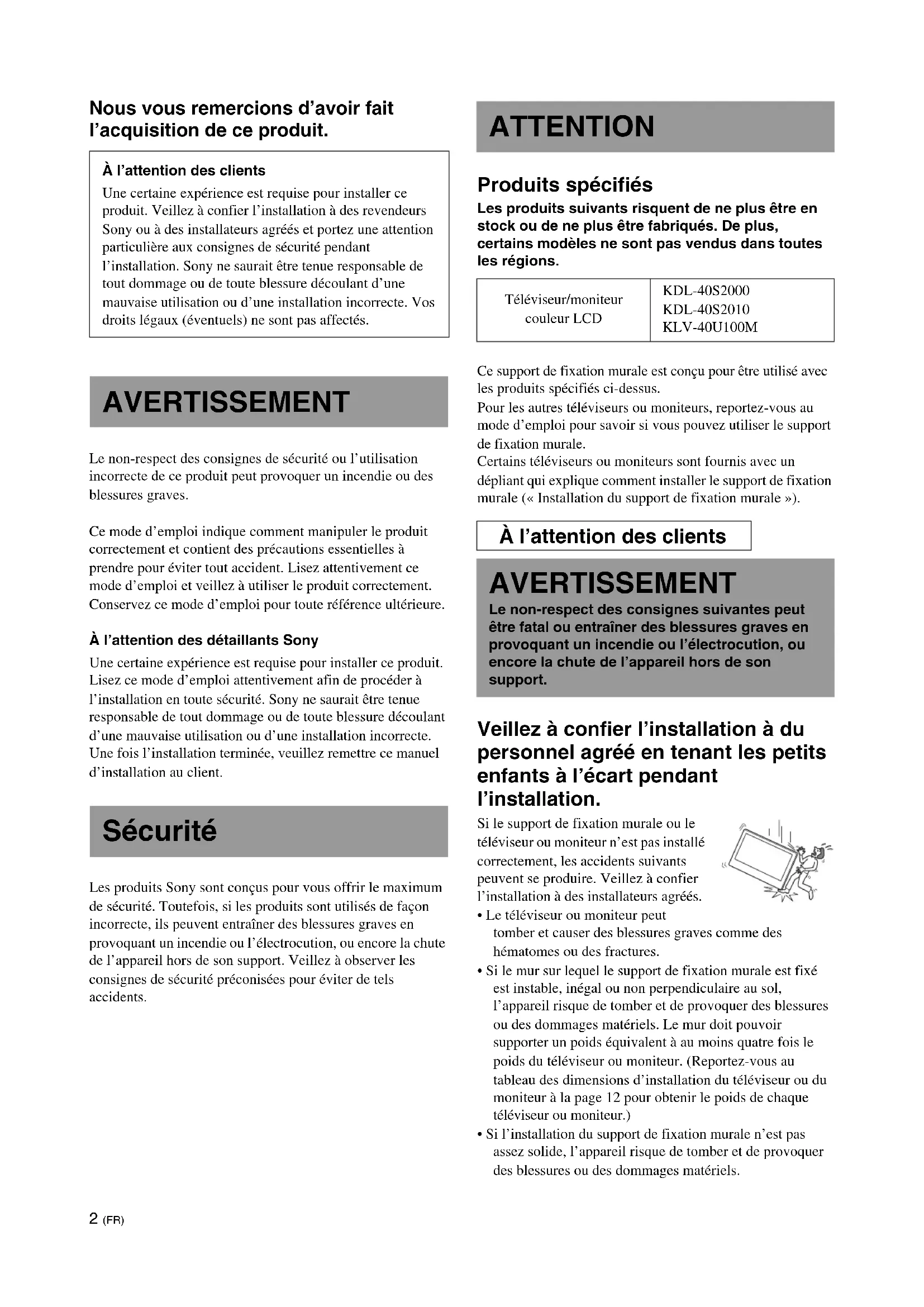 - Si l’installation du support de fixation murale n’est pas assez solide, l’appareil risque de tomber et de provoquer des blessures ou des dommages matériels. À l’attention des clients Une certaine expérience est requise pour installer ce produit. Veillez à confier l’installation à des revendeurs Sony ou à des installateurs agréés et portez une attention particulière aux consignes de sécurité pendant l’installation. Sony ne saurait être tenue responsable de tout dommage ou de toute blessure découlant d’une mauvaise utilisation ou d’une installation incorrecte. Vos droits légaux (éventuels) ne sont pas affectés. AVERTISSEMENT Sécurité ATTENTION Téléviseur/moniteur couleur LCD KDL-40S2000 KDL-40S2010