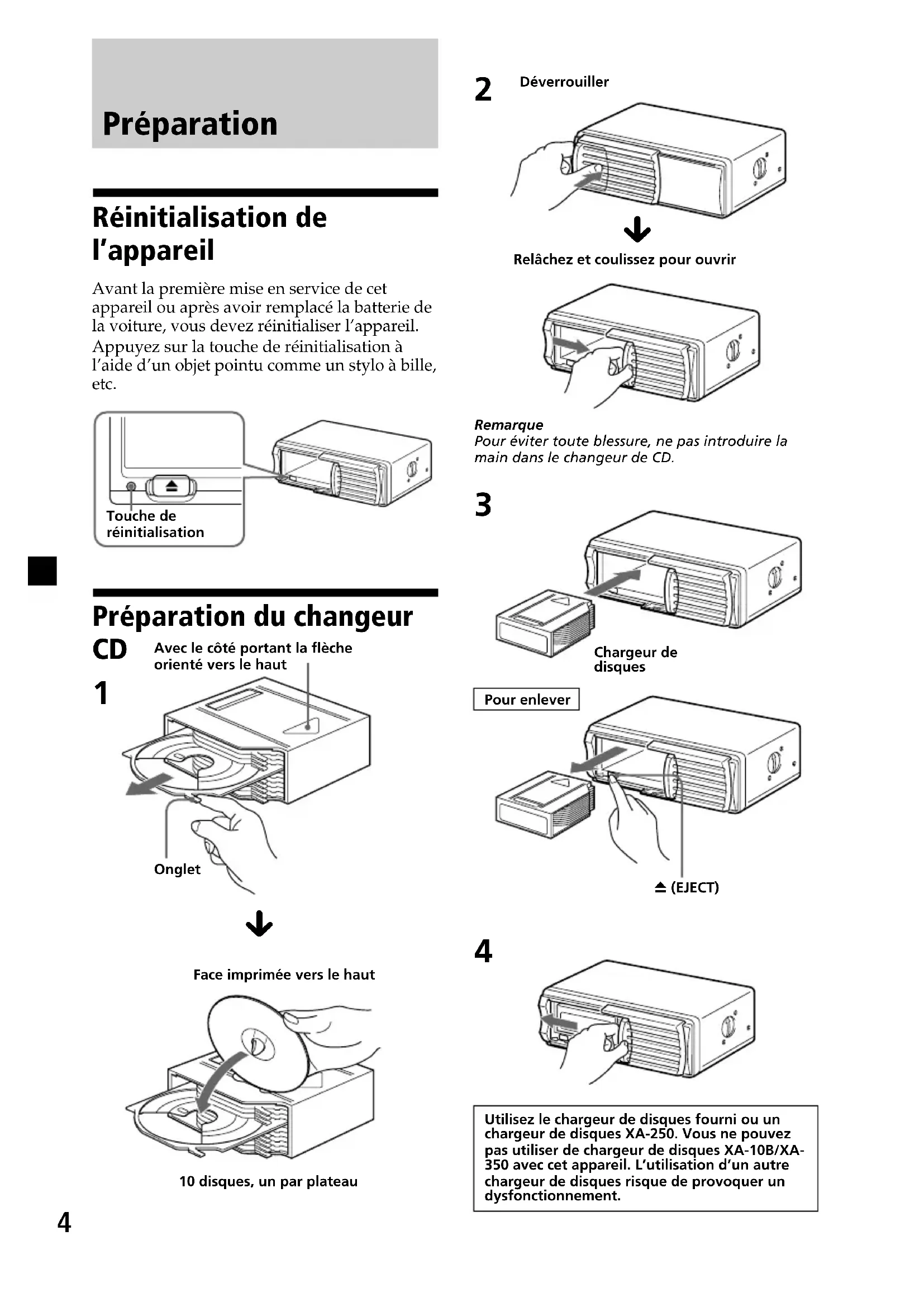 Chargeur de disques Pour enlever Z (EJECT) Touche de réinitialisation Déverrouiller Relâchez et coulissez pour ouvrir Onglet