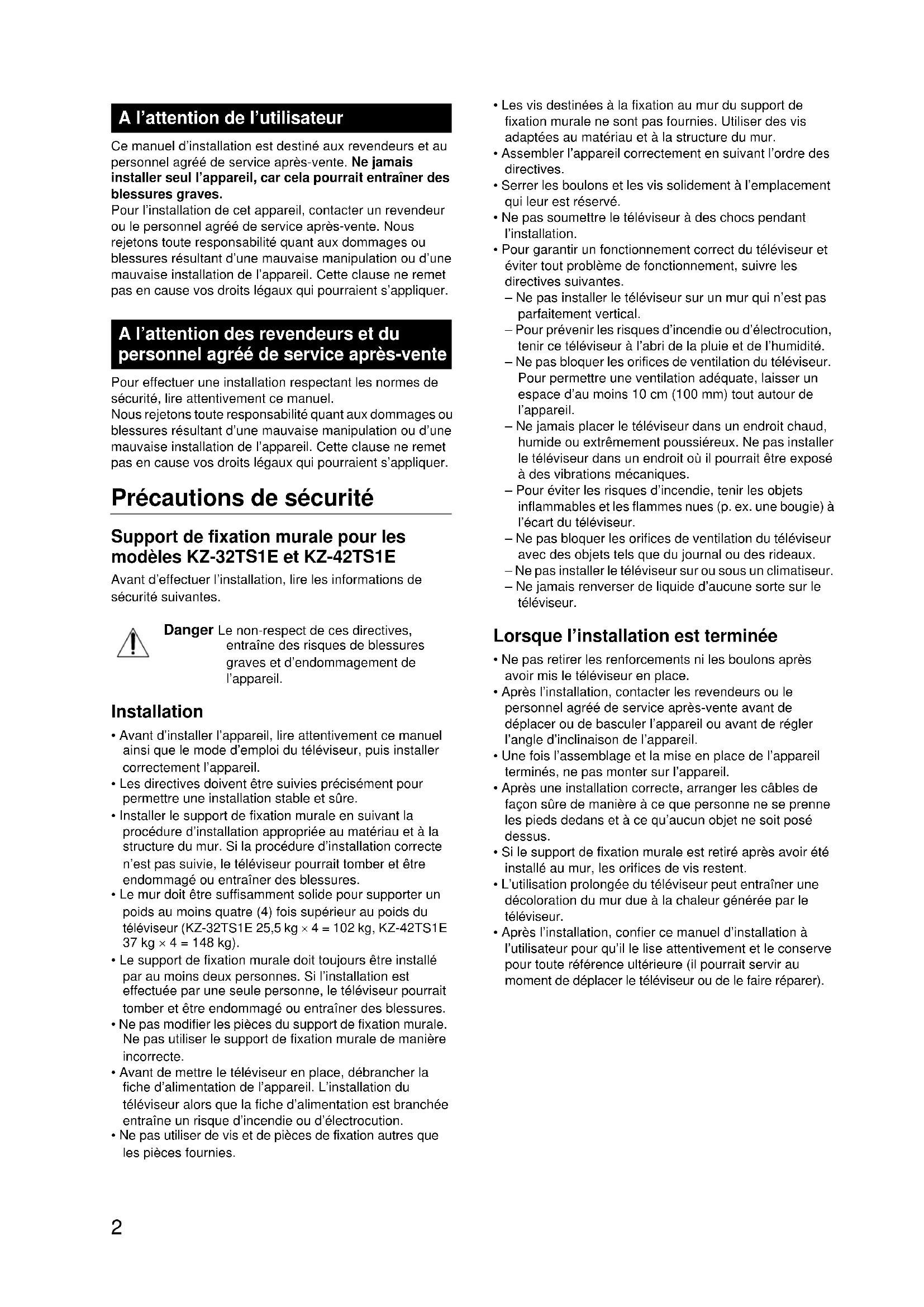 - Le mur doit être suffisamment solide pour supporter un poids au moins quatre (4) fois supérieur au poids du téléviseur (KZ-32TS1E 25,5 kg × 4 = 102 kg, KZ-42TS1E 37 kg × 4 = 148 kg).