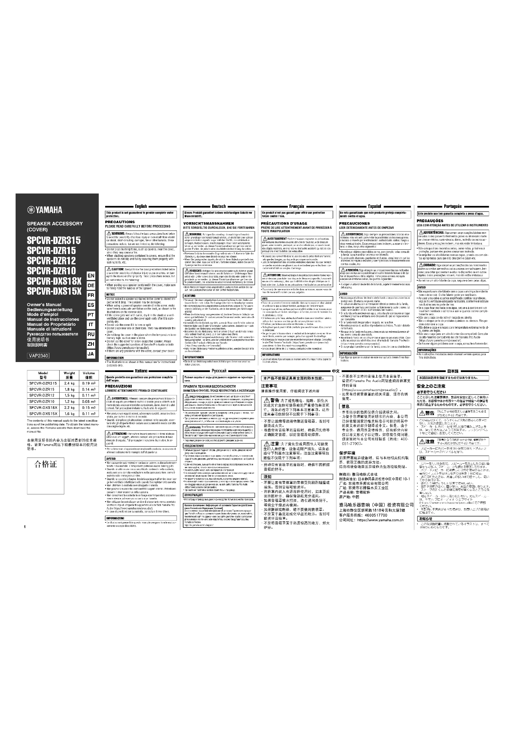 Français PRÉCAUTIONS D’USAGEPRIÈRE DE LIRE ATTENTIVEMENT AVANT DE PROCÉDER À TOUTE MANIPULATION• Ne placez pas à proximité de la housse des objets présentant une flamme, tels que des bougies, au risque de provoquer un incendie.• Lors de l’empilement des enceintes emballées dans leur housse, veillez à ce que les enceintes ne glissent pas et ne tombent pas en les fixant cor-rectement à l’aide de sangles d’arrimage.• Pour manipuler une enceinte emballée dans sa housse, assurez-vous de tenir fermement l’enceinte par ses poignées.• Évitez de soumettre l’enceinte emballée dans sa housse à un choc violent et veillez à ne pas la laisser tomber, au risque de l’endommager.• Lorsque vous utilisez un haut-parleur amplifié revêtu de sa housse, assu-rez-vous que la ventilation est adéquate à l’arrière, comme le montrent les illustrations au verso.• Si la housse a pris l’eau, séchez-la à l’ombre dans un endroit bien aéré et utilisez-la à nouveau une fois qu’elle est complètement sèche.• N’utilisez pas la housse si elle est déchirée ou fendue.• Ne la placez pas à proximité de produits gras ou chimiques. Cela pourrait la détériorer.• Ne gardez pas la housse dans un endroit où la température est extrême-ment élevée, comme par exemple, près d’un appareil de chauffage.• N’utilisez pas la housse pour une enceinte non prise en charge. Consultez le site Web Yamaha Pro Audio (https://www.yamaha.com/proaudio/) pour obtenir la liste des enceintes compatibles.• En cas de problème lié à la housse, contactez votre revendeur.• Les illustrations figurant dans ce manuel servent uniquement à expliciter les instructions.Ce produit n’est pas garanti pour offrir une protection totale contre l’eau.AVERTISSEMENT: Veillez à toujours respecter les précautions élémentaires énumérées ci-après afin d’éviter tout risque de blessure grave, voire mortelle, provoqué par un choc électrique, un court-circuit, des dégâts matériels, un incendie ou tout autre accident. La liste de ces précautions n’est toutefois pas exhaustive:ATTENTION: Observez toujours les précautions élémentaires repri-ses ci-dessous pour éviter tout risque de blessure corporelle, à vous-mê-me ou votre entourage, ainsi que la détérioration du périphérique ou de tout autre bien. La liste de ces précautions n’est toutefois pas exhaustive: AVIS INFORMATIONS Português PRECAUÇÕESLEIA COM ATENÇÃO ANTES DE UTILIZAR O INSTRUMENTO• Não coloque itens incandescentes, como velas, próximos à proteção, porque eles podem causar um incêndio.• Se empilhar os alto-falantes com as capas, prenda-os com cin-tas apropriadas para que não deslizem e caiam etc.• Ao retirar um alto-falante da capa, segure-o bem pelas alças.• Não exponha um alto-falante com a capa a um impacto violento nem o deixe cair. O alto-falante pode ser danificado.• Ao usar uma caixa acustica amplificada contida na protecao, veja se ha ventilacao adequada na traseira, conforme mostrado nas ilustracoes na parte de tras.• Se a capa ficar molhada com água, seque-a à sombra em um local bem ventilado e só volte a usá-la quando estiver comple-tamente seca.• Não use a capa se ela estiver rasgada ou aberta.• Não a coloque perto de produtos químicos ou oleosos. Eles po-dem deteriorar a capa.• Não deixe a capa em locais com temperatura extremamente al-ta, como um fogão.• Não use a capa para um alto-falante não compatível. Consulte os alto-falantes compatíveis no site Yamaha Pro Audio (https://www.yamaha.com/proaudio/).• Se houver algum problema com a capa, consulte o fornecedor.• As ilustrações mostradas neste manual servem apenas para fins instrutivos.Este produto nao tem garantia completa a prova d’agua. ADVERTÊNCIAS: Siga sempre as precauções básicas men- cionadas abaixo para evitar ferimentos graves ou até mesmo morte por choque elétrico, curto-circuito, danos, incêndio ou outros aci- dentes. Essas precauções incluem, mas não estão limitadas a: CUIDADO: Siga sempre as precauções básicas mencionadas abaixo para evitar que você ou outras pessoas se machuquem, bem como para evitar que ocorram avarias no dispositivo ou em outros objetos. Essas precauções incluem, mas não estão limitadas a: AVISOINFORMAÇÕES Español