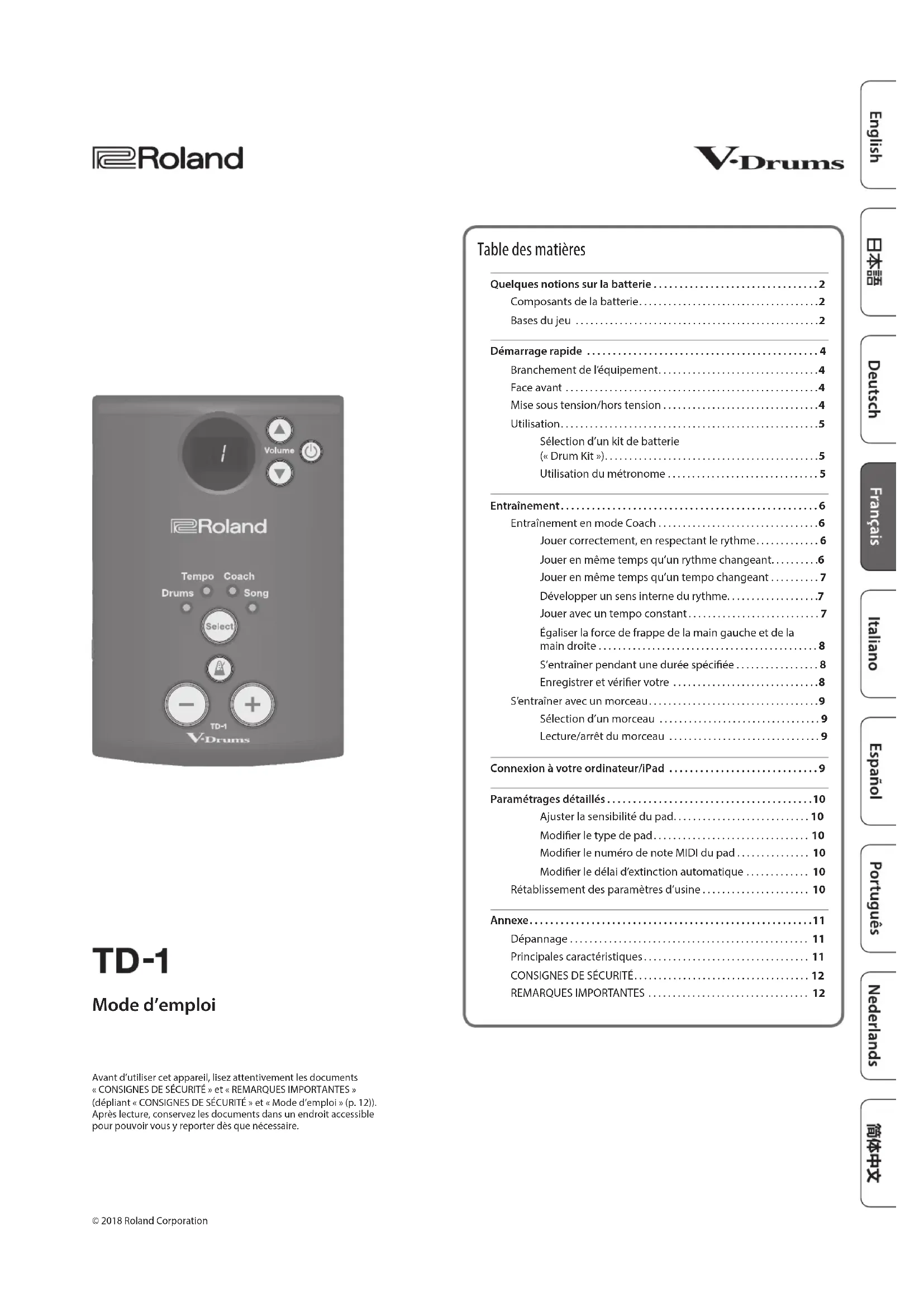 rétablissement des paramètres d’usine.Pour annuler un rétablissement des paramètres d’usine, appuyez sur le bouton [L] (marche/arrêt) et mettez l’appareil hors tension.11 Annexe Dépannage Problème Points à vérier Action Problèmes avec le son Aucun son Le TD-1 est-il correctement connecté aux périphériques externes? Vériez les connexions. Le câble est-il branché sur une prise de sortie (au lieu de l’entrée) du haut-parleur amplié connecté? Les câbles sont-ils correctement branchés sur la prise OUTPUT/PHONES ? Un câble audio est-il endommagé? Essayez d’utiliser un autre câble. Vériez si vous entendez un son dans le casque. Si vous entendez un son dans le casque, il y a un problème avec les câbles de connexion ou avec le haut-parleur amplié connecté. Le volume du TD-1 est-il réglé sur un niveau très faible? Réglez le volume sur un niveau approprié. Le volume du haut-parleur amplié connecté est-il réglé sur un niveau très faible? Le volume du périphérique connecté à la prise MIX IN est-il réglé sur un niveau très faible? Le câble est-il correctement branché au connecteur TRIGGER INPUT? Vériez les connexions. Aucun son sur un pad spécique Les câbles sont-ils correctement branchés à chacun des pads et chacune des pédales? La sensibilité du pad a-t-elle été diminuée? Ajustez la sensibilité du pad. Le type du pad est-il correctement déni? Dénissez le type de pad. Aucun son lorsque vous appuyez sur la pédale de grosse caisse Le câble étiqueté KIK est-il connecté à la pédale de grosse caisse? Vériez les connexions. Aucun son lorsque vous appuyez sur la pédale de charleston Le câble étiqueté HHC est-il connecté à la pédale de charleston? Le charleston ne se ferme pas complètement Deux ressorts ont-ils été installés sur la pédale de contrôle charleston? Si deux ressorts sont installés, vous pouvez choisir une sensation plus légère en retirant l’un d’entre eux. Par contre, le bruit et la vibration augmenteront. Pour savoir comment retirer un ressort, consultez la section «Ajuster la pédale de contrôle charleston» dans le Guide d’installation. Le son Pied fermé n’est pas assez fort Le son Bascule (foot splash) est dicile à produire Le son d’un autre pad est également audible lorsque vous frappez sur le pad. Si plusieurs pads sont connectés au même pied, la vibration d’une frappe peut être transmise à un autre pad, entraînant une émission accidentelle de son. Fixez le pad à un autre emplacement. Lorsque vous frappez une fois, vous entendez deux notes ou davantage Le pad est-il bien xé au pied? Fixez solidement le pad au pied. Manque de abilité dans l’émission des sons La peau maillée du pad est-elle tendue de manière homogène? Réglez la tension de la peau maillée. Une tension légèrement supérieure favorise un déclenchement adéquat. Problèmes avec la connexion USB Échec de la connexion avec unordinateur Le câble USB est-il correctement branché? Assurez-vous que le câble USB est correctement branché. Problèmes avec MIDI Aucun son depuis le périphérique MIDI externe Le canal MIDI est-il correctement réglé? Réglez le canal MIDI du périphérique MIDI externe sur 10. Le numéro de note a-t-il été correctement conguré ? Vériez le numéro de note sur le pad. Principales caractéristiques Roland TD-1: Drum Sound Module Kits de batterie 15 Morceaux 15 Écran 7 segments, 3 caractères (LED) Interface USB MIDI (transmission uniquement) Alimentation électrique Adaptateur secteur Consommation 150 mA Dimensions 106 (L) x 43 (P) x 181 (H) mm Poids (hors adaptateur secteur) 236 g Accessoires Mode d’emploi Dépliant «CONSIGNES DE SÉCURITÉ» Adaptateur secteur Cordon d’alimentation