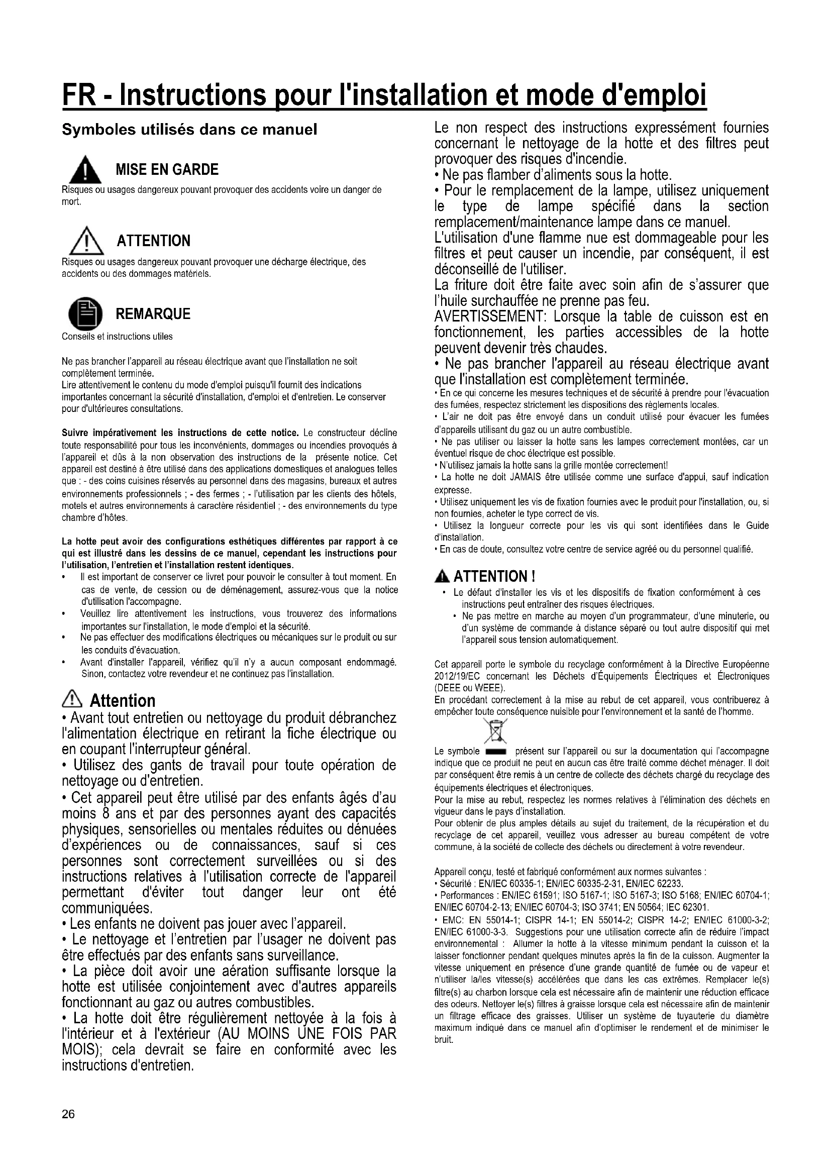 - EMC: EN 55014-1; CISPR 14-1; EN 55014-2; CISPR 14-2; EN/IEC 61000-3-2; EN/IEC 61000-3-3. Suggestions pour une utilisation correcte afin de réduire l’impact environnemental : Allumer la hotte à la vitesse minimum pendant la cuisson et la laisser fonctionner pendant quelques minutes après la fin de la cuisson. Augmenter la vitesse uniquement en présence d’une grande quantité de fumée ou de vapeur et n’utiliser la/les vitesse(s) accélérées que dans les cas extrêmes. Remplacer le(s) filtre(s) au charbon lorsque cela est nécessaire afin de maintenir une réduction efficace des odeurs. Nettoyer le(s) filtres à graisse lorsque cela est nécessaire afin de maintenir un filtrage efficace des graisses. Utiliser un système de tuyauterie du diamètre maximum indiqué dans ce manuel afin d’optimiser le rendement et de minimiser le bruit.27 Utilisation Cette hotte prévue pour l’aspiration des fumées et vapeurs de cuisson est destinée à un usage exclusivement domestique. La hotte est réalisée de façon qu’elle puisse être utilisée en version aspirante à évacuation extérieure, ou filtrante à recyclage intérieur. Version aspirante Les vapeurs sont évacuées vers l'extérieur à travers un conduit d'évacuation fixé à la bride de raccord qui se trouve au-dessus de la hotte. ATTENTION! Le tuyau d’évacuation n’est pas fourni et doit être acheté à part. Le diamètre du tuyau d'évacuation doit être égal à celui de la bride de raccord. ATTENTION! Si la hotte est équipée d'un filtre à charbon, ce dernier doit être enlevé. Relier la hotte aux tubes et trous d’évacuation de la paroi d’un diamètre équivalent à la sortie de l’air (collier de raccord). L’utilisation de tubes et des trous d'évacuation à paroi avec un diamètre inférieur entraînera une diminution des performances d’aspiration et une nette augmentation du bruit. Nous déclinons toute responsabilité à cet égard. ! Utiliser un tuyau de la longueur strictement nécessaire. ! Les coudes du tuyau doivent être en nombre minime (angle maxi du coude: 90°). ! Éviter les variations excessives de section du tuyau. Version filtrante L'air d'aspiration sera dégraissé et désodorisé avant d'être renvoyé dans la pièce. Pour utiliser la hotte dans cette version, vous devez installer un système de filtrage supplémentaire basé sur charbon actif.