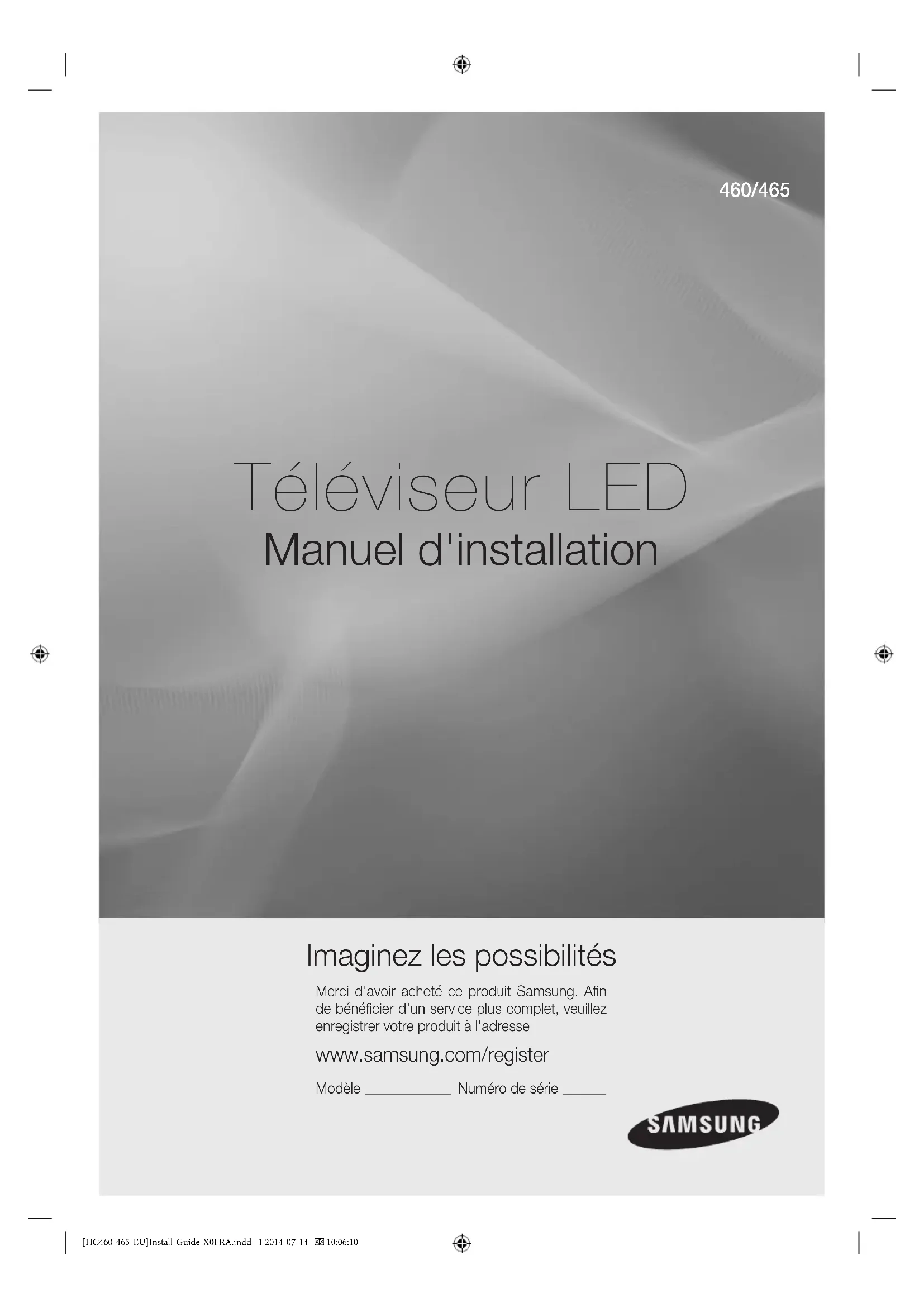 Téléviseur LED Manuel d'installation Imaginez les possibilités Merci d'avoir acheté ce produit Samsung. Afin de bénéficier d'un service plus complet, veuillez enregistrer votre produit à l'adresse www.samsung.com/register Modèle Numéro de série 460/465 [HC460-465-EU]Install-Guide-X0FRA.indd 1 2014-07-14 10:06:10Les schémas et illustrations contenus dans ce manuel de l'utilisateur sont fournis uniquement à titre de référence. L'aspect réel du produit peut être différent. La conception et les spécifications du produit sont susceptibles d'être modifiées sans notification préalable. Avertissement relatif aux images fixes Evitez d'afficher des images fixes (comme des fichiers images .jpeg) ou des éléments images fixes (logos de programme de télévision, images panoramiques ou au format 4:3, barres de cotations ou d'infos au bas de l'écran, etc.) sur l'écran. L'affichage permanent d'images fixes risque, en effet, d'entraîner une usure irrégulière du phosphore d'écran, ce qui peut se traduire par une dégradation de la qualité d'image. Pour atténuer les risques, suivez scrupuleusement les recommandations suivantes: