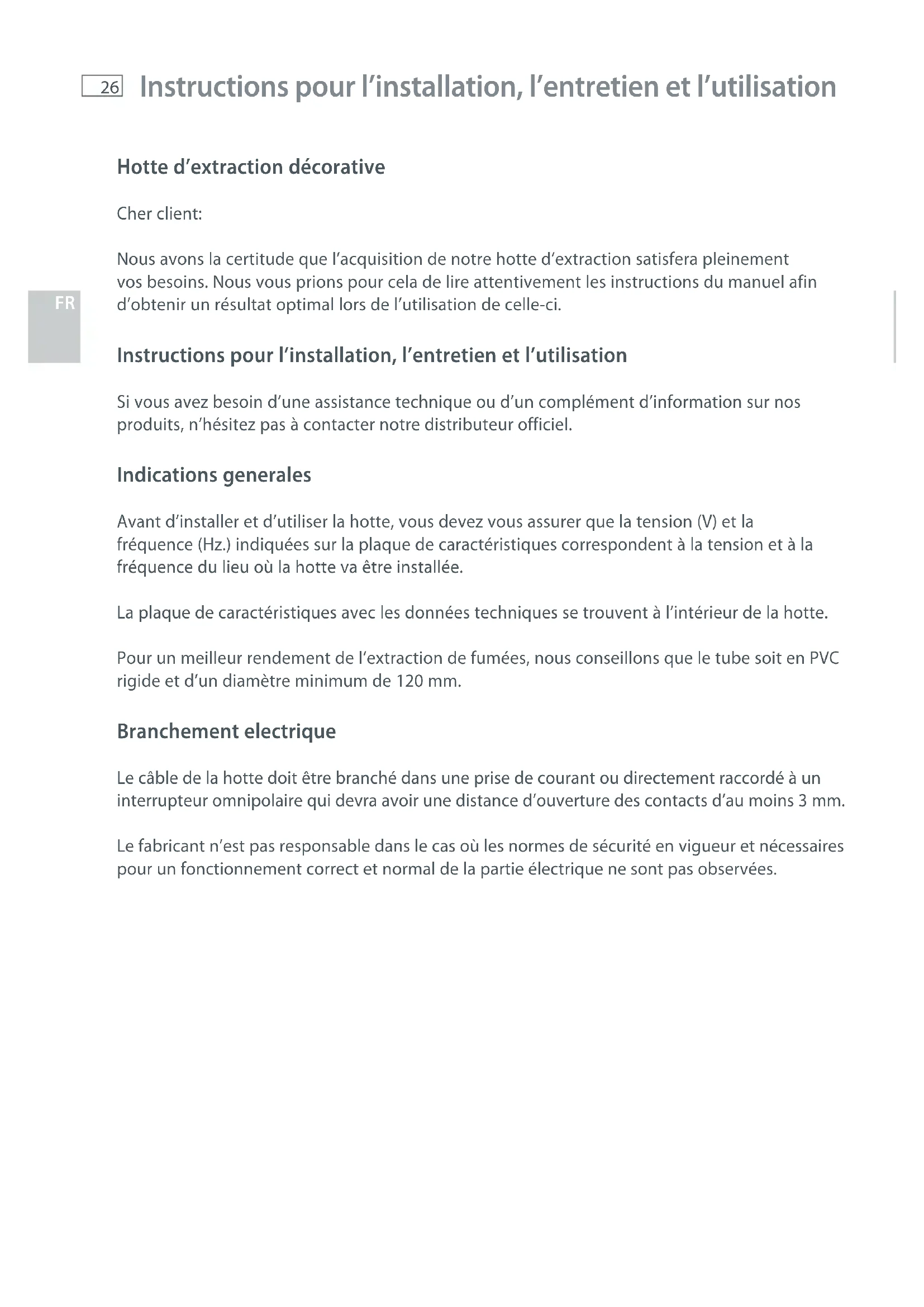 Instructions pour l’installation, l’entretien et l’utilisation Hotte d’extraction décorative Cher client: Nous avons la certitude que l’acquisition de notre hotte d’extraction satisfera pleinement vos besoins. Nous vous prions pour cela de lire attentivement les instructions du manuel afin d’obtenir un résultat optimal lors de l’utilisation de celle-ci. Instructions pour l’installation, l’entretien et l’utilisation Si vous avez besoin d’une assistance technique ou d’un complément d’information sur nos produits, n’hésitez pas à contacter notre distributeur officiel. Indications generales Avant d’installer et d’utiliser la hotte, vous devez vous assurer que la tension (V) et la fréquence (Hz.) indiquées sur la plaque de caractéristiques correspondent à la tension et à la fréquence du lieu où la hotte va être installée. La plaque de caractéristiques avec les données techniques se trouvent à l’intérieur de la hotte. Pour un meilleur rendement de l’extraction de fumées, nous conseillons que le tube soit en PVC rigide et d’un diamètre minimum de 120 mm. Branchement electrique Le câble de la hotte doit être branché dans une prise de courant ou directement raccordé à un interrupteur omnipolaire qui devra avoir une distance d’ouverture des contacts d’au moins 3 mm. Le fabricant n’est pas responsable dans le cas où les normes de sécurité en vigueur et nécessaires pour un fonctionnement correct et normal de la partie électrique ne sont pas observées.27
