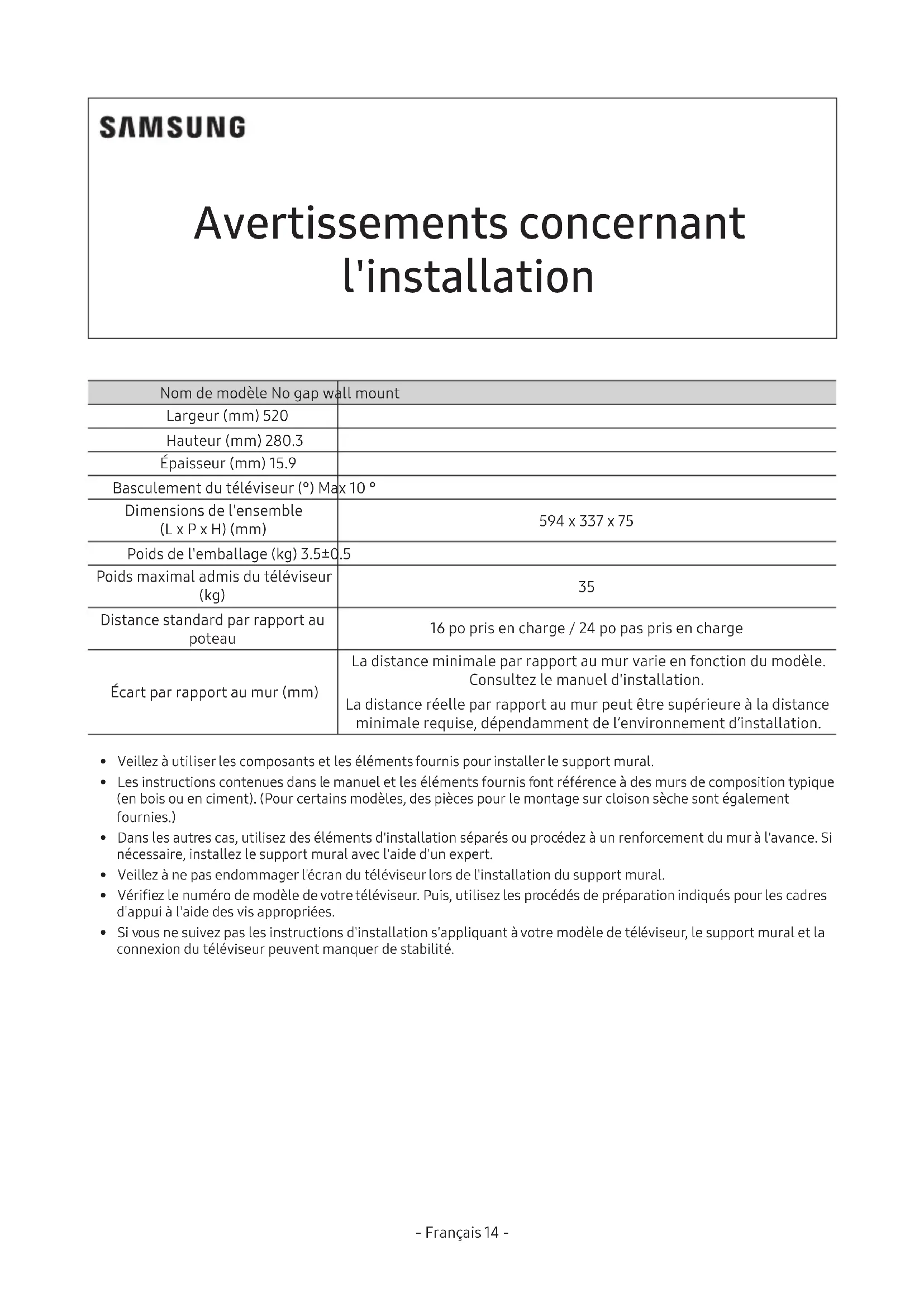 – 케이블을 안보이게 벽에 매립할 경우 전문설치업자에게 문의하세요.- Français 14 - - Français 15 - Avertissements concernant l'installation Nom de modèle No gap wall mount Largeur (mm) 520 Hauteur (mm) 280.3 Épaisseur (mm) 15.9 Basculement du téléviseur (°) Max 10° Dimensions de l'ensemble (L x P x H) (mm) 594 x 337 x 75 Poids de l'emballage (kg) 3.5±0.5 Poids maximal admis du téléviseur (kg)