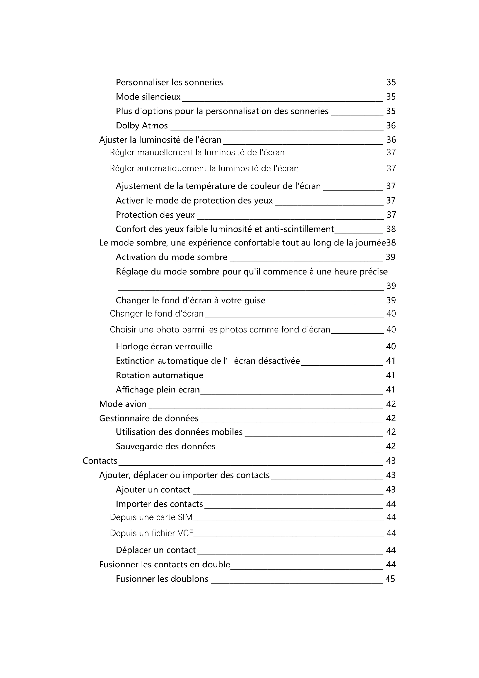 Changer le fond d'écran à votre guise _______________________________ 39 Changer le fond d'écran _______________________________________________ 40 Choisir une photo parmi les photos comme fond d'écran ______________ 40 Horloge écran verrouillé _____________________________________________ 40 Extinction automatique de l’écran désactivée ______________________ 41 Rotation automatique ________________________________________________ 41 Affichage plein écran _________________________________________________ 41 Mode avion _______________________________________________________________ 42 Gestionnaire de données _________________________________________________ 42 Utilisation des données mobiles _____________________________________ 42 Sauvegarde des données ____________________________________________ 42 Contacts _______________________________________________________________________ 43 Ajouter, déplacer ou importer des contacts ______________________________ 43 Ajouter un contact ___________________________________________________ 43 Importer des contacts ________________________________________________ 44 Depuis une carte SIM __________________________________________________ 44 Depuis un fichier VCF __________________________________________________ 44 Déplacer un contact __________________________________________________ 44 Fusionner les contacts en double _________________________________________ 44 Fusionner les doublons ______________________________________________ 45Séparer des contacts fusionnés ______________________________________ 45 Exporter, sauvegarder ou restaurer des contacts _________________________ 45 Exporter vos contacts ________________________________________________ 45 Activer ou désactiver la sauvegarde automatique ___________________ 46 Restaurer les contacts à partir des sauvegardes _____________________ 46 Autres méthodes de sauvegarde et de restauration _________________ 46 Modifier ou supprimer des contacts ______________________________________ 46 Modifier les détails d'un contact _____________________________________ 47 Ajouter un contact à vos favoris _____________________________________ 47 Supprimer un contact ________________________________________________ 47 Annuler des modifications apportées à des contacts ________________ 47 Bloquer des contacts _________________________________________________ 48 Afficher les numéros bloqués ________________________________________ 48 Afficher, grouper et partager des contacts _______________________________ 48 Consulter vos contacts _______________________________________________ 49 Contacter une personne _____________________________________________ 49 Créer un groupe ______________________________________________________ 49 Modifier une adresse e-mail par défaut _____________________________ 49 Supprimer des contacts d'un groupe ________________________________ 50 Partager vos contacts ________________________________________________ 50 Afficher vos coordonnées ____________________________________________ 50 Sauvegarder et synchroniser les contacts d'un appareil _________________ 50 Sauvegarder et synchroniser les contacts d'un appareil _____________ 51 Qu'en est-il des contacts de la carte SIM et de ceux synchronisés avec d'autres services cloud ? _____________________________________________ 51 Arrêter d'enregistrer les contacts de l'appareil en tant que contacts Google et déplacer des contacts hors de votre compte Google _____ 52 Modifier les contacts enregistrés et suggérés ____________________________ 52 Qui apparaît dans vos suggestions __________________________________ 52 Contrôler les personnes enregistrées en tant que contacts _________ 52 Ajouter des contacts vous-même ______________________________________ 53 Enregistrer les coordonnées des personnes avec lesquelles vous interagissez ____________________________________________________________ 53 Activer ou désactiver l'enregistrement automatique ___________________ 53 Modifier ou supprimer des contacts _________________________________ 53 Contacts que vous avez ajoutés _______________________________________ 53Contacts enregistrés automatiquement ________________________________ 54 Rechercher ou ajouter des contacts à joindre en cas d'urgence sur un Pixel