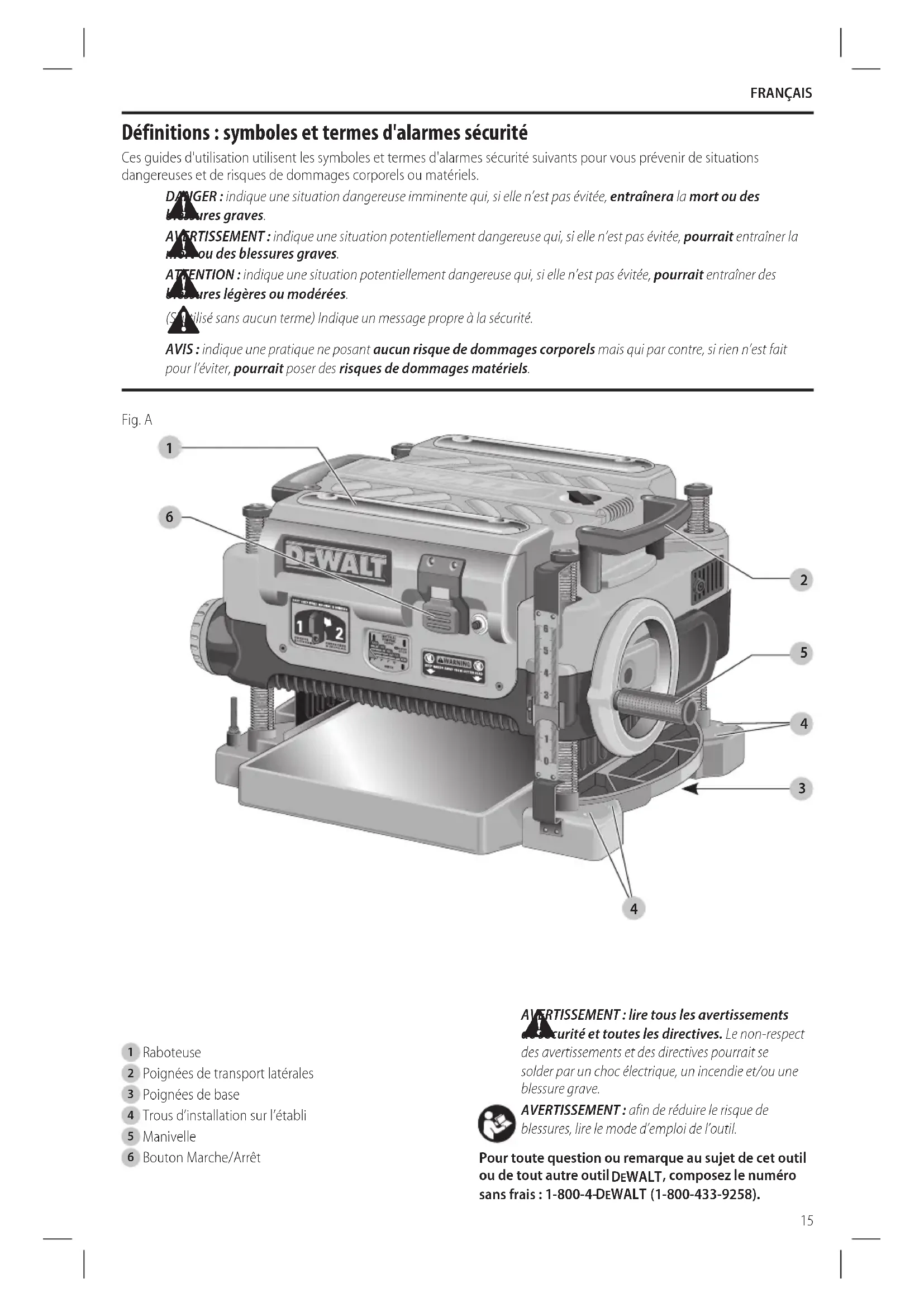 blessures, lire le mode d’emploi del’outil. Pour toute question ou remarque au sujet de cet outil ou de tout autre outil DeWALT , composez le numéro sans frais : 1-800-4- DeWALT (1-800-433-9258). Français (traduction de la notice d’instructions originale) Fig. A