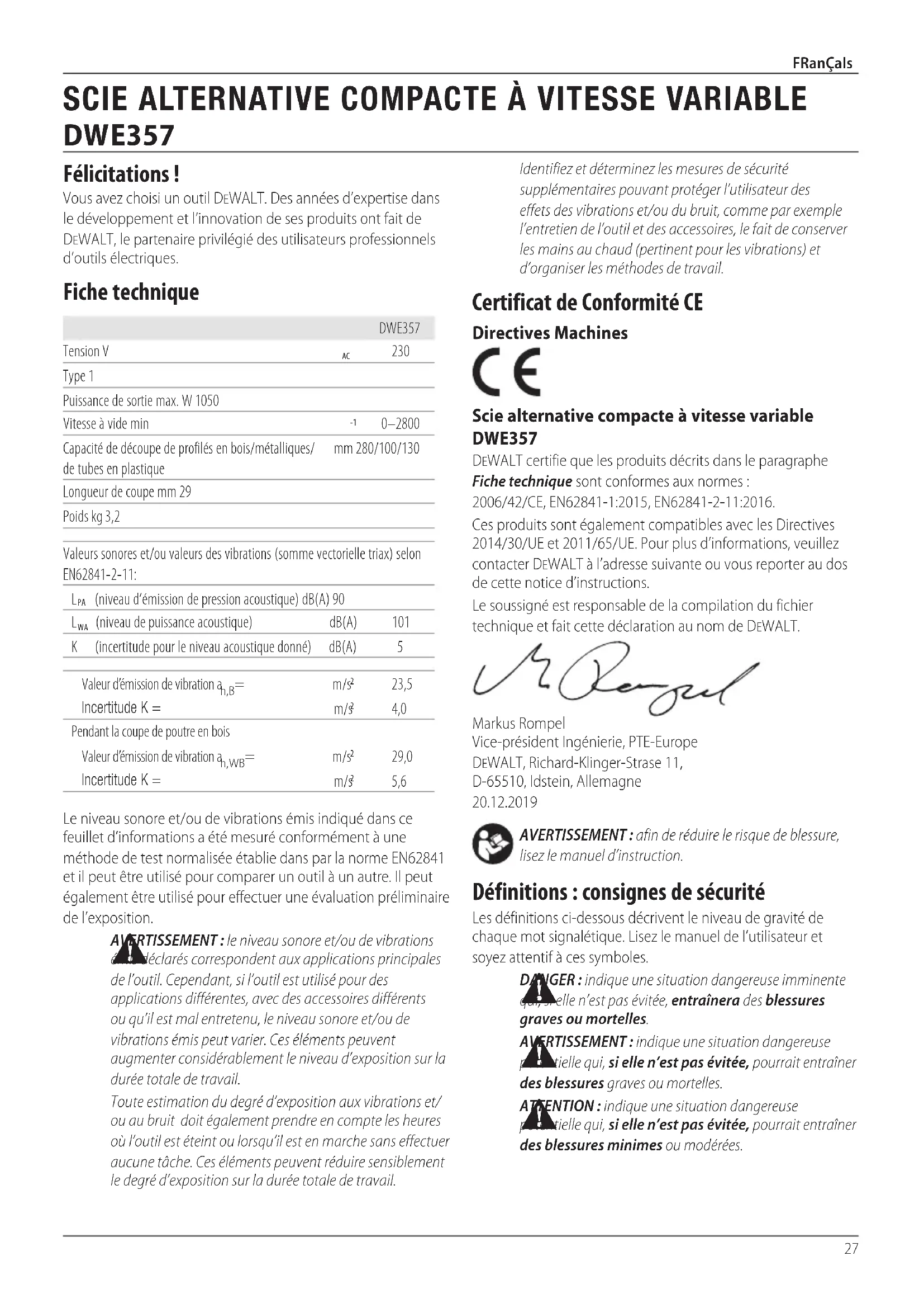 ADVERTENCIA: Para disminuir el riesgo de lesiones personales graves, apague la herramienta y desconéctela de la fuente de alimentación antes de realizar ajuste alguno o de poner o quitar acoplamientos o accesorios. La puesta en marcha accidental puede causarlesiones. Corte de metal (Fig.I) Su sierra cuenta con distintas capacidades de corte de metal en función del tipo de cuchilla utilizada y del metal a cortar. Utilice una cuchilla más fina para metales férricosy una cuchilla gruesa para los metales no férricos. En los metales de hojas finas, es mejor fijar la madera en ambos lados de la hoja. Esto garantizará un corte limpio sin demasiadas vibraciones o desgaste del metal. Recuerde siempre que no deberá forzar la cuchilla de corte, ya que reducirá la vida de la cuchilla y provocará una rotura costosa de lamisma. NOTA: Normalmente, se suele aconsejar que al cortar metales, deberá colocar una capa fina de aceite u otro lubricante junto a la línea del corte de la sierra para facilitar su funcionamiento y favorecer una mayor duración de lacuchilla. la cuchilla se aproxime a la superficie de trabajo (posición 1, Fig.H). Ahora, encienda el motor y deje que la sierra aumente su velocidad. Agarre la sierra firmemente con ambas manos y empiece a cortar lentamente, de forma deliberada hacia delante, con la empuñadura de la sierra, manteniendo el botón del pie firmemente en contacto con la pieza de trabajo (posición2, Fig. H). La cuchilla empezará a introducirse en el material. Compruebe siempre que la cuchilla atraviesa todo el material antes de seguir con el corte debolsillo. NOTA: En las zonas en donde la visibilidad de la cuchilla es limitada, utilice el borde del pie de la sierra como guía. Las líneas de cualquier corte determinado deberán ampliarse por encima del borde del corte arealizar.27 FRançaIsAVERTISSEMENT: afin de réduire le risque de blessure, lisez le manuel d’instruction. Définitions : consignes de sécurité Les définitions ci-dessous décrivent le niveau de gravité de chaque mot signalétique. Lisez le manuel de l’utilisateur et soyez attentif à cessymboles. DANGER : indique une situation dangereuse imminente qui, si elle n’est pas évitée, entraînera des blessures graves oumortelles. AVERTISSEMENT : indique une situation dangereuse potentielle qui, si elle n’est pas évitée, pourrait entraîner des blessures graves oumortelles. ATTENTION : indique une situation dangereuse potentielle qui, si elle n’est pas évitée, pourrait entraîner des blessures minimes oumodérées. Certificat de Conformité CE Directives Machines Scie alternative compacte à vitesse variable DWE357 DeWALT certifie que les produits décrits dans le paragraphe Fiche technique sont conformes aux normes: 2006/42/CE, EN62841-1:2015, EN62841-2-11:2016.Ces produits sont également compatibles avec les Directives 2014/30/UE et 2011/65/UE. Pour plus d’informations, veuillez contacter DeWALT à l’adresse suivante ou vous reporter au dos de cette notice d’instructions.Le soussigné est responsable de la compilation du fichier technique et fait cette déclaration au nom deDeWALT.Markus Rompel Vice-président Ingénierie, PTE-Europe DeWALT, Richard-Klinger-Strase 11, D-65510, Idstein, Allemagne 20.12.2019Identifiez et déterminez les mesures de sécurité supplémentaires pouvant protéger l’utilisateur des effets des vibrations et/ou du bruit, comme par exemple l’entretien de l’outil et des accessoires, le fait de conserver les mains au chaud (pertinent pour les vibrations) et d’organiser les méthodes detravail.Le niveau sonore et/ou de vibrations émis indiqué dans ce feuillet d’informations a été mesuré conformément à une méthode de test normalisée établie dans par la norme EN62841 et il peut être utilisé pour comparer un outil à un autre. Il peut également être utilisé pour effectuer une évaluation préliminaire de l’exposition. AVERTISSEMENT: le niveau sonore et/ou de vibrations émis déclarés correspondent aux applications principales de l’outil. Cependant, si l’outil est utilisé pour des applications différentes, avec des accessoires différents ou qu’il est mal entretenu, le niveau sonore et/ou de vibrations émis peut varier. Ces éléments peuvent augmenter considérablement le niveau d’exposition sur la durée totale detravail.Toute estimation du degré d’exposition aux vibrations et/ou au bruit doit également prendre en compte les heures où l’outil est éteint ou lorsqu’il est en marche sans effectuer aucune tâche. Ces éléments peuvent réduire sensiblement le degré d’exposition sur la durée totale detravail.DWE357Tension V