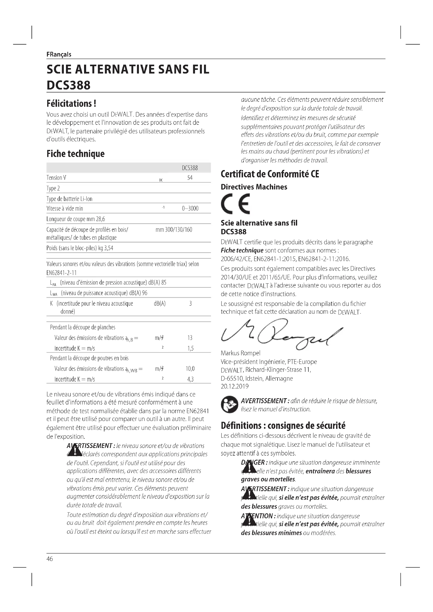 ATTENTION : indique une situation dangereuse potentielle qui, si elle n’est pas évitée, pourrait entraîner des blessures minimes oumodérées. Certificat de Conformité CE Directives Machines Scie alternative sans fil DCS388 DeWALT certifie que les produits décrits dans le paragraphe Fiche technique sont conformes aux normes: 2006/42/CE, EN62841-1:2015, EN62841-2-11:2016. Ces produits sont également compatibles avec les Directives 2014/30/UE et 2011/65/UE. Pour plus d’informations, veuillez contacter DeWALT à l’adresse suivante ou vous reporter au dos de cette notice d’instructions. Le soussigné est responsable de la compilation du fichier technique et fait cette déclaration au nom de DeWALT