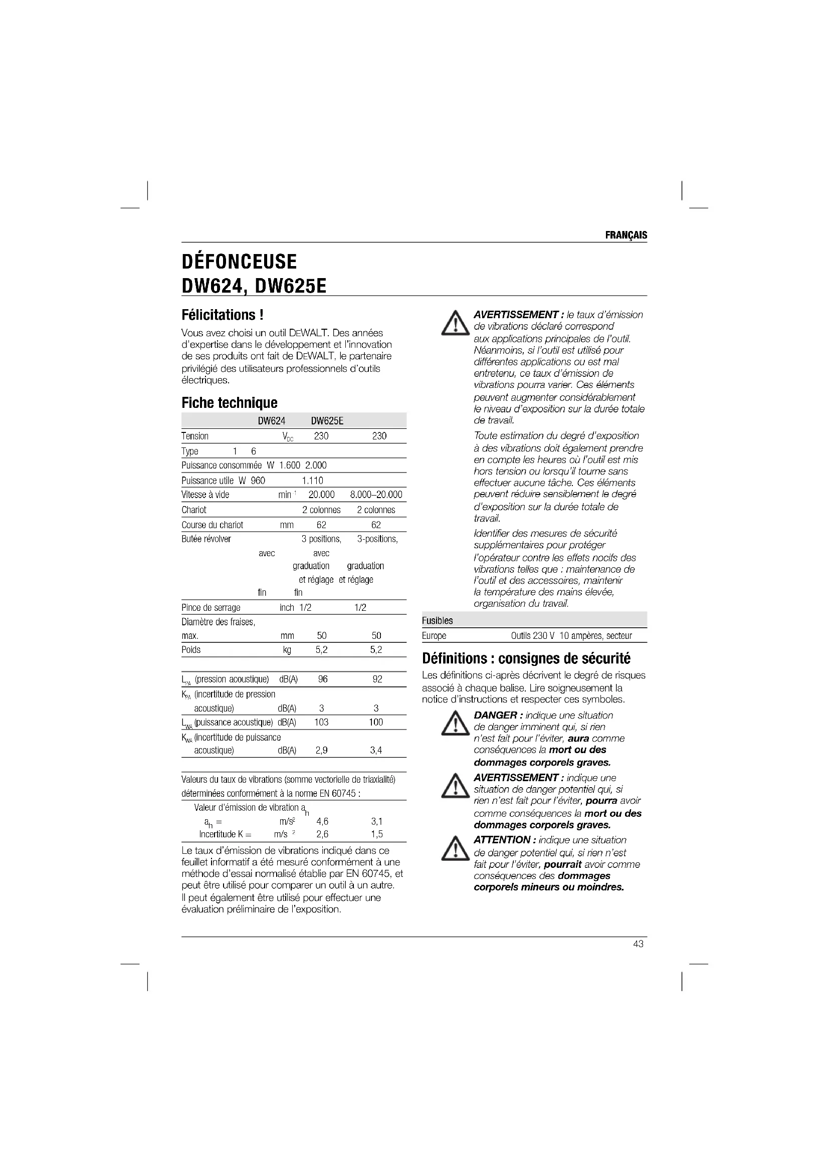 DÉFONCEUSE DW624, DW625E Félicitations ! Vous avez choisi un outil DEWALT. Des années d’expertise dans le développement et l’innovation de ses produits ont fait de DEWALT, le partenaire privilégié des utilisateurs professionnels d’outils électriques. Fiche technique DW624 DW625E Tension V