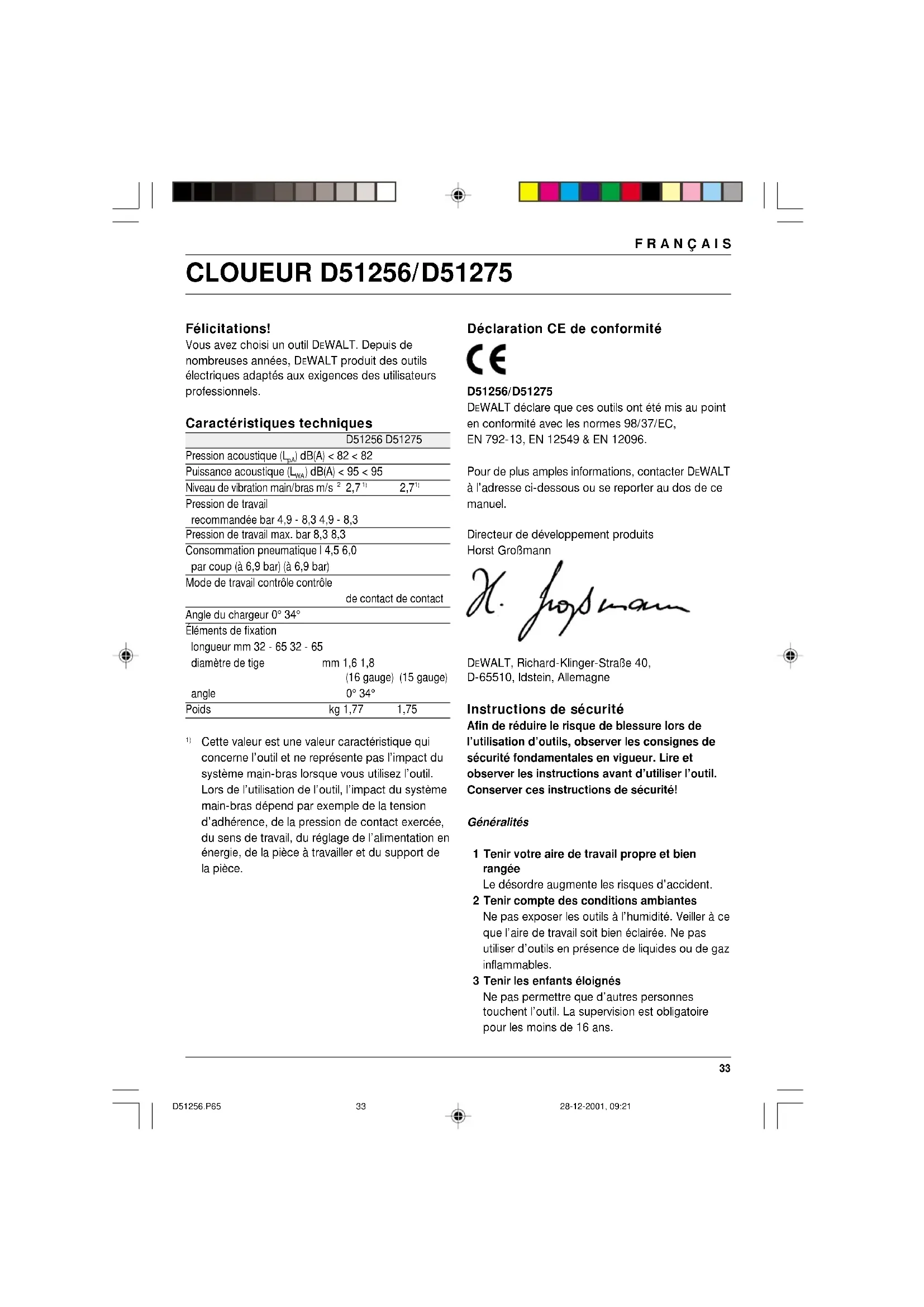 Cette valeur est une valeur caractéristique qui concerne l’outil et ne représente pas l’impact du système main-bras lorsque vous utilisez l’outil. Lors de l’utilisation de l’outil, l’impact du système main-bras dépend par exemple de la tension d’adhérence, de la pression de contact exercée, du sens de travail, du réglage de l’alimentation en énergie, de la pièce à travailler et du support de la pièce. Déclaration CE de conformité D51256/D51275 DEWALT déclare que ces outils ont été mis au point en conformité avec les normes 98/37/EC, EN 792-13, EN 12549 & EN 12096. Pour de plus amples informations, contacter DEWALT à l’adresse ci-dessous ou se reporter au dos de ce manuel. Directeur de développement produits Horst Großmann DEWALT, Richard-Klinger-Straße 40, D-65510, Idstein, Allemagne Instructions de sécurité Afin de réduire le risque de blessure lors de l’utilisation d’outils, observer les consignes de sécurité fondamentales en vigueur. Lire et observer les instructions avant d’utiliser l’outil. Conserver ces instructions de sécurité! Généralités 1 Tenir votre aire de travail propre et bien rangée Le désordre augmente les risques d’accident. 2 Tenir compte des conditions ambiantes Ne pas exposer les outils à l’humidité. Veiller à ce que l’aire de travail soit bien éclairée. Ne pas utiliser d’outils en présence de liquides ou de gaz inflammables. 3 Tenir les enfants éloignés Ne pas permettre que d’autres personnes touchent l’outil. La supervision est obligatoire pour les moins de 16 ans. D51256.P65 28-12-2001, 09:213334 FRANÇAIS 4 Ranger vos outils dans un endroit sûr Ranger les outils non utilisés dans un endroit sec, fermé à clé et hors de la portée des enfants. 5 Porter des vêtements de travail appropriés Ne pas porter de vêtements flottants ou de bijoux. Ils pourraient être happés par les pièces en mouvement. Lors de travaux à l’extérieur, il est recommandé de porter des gants en caoutchouc et des chaussures à semelle anti- dérapante. Le cas échéant, porter une garniture convenable retenant les cheveux longs. 6 Adopter une position confortable Toujours tenir les deux pieds à terre et garder l’équilibre. 7 Faire preuve de vigilance Observer votre travail. Faire preuve de bon sens. Ne pas employer l’outil en cas de fatigue. 8 Utiliser l’outil adéquat Le domaine d’utilisation de l’outil est décrit dans le présent manuel. Ne pas utiliser d’outils ou d’accessoires de trop faible puissance pour exécuter des travaux lourds. Ne pas utiliser des outils à des fins et pour des travaux pour lesquels ils n’ont pas été conçus. Attention! L’utilisation d’accessoires autres que ceux recommandés dans le présent manuel pourrait entraîner un risque de blessure. Utiliser l’outil conformément à sa destination. 9 Entretenir vos outils avec soin Maintenir vos outils affûtés et propres afin de travailler mieux et plus sûrement. Observer les instructions d’entretien et de changement d’accessoires. Maintenir les poignées sèches et exemptes d’huile et de graisse. 10 Contrôler si votre outil est endommagé Avant d’utiliser l’outil, vérifier qu’il n’est pas endommagé. Pour cela, contrôler l’alignement des pièces en mouvement et leur grippage éventuel. Tous les composants doivent être montés correctement et remplir les conditions pour garantir le fonctionnement impeccable de l’outil. Faire réparer ou échanger tout dispositif de sécurité et toute pièce endommagée conformément aux instructions. 11 Faire réparer votre outil par un Service agréé DEWALT Cet outil est conforme aux consignes de sécurité en vigueur. La réparation des outils est strictement réservée aux personnes qualifiées. Consignes de sécurité supplémentaires pour les cloueurs pneumatiques
