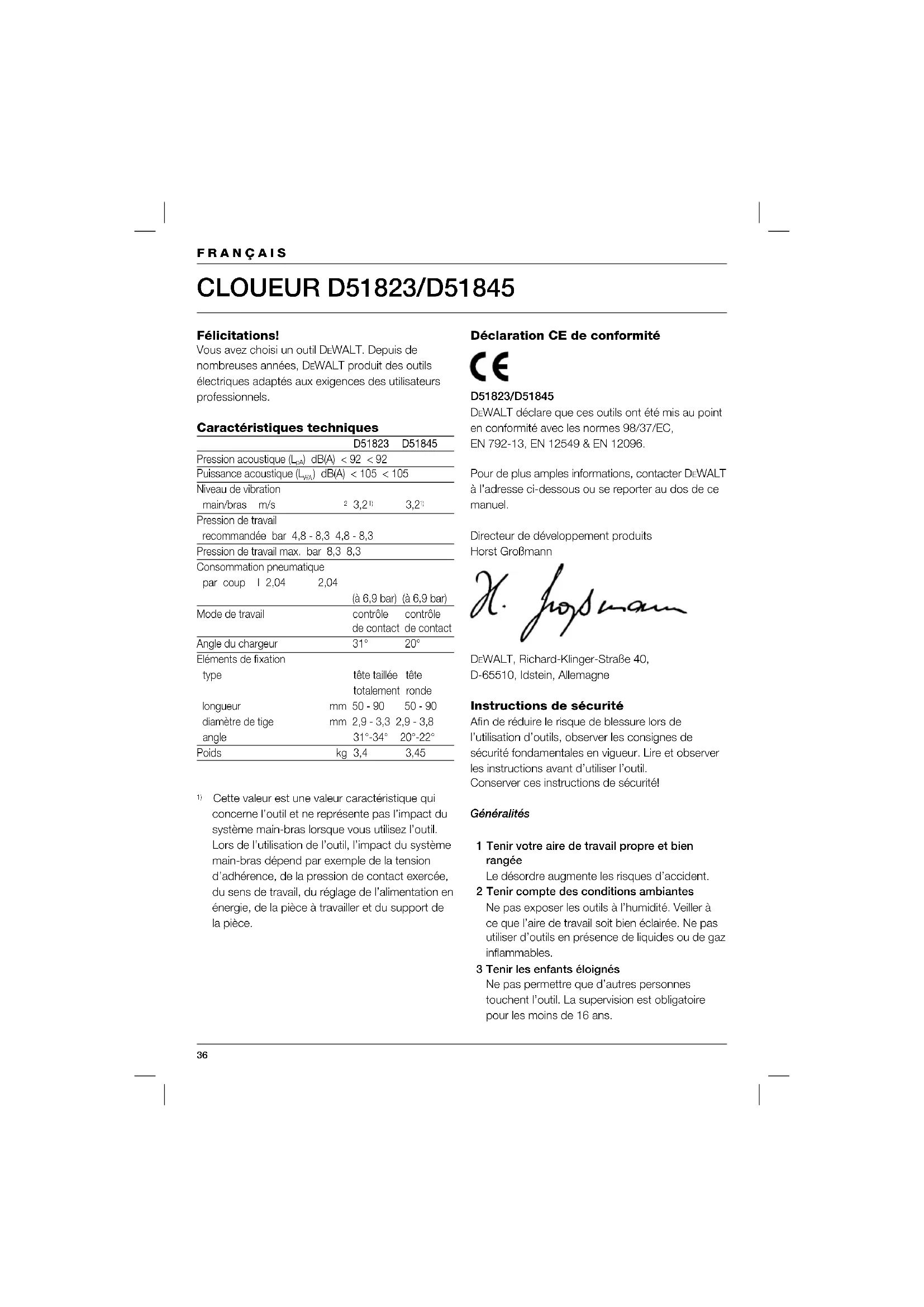 Cette valeur est une valeur caractéristique qui concerne l’outil et ne représente pas l’impact du système main-bras lorsque vous utilisez l’outil. Lors de l’utilisation de l’outil, l’impact du système main-bras dépend par exemple de la tension d’adhérence, de la pression de contact exercée, du sens de travail, du réglage de l’alimentation en énergie, de la pièce à travailler et du support de la pièce. Déclaration CE de conformité D51823/D51845 DEWALT déclare que ces outils ont été mis au point en conformité avec les normes 98/37/EC, EN 792-13, EN 12549 & EN 12096. Pour de plus amples informations, contacter DEWALT à l’adresse ci-dessous ou se reporter au dos de ce manuel. Directeur de développement produits Horst Großmann DEWALT, Richard-Klinger-Straße 40, D-65510, Idstein, Allemagne Instructions de sécurité Afi n de réduire le risque de blessure lors de l’utilisation d’outils, observer les consignes de sécurité fondamentales en vigueur. Lire et observer les instructions avant d’utiliser l’outil. Conserver ces instructions de sécurité! Généralités 1 Tenir votre aire de travail propre et bien rangée Le désordre augmente les risques d’accident. 2 Tenir compte des conditions ambiantes Ne pas exposer les outils à l’humidité. Veiller à ce que l’aire de travail soit bien éclairée. Ne pas utiliser d’outils en présence de liquides ou de gaz infl ammables. 3 Tenir les enfants éloignés Ne pas permettre que d’autres personnes touchent l’outil. La supervision est obligatoire pour les moins de 16 ans.37 FRANÇAIS 4 Ranger vos outils dans un endroit sûr Ranger les outils non utilisés dans un endroit sec, fermé à clé et hors de la portée des enfants. 5 Porter des vêtements de travail appropriés Ne pas porter de vêtements fl ottants ou de bijoux. Ils pourraient être happés par les pièces en mouvement. Lors de travaux à l’extérieur, il est recommandé de porter des gants en caoutchouc et des chaussures à semelle anti- dérapante. Le cas échéant, porter une garniture convenable retenant les cheveux longs. 6 Adopter une position confortable Toujours tenir les deux pieds à terre et garder l’équilibre. 7 Faire preuve de vigilance Observer votre travail. Faire preuve de bon sens. Ne pas employer l’outil en cas de fatigue. 8 Utiliser l’outil adéquat Le domaine d’utilisation de l’outil est décrit dans le présent manuel. Ne pas utiliser d’outils ou d’accessoires de trop faible puissance pour exécuter des travaux lourds. Ne pas utiliser des outils à des fi ns et pour des travaux pour lesquels ils n’ont pas été conçus. Attention! L’utilisation d’accessoires autres que ceux recommandés dans le présent manuel pourrait entraîner un risque de blessure. Utiliser l’outil conformément à sa destination. 9 Entretenir vos outils avec soin Maintenir vos outils affûtés et propres afi n de travailler mieux et plus sûrement. Observer les instructions d’entretien et de changement d’accessoires. Maintenir les poignées sèches et exemptes d’huile et de graisse. 10 Contrôler si votre outil est endommagé Avant d’utiliser l’outil, vérifi er qu’il n’est pas endommagé. Pour cela, contrôler l’alignement des pièces en mouvement et leur grippage éventuel. Tous les composants doivent être montés correctement et remplir les conditions pour garantir le fonctionnement impeccable de l’outil. Faire réparer ou échanger tout dispositif de sécurité et toute pièce endommagée conformément aux instructions. 11 Faire réparer votre outil par un Service agréé