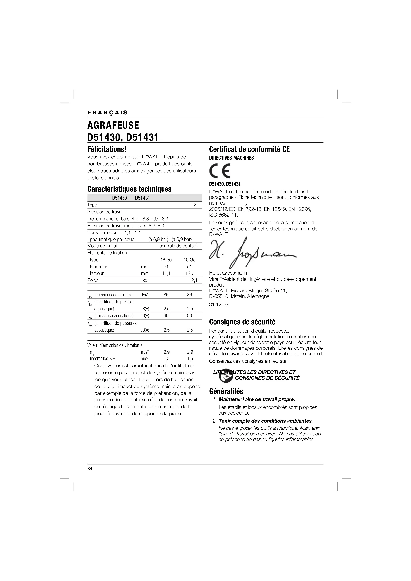 m/s² 2,9 2,9 Incertitude K = m/s² 1,5 1,5 Cette valeur est caractéristique de l’outil et ne représente pas l’impact du système main-bras lorsque vous utilisez l’outil. Lors de l’utilisation de l’outil, l’impact du système main-bras dépend par exemple de la force de préhension, de la pression de contact exercée, du sens de travail, du réglage de l’alimentation en énergie, de la pièce à ouvrer et du support de la pièce. Certifi cat de conformité CE DIRECTIVES MACHINES D51430, D51431