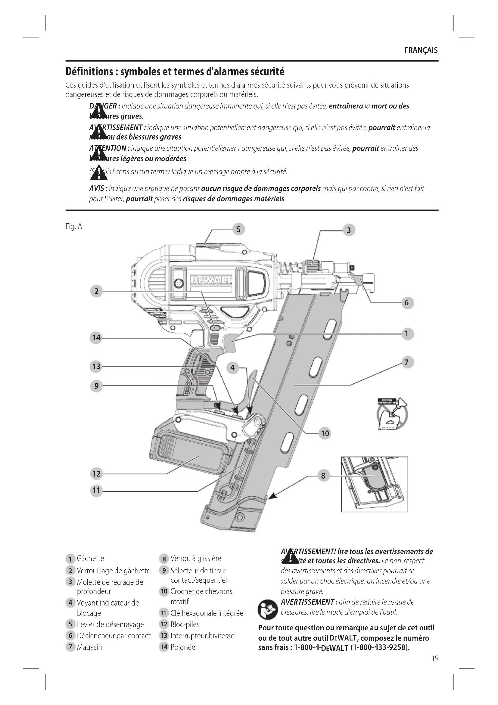 blessures, lire le mode d’emploi del’outil. Pour toute question ou remarque au sujet de cet outil ou de tout autre outil DeWALT , composez le numéro sans frais : 1-800-4- DeWALT (1-800-433-9258).