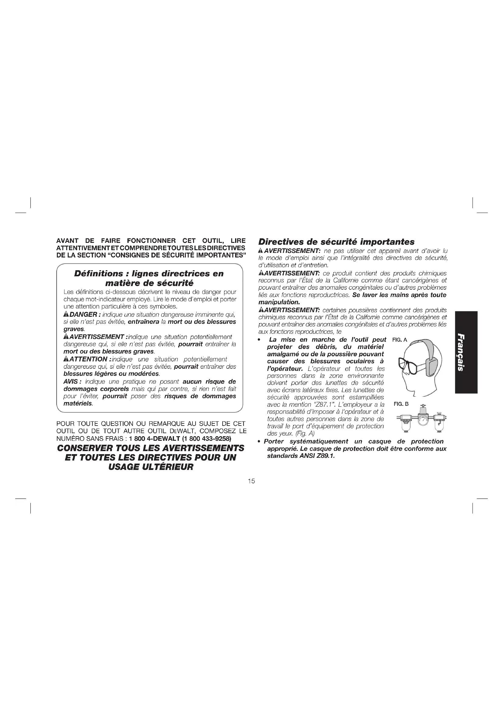 - La mise en marche de l’outil peut FIG. A FIG. B projeter des débris, du matériel amalgamé ou de la poussière pouvant causer des blessures oculaires à l’opérateur. L’opérateur et toutes les personnes dans la zone environnante doivent porter des lunettes de sécurité avec écrans latéraux fixes. Les lunettes de sécurité approuvées sont estampillées avec la mention “Z87.1”. L’employeur a la responsabilité d’imposer à l’opérateur et à toutes autres personnes dans la zone de travail le port d’équipement de protection des yeux. (Fig. A)